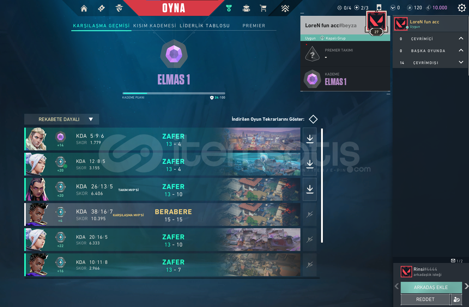 Hesapta skin yoktur.Hesap tamamen bana aittir.Hesapta hiç bir ban veya yasaklama yoktur.Hesabın güncel rankı Diamond 1 dir.Hesapta isim değiştirme mevcuttur. Siteden istediğiniz nicki koyabilirsiniz.