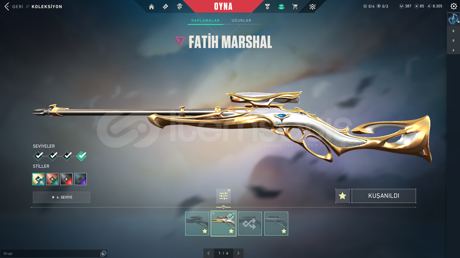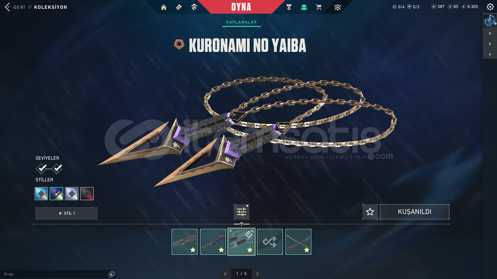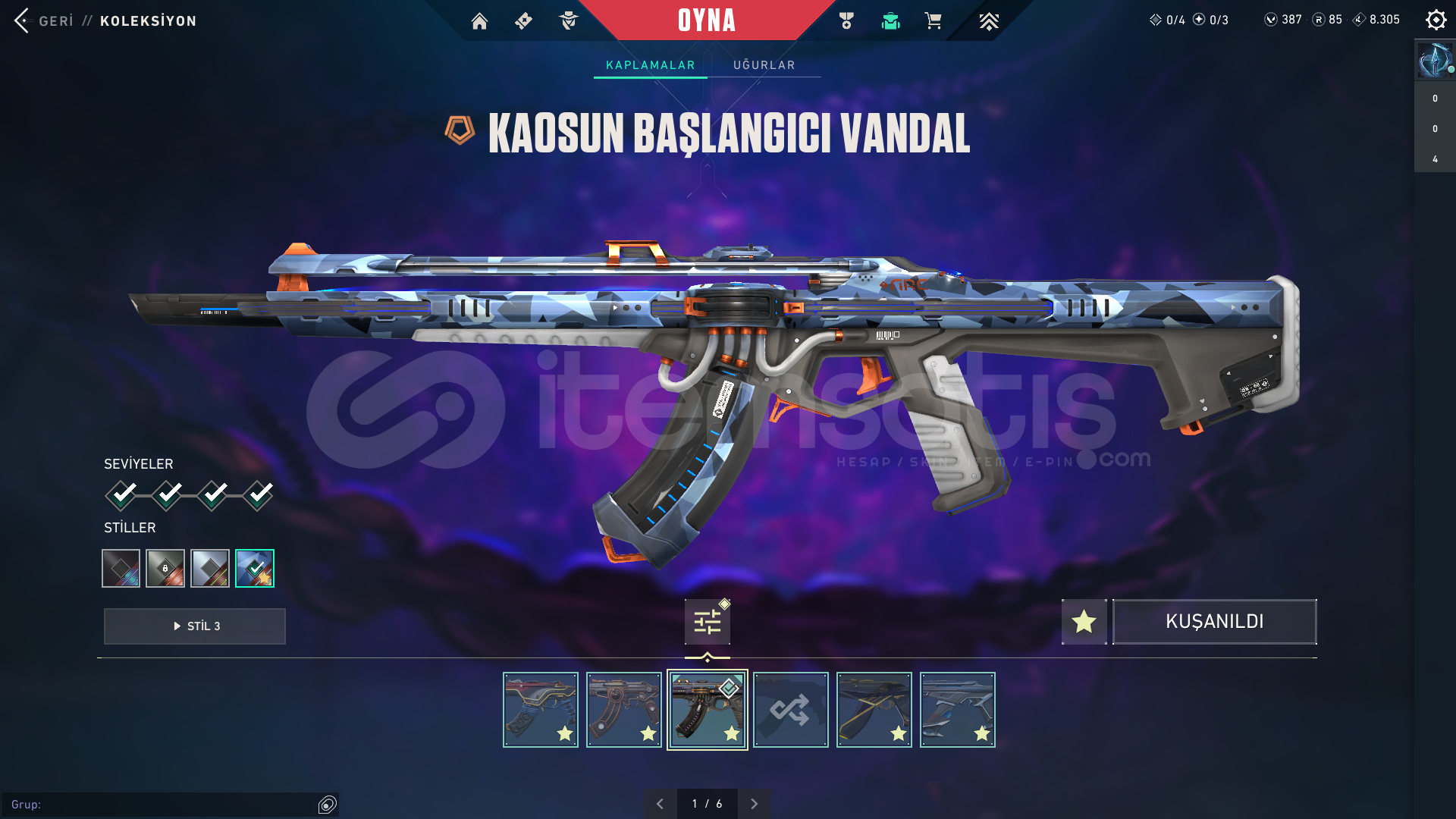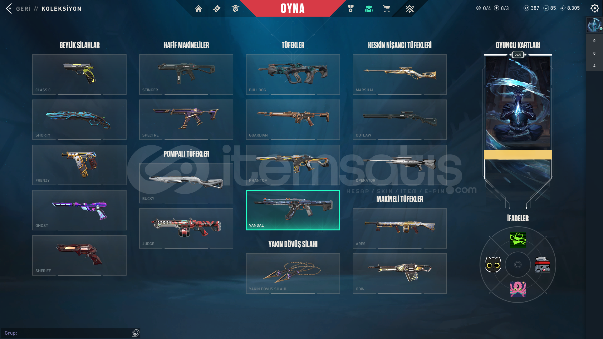 Vandal; Kaos , 2023 Champions , Kuronami , Oni Vandal , Sihirpunk Vandal Phantom ; Champions 2024 , Asil , Radiant , SihirpunkBıçak ; Kuronami , Zifiri , Oni Katana , SihirçakıSheriff ; Anomali , Kuronami , Seri Tetik Oparatör ; Yağmacı , Yıldız Belası Marshal ; Zifiri , Fatih , KuronamiClassic ; Asil , Zifiri Shorty ; GaiaSpectre ; Kuronami , Afet Judge ; Delipop Odin ; Asil Ghost ; Radiant Frenzy...