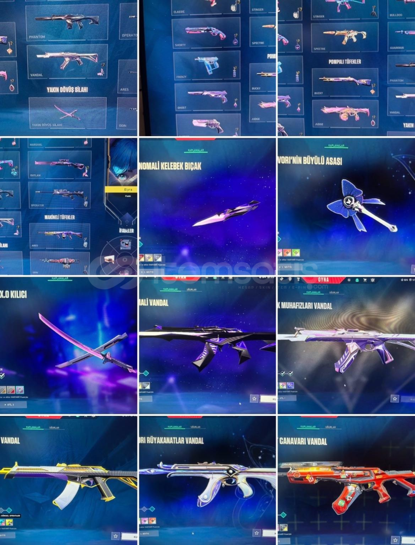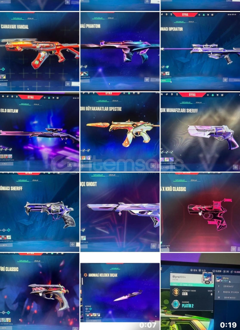 fotoğraf 3 den fazla ekleyemediğim için hesap içindeki skinleri yazıyorumiçinde 5k vp var tüm karakterler açık 155lvl plat2 hesap bıç: anomali kelebek exo kılıç evori asa vandal:  anomali vandal sürat canavarı vandal  ışık muhafızı vandal  evlori vandal asil vandal phantom: anomali phantom op:  yağmacı op outlaw: exo outlaw spectre: e...