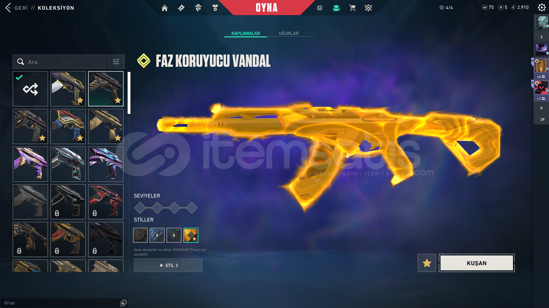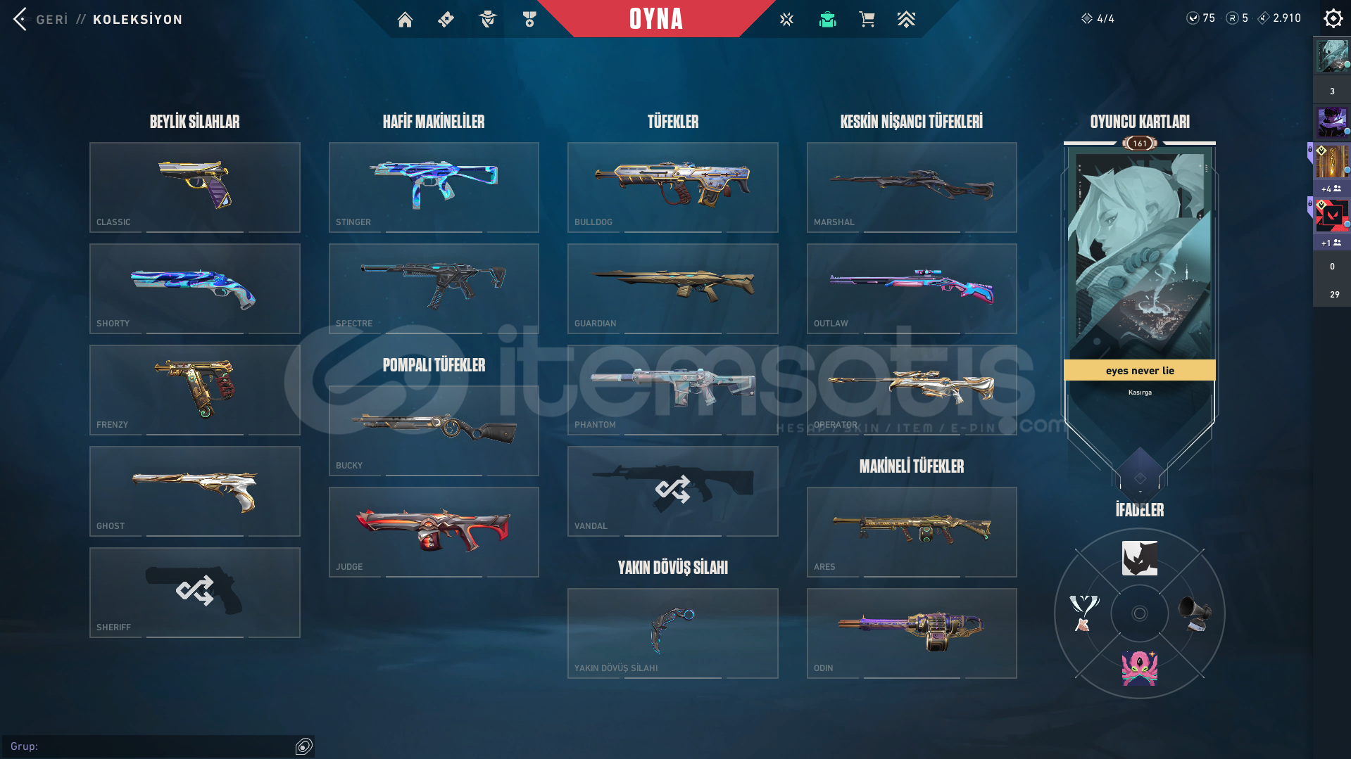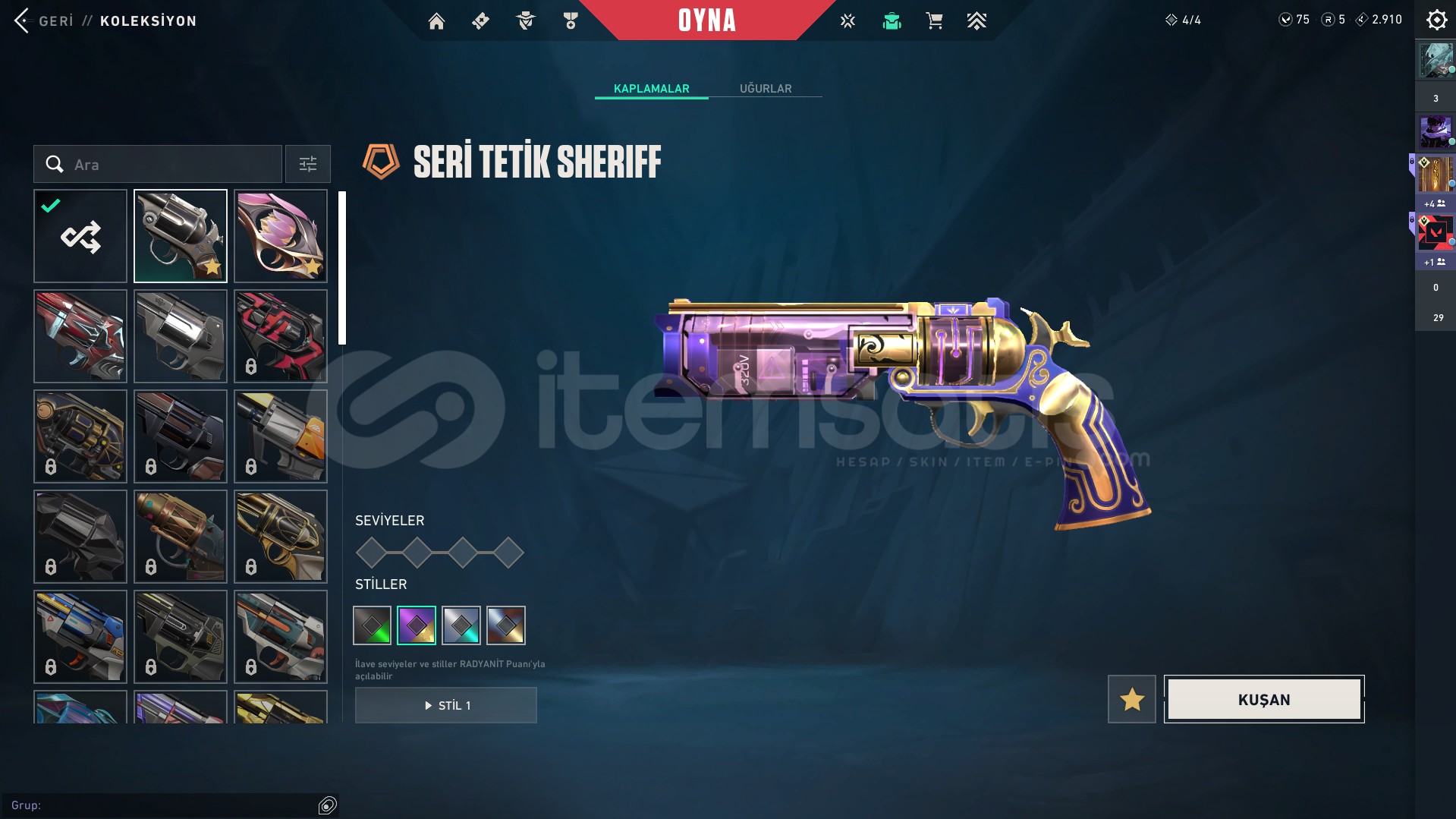 HESAP DOLUDUR NEREDEYSE HER SİLAĞINDA ANİMASYONLU SKİN VARDIR HESABIN İÇİNDEKİLER:ASİL CLASSİCONİ FRENZY FATİH GHOSTSIRÇİÇEĞİ SHERİFFSERİ TETİK SHERİFFRGX SPECTREKÖKEN BUCKYONİ BULLDOGYILDIZ BELASI GUARDİANASİL VANDALKAOS VANDALYILDIZ BELASI VANDALONİ VANDALFAZ KORUYUCU VANDALZİFİRİ MARSHALLYİTİK OPERATÖRONİ ARESSERİ TET&#...