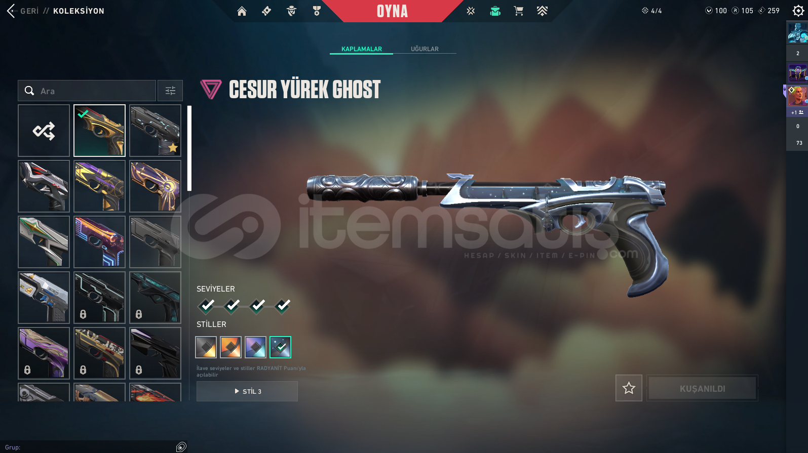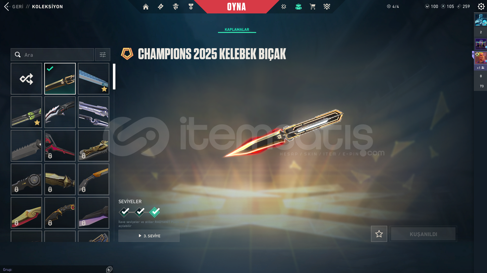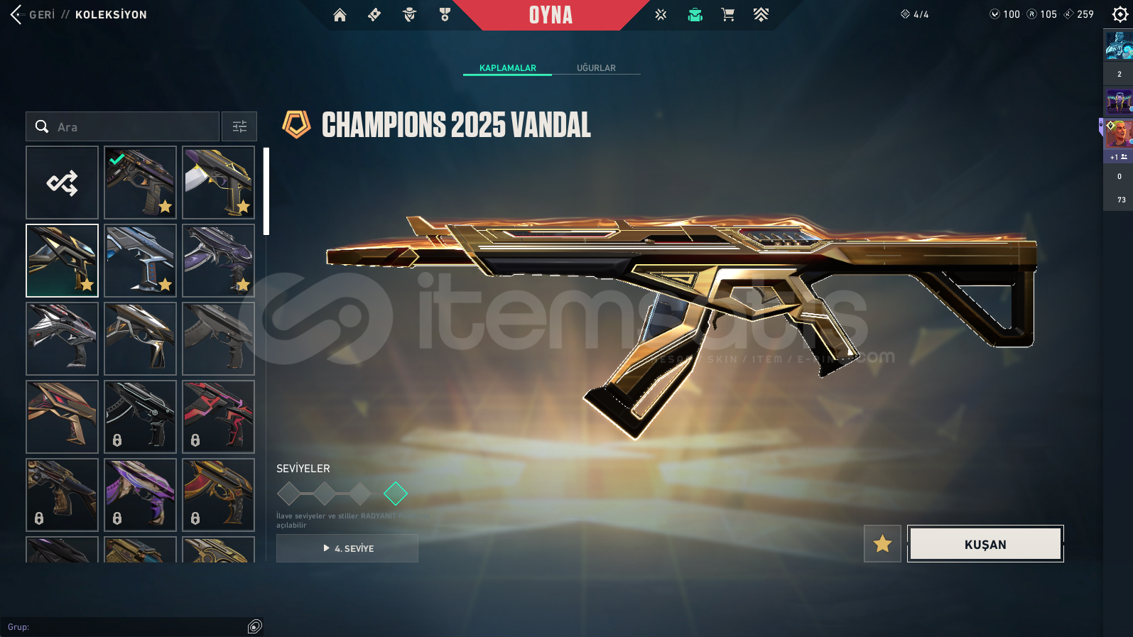 Ghostlar:Cesur Yürek Ghost-----------------Sheriffler:Anamoli SheriffSeri Tetik Sheriff-----------------Vandallar:Champions 2025 VandalAsil VandalKuronomi VandalUlupençe VandalIşık Muhafızları VandalKaos VandalYağmacı Vandal-----------------Phantomlar:Özel Harekat Phantomİyon Phantom-----------------Bıçaklar:Champions 2025 KelebekRGX KelebekDenge Yelpaze-----------------Odinler:Işık Muhafızı Odin-----------------...