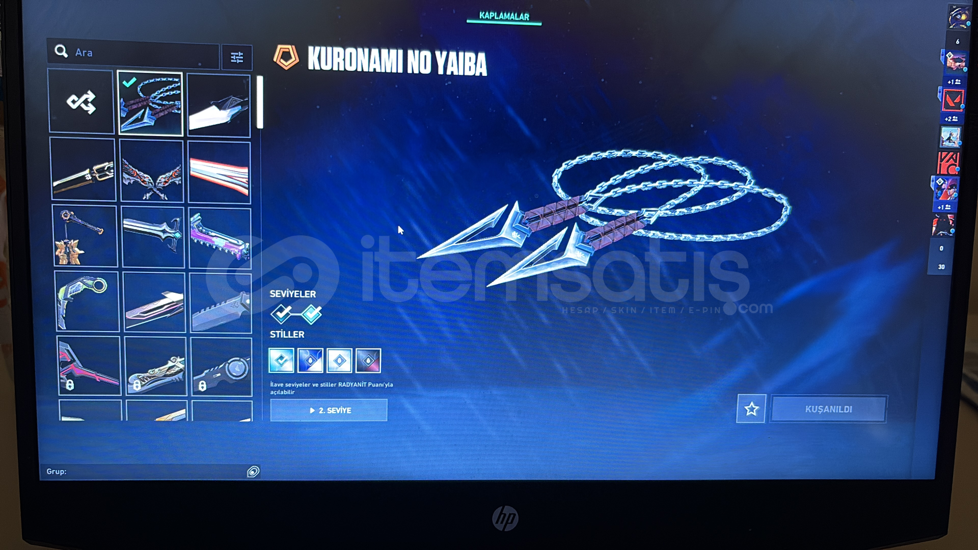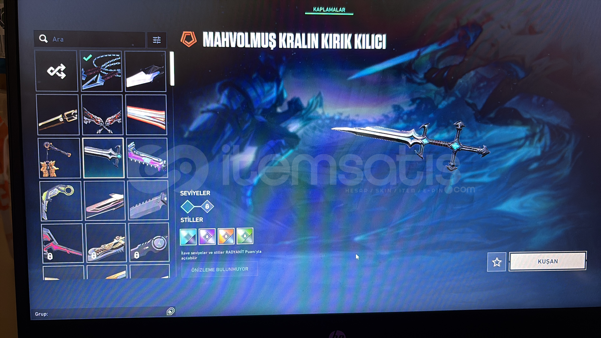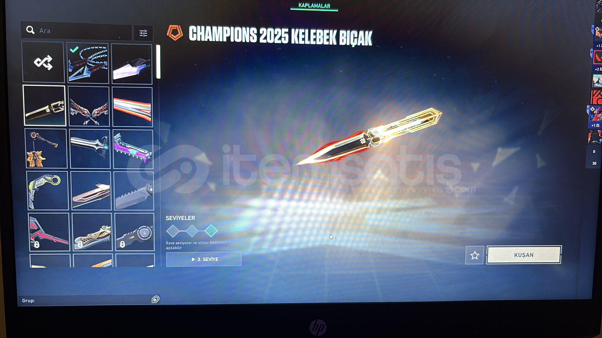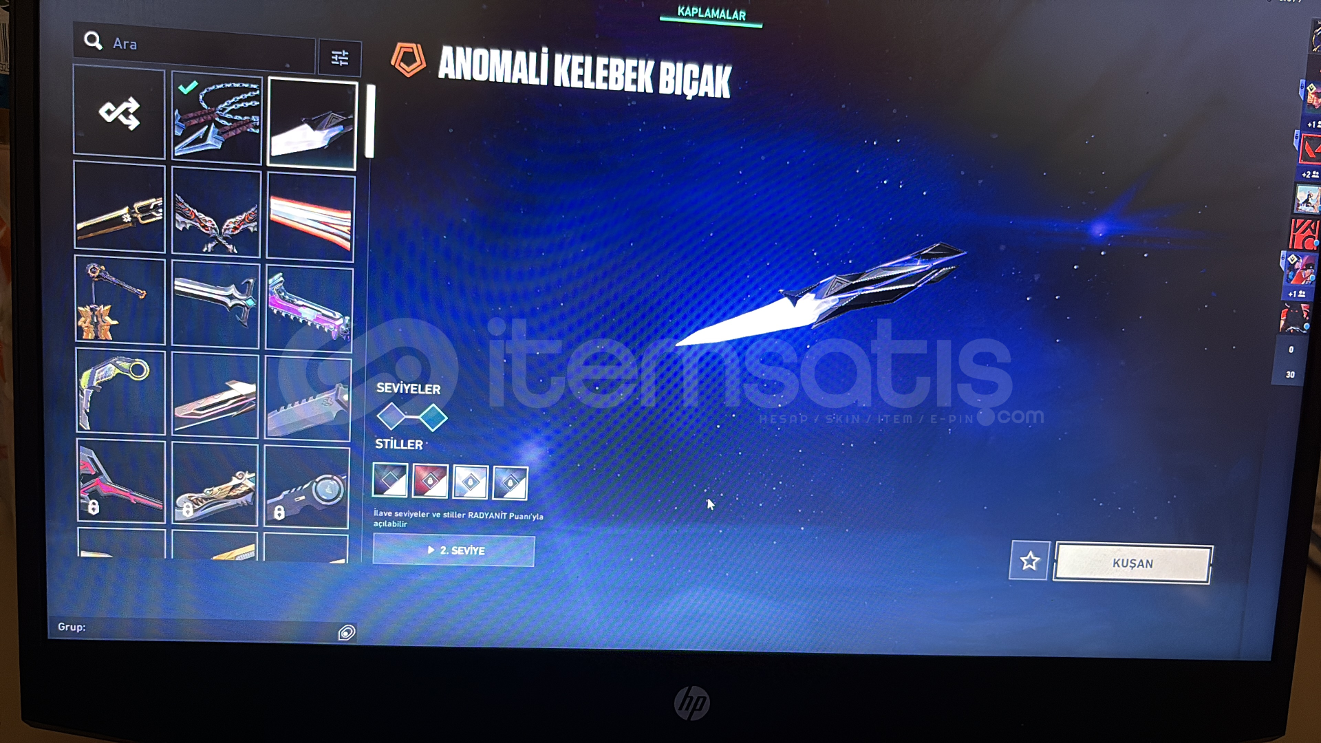 kuronami , ponçik ecel , ulupençe , felaketin bıçakları , rgx 11z karambit , kaos gürzü , mahvolmuş kralın kırık kılıcı , champions 25 kelebek , anomali kelebek bıçakları mevcut