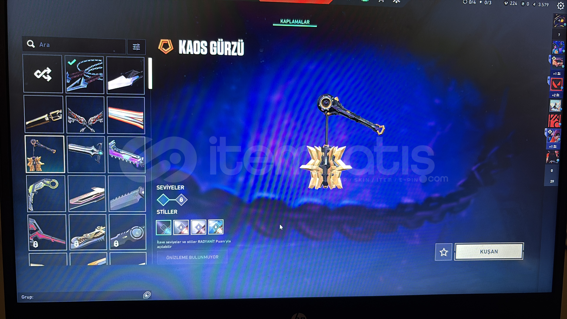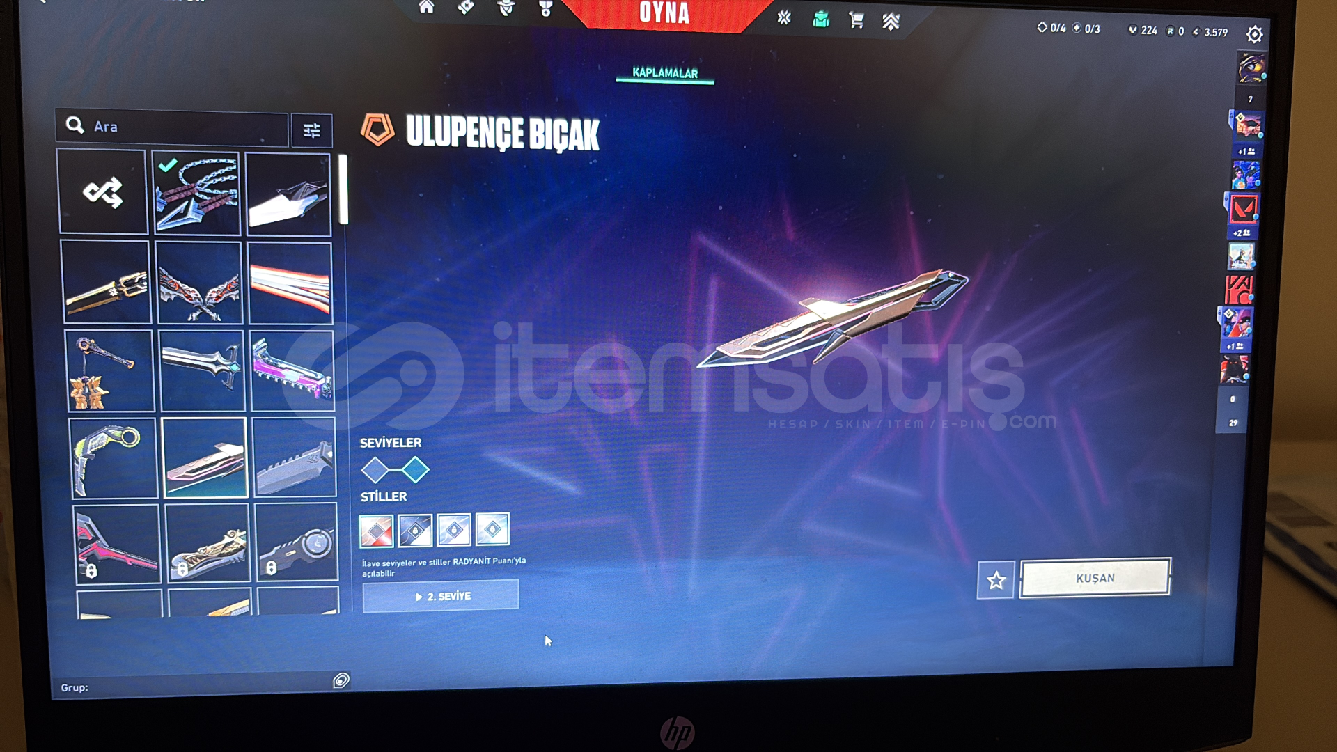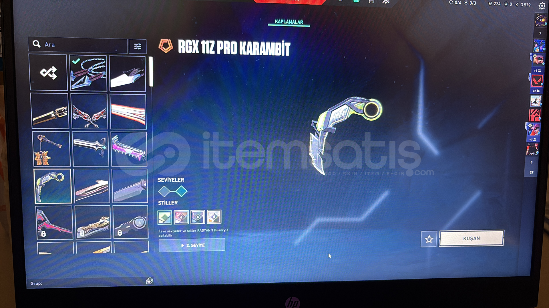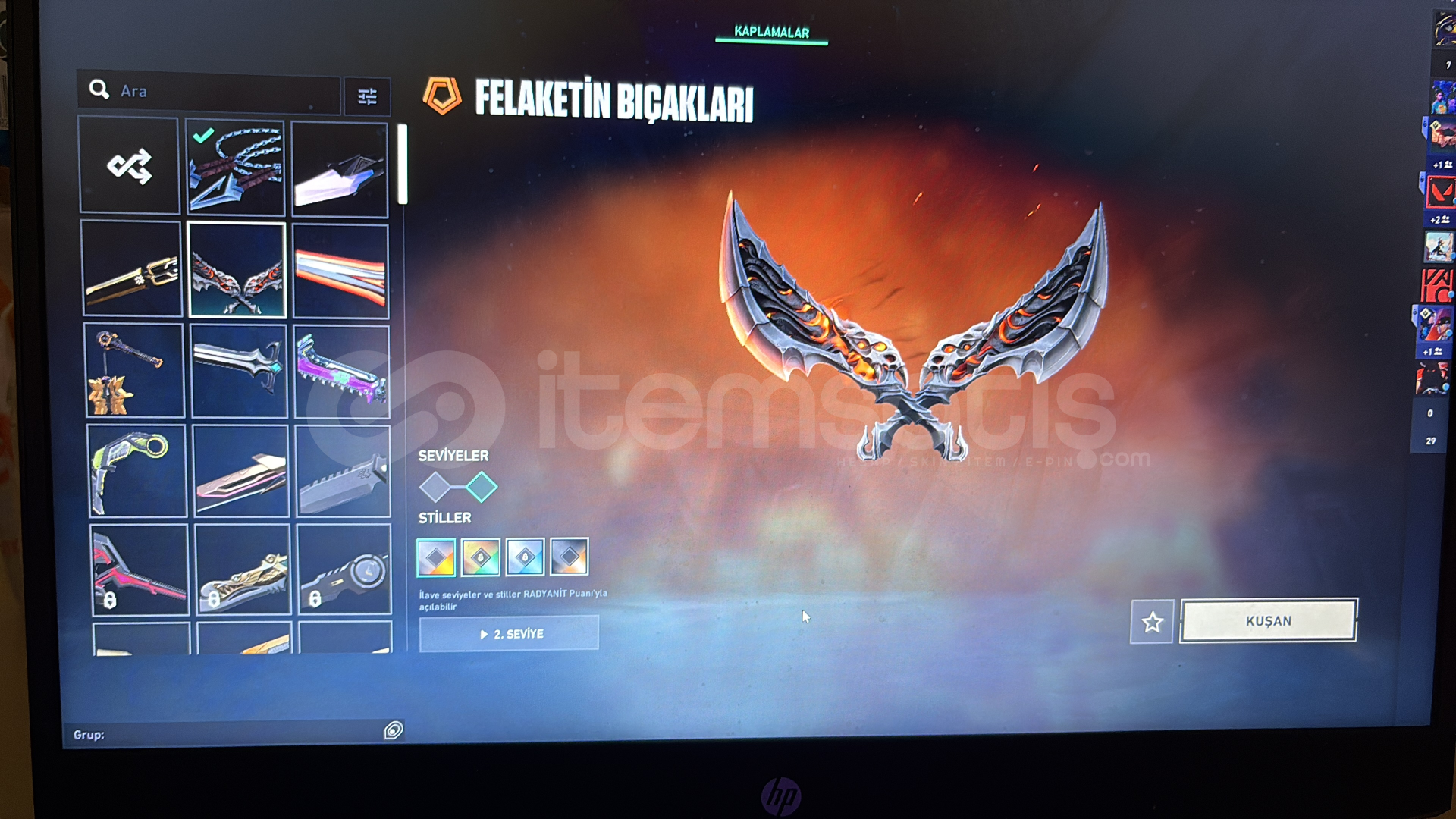 kuronami , ponçik ecel , ulupençe , felaketin bıçakları , rgx 11z karambit , kaos gürzü , mahvolmuş kralın kırık kılıcı , champions 25 kelebek , anomali kelebek bıçakları mevcut
