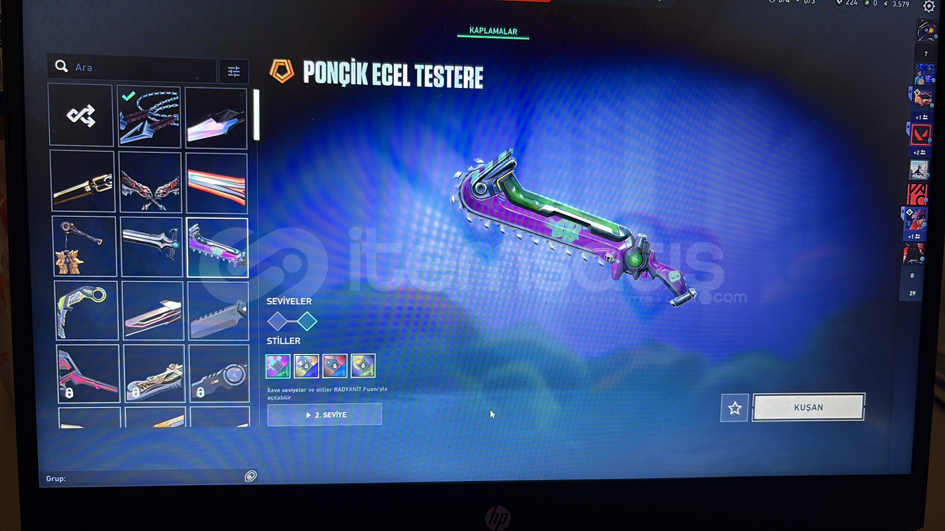 Hesapta nerdeyse tüm silahlarda değerli skinler açık herşeyiyle veriyorum.kuronami , champions vandalSpectrum guardian seri tetik marshalseri tetik odinoni aresspectrum classicafet , radiant ghostasil frenzyneptün shortykaos bulldogkaos , yitik spectrekaos , ışık muhafızı phantom Exo outlawkuronami , ponçik ecel , ulupençe , felaketin bıçakları , rgx 11z karambit , kaos gürzü , mahvolmuş kral&#...