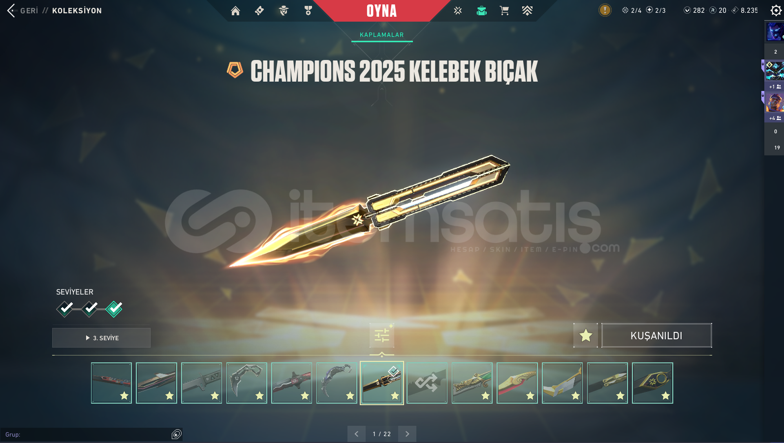 Bıçak Skinleri: Alaz Yelpaze , Asil Karambit , Champion Kelebek 2022 , Champion Kunai , Delipop Balta , Delipop Hançer , Gia 2.0 Bıçağı , Kuronami Bıçak , Oni Katana , RGX Karambit , Shirpunk Kelebek , Sürat Canavarı Katana ,Champion karambit Champion kelebek 2025