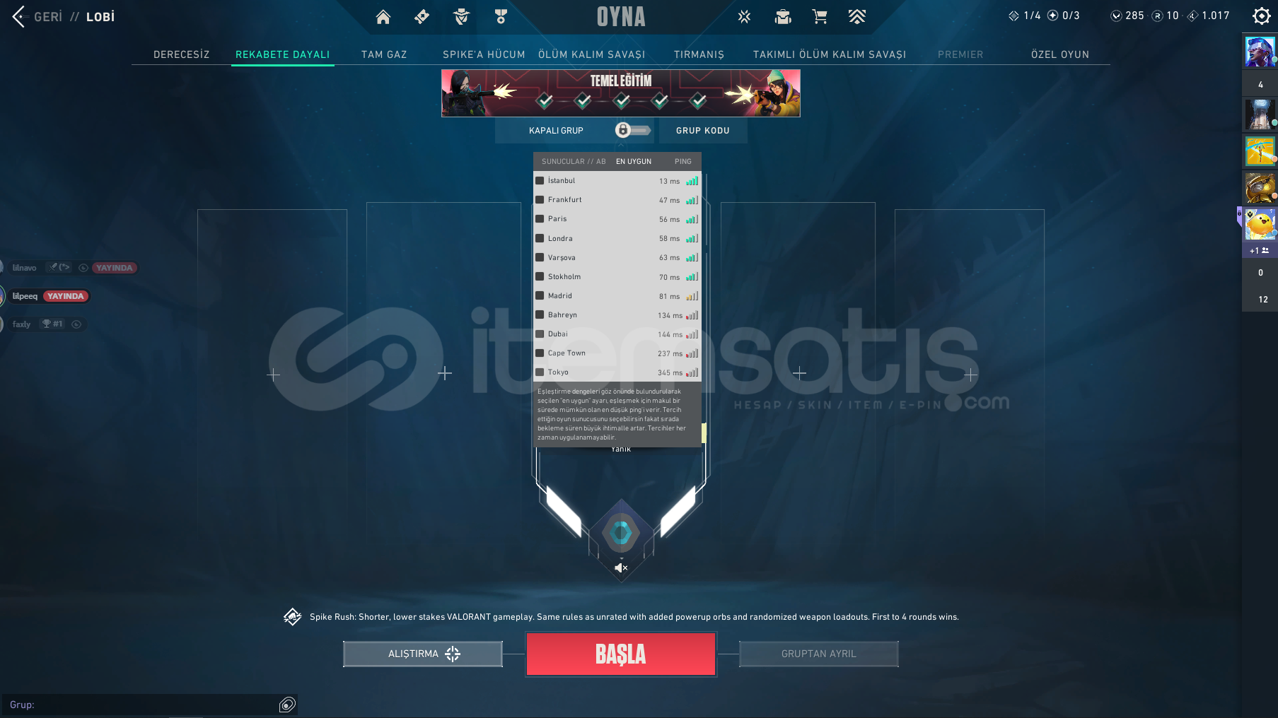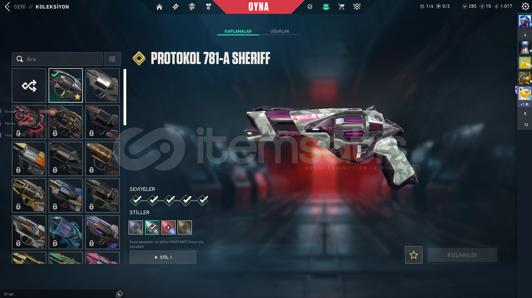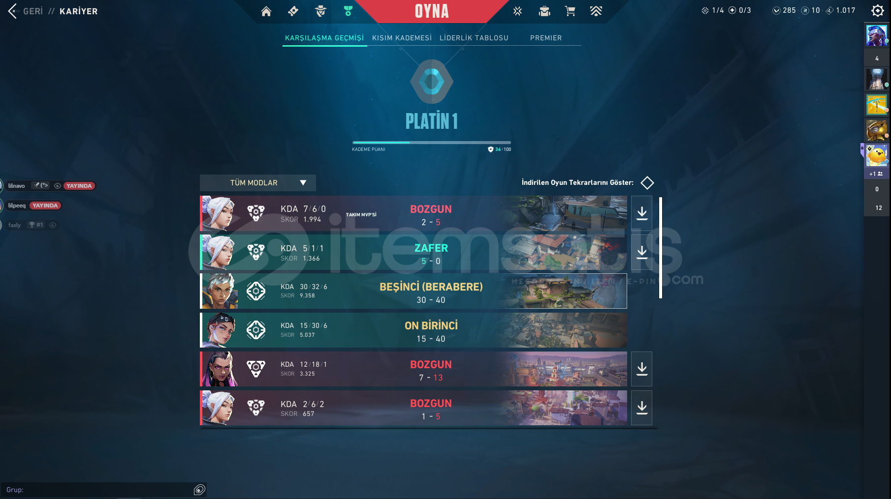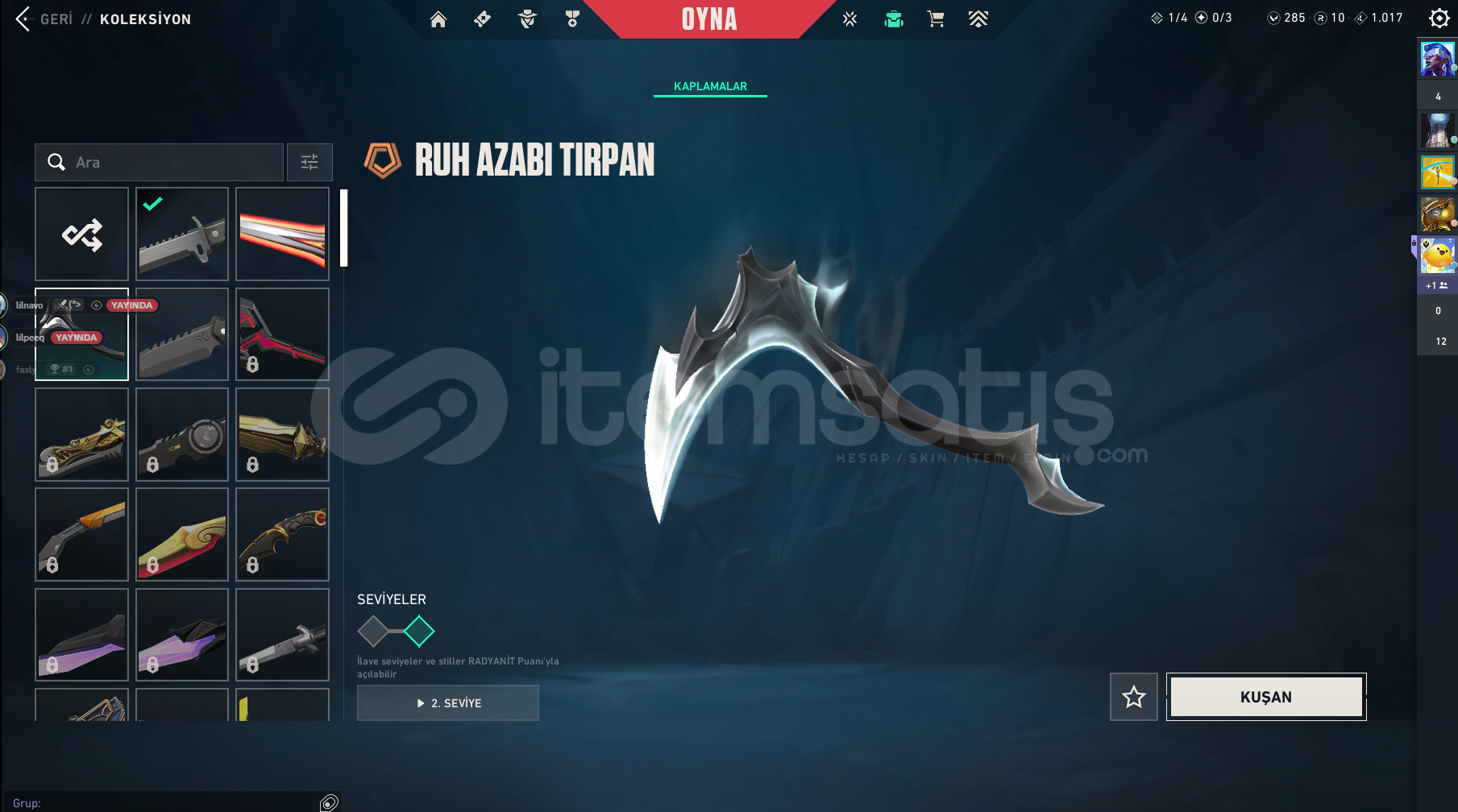 hesabın rankı plat 1 dir.leveli 55 leveldir hesapta 285 vp 10 radyanit vardır hesap tr serveridir ban mute vs. yoktur hesaptaki skinler;uzaylı avcısı bıçağıruh azabı tırpan 1 tane battle pass bıçağıoni vandalblastix phantomiyon operatörprotokol sherifve 1 bp fullenmiştir sıkıntısız sorunsuz alanına hayırlı olsun
