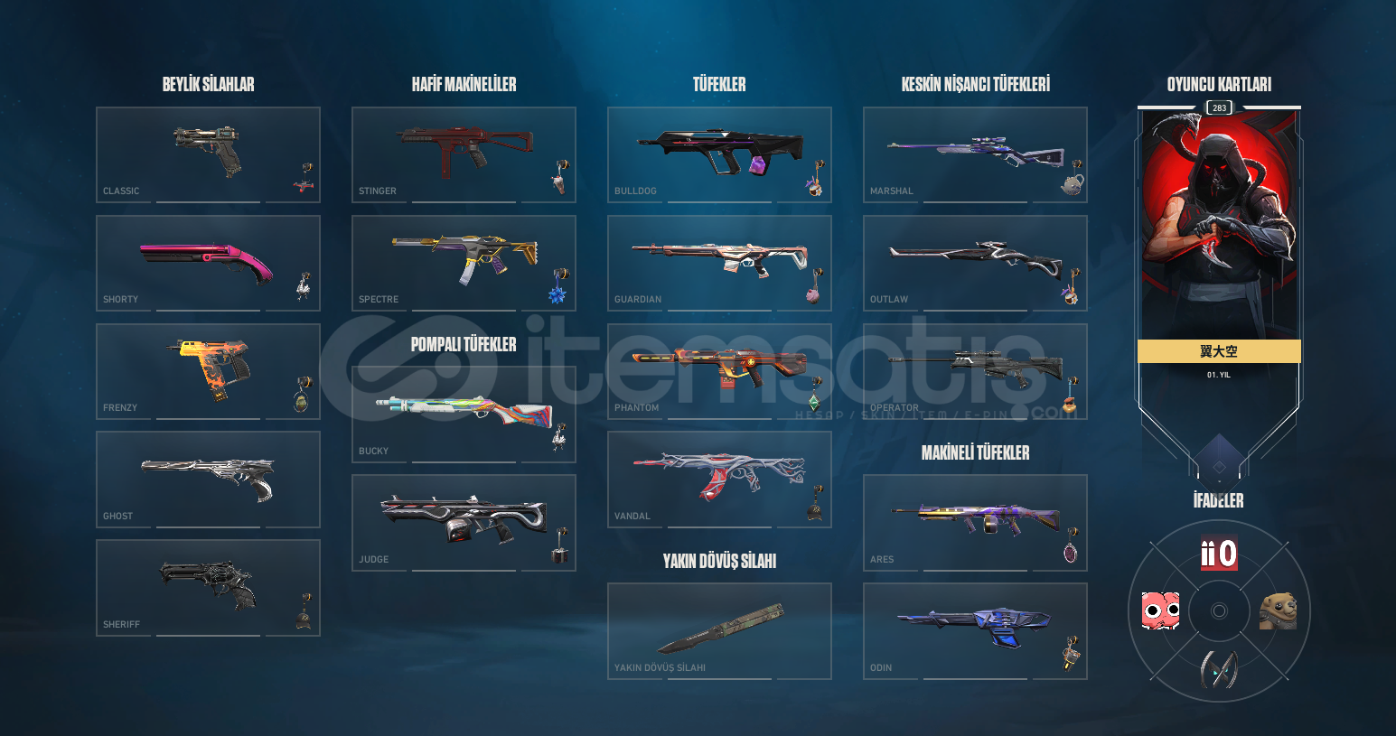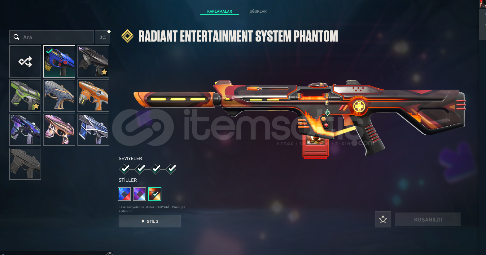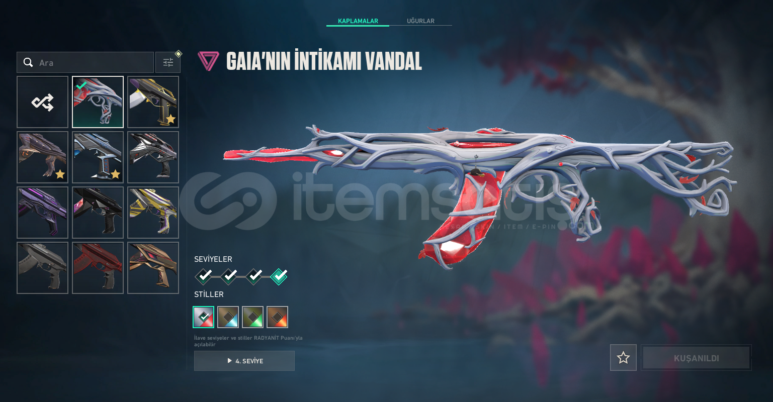 VANDAL: GAİA-ASİL-EJDER-KRONOMİ-ULU PENÇE-EX.OPHANTOM: RADIANT ENTERTAINMENT SYSTEM-ANOMALİ-SIR ÇİÇEĞİ- RGXSPECTRE: ASİL-ÖZEL HAREKATGHOST: FATİHSHERIFF: YAĞMACI-SİHİRPUNKOPERATOR: YAĞMACIBIÇAK: BATTLEPASS KARAMBİT-ÖZEL HAREKAT KELEBEK