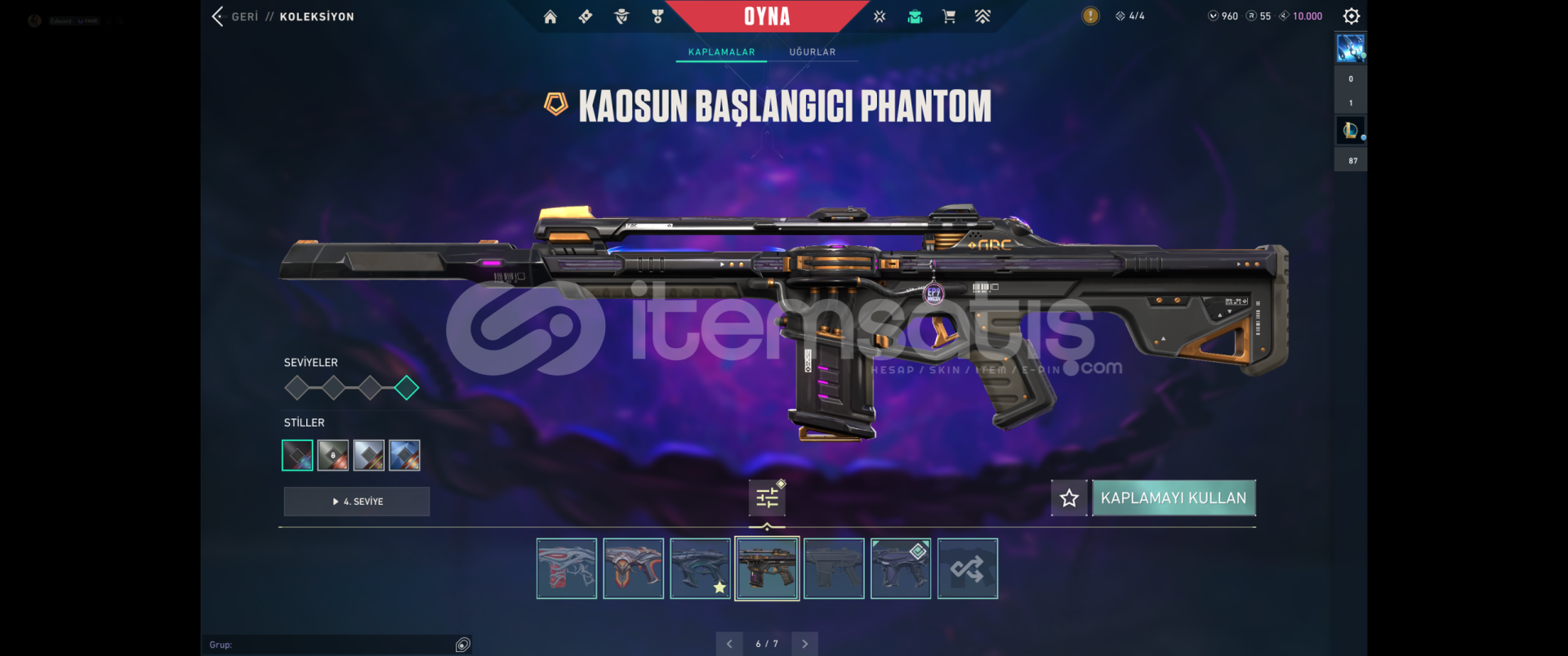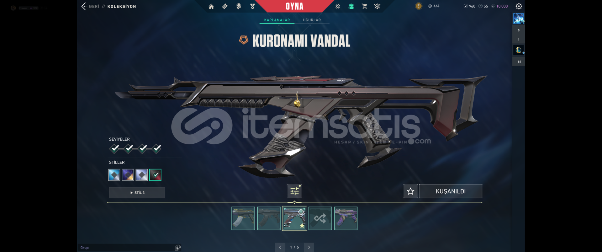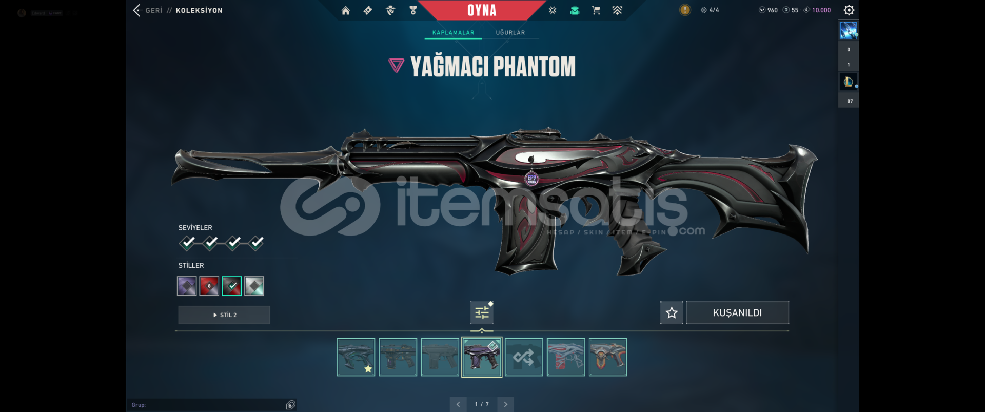 Kuronomi VandalAsil VandalYağmacı PhantomGaıa nın intikamı phantomHelezon PhantomKaosun başlangıcı PhantomSihirpunduk SheriffYitik SpectraGalaksi muhafızı kılıçVe tüm diğer silahlarda sezon desenleri vardırTOPLAM: 36 Skin +3000 VP