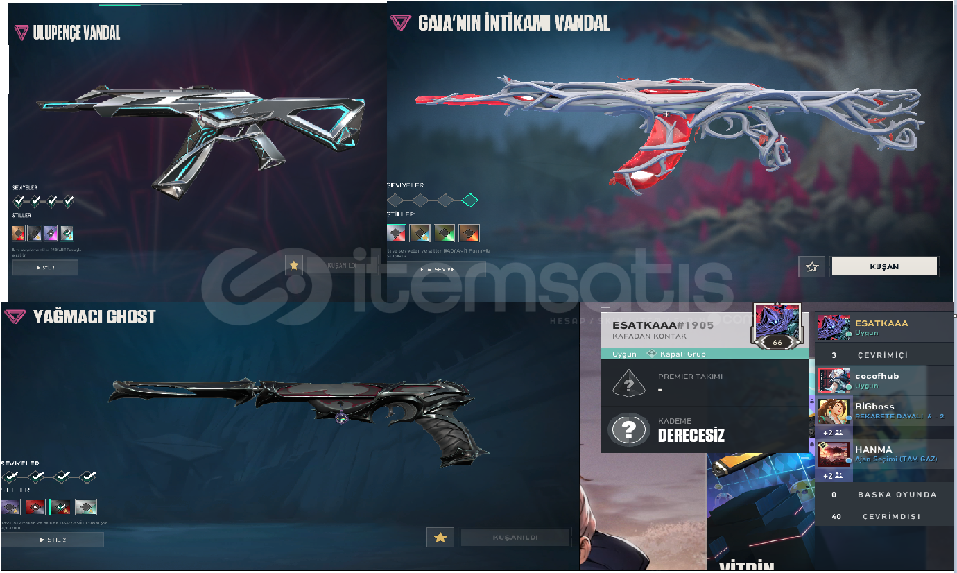 Hesap İsmi : ESATKAAA66 SEVİYEUlu Pençe VandalYağmacı Ghost Gaı nın İntikamı Vandal Hiçbir Şekilde Sorun YaşamazsınızHerhangi Bir Sorunda İadeniz Yapılacaktır. Hesapta Ayriyeten 353 Vp Vardır.TeraShop Güvencesiyle