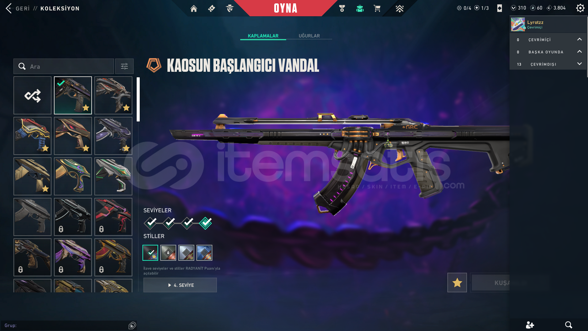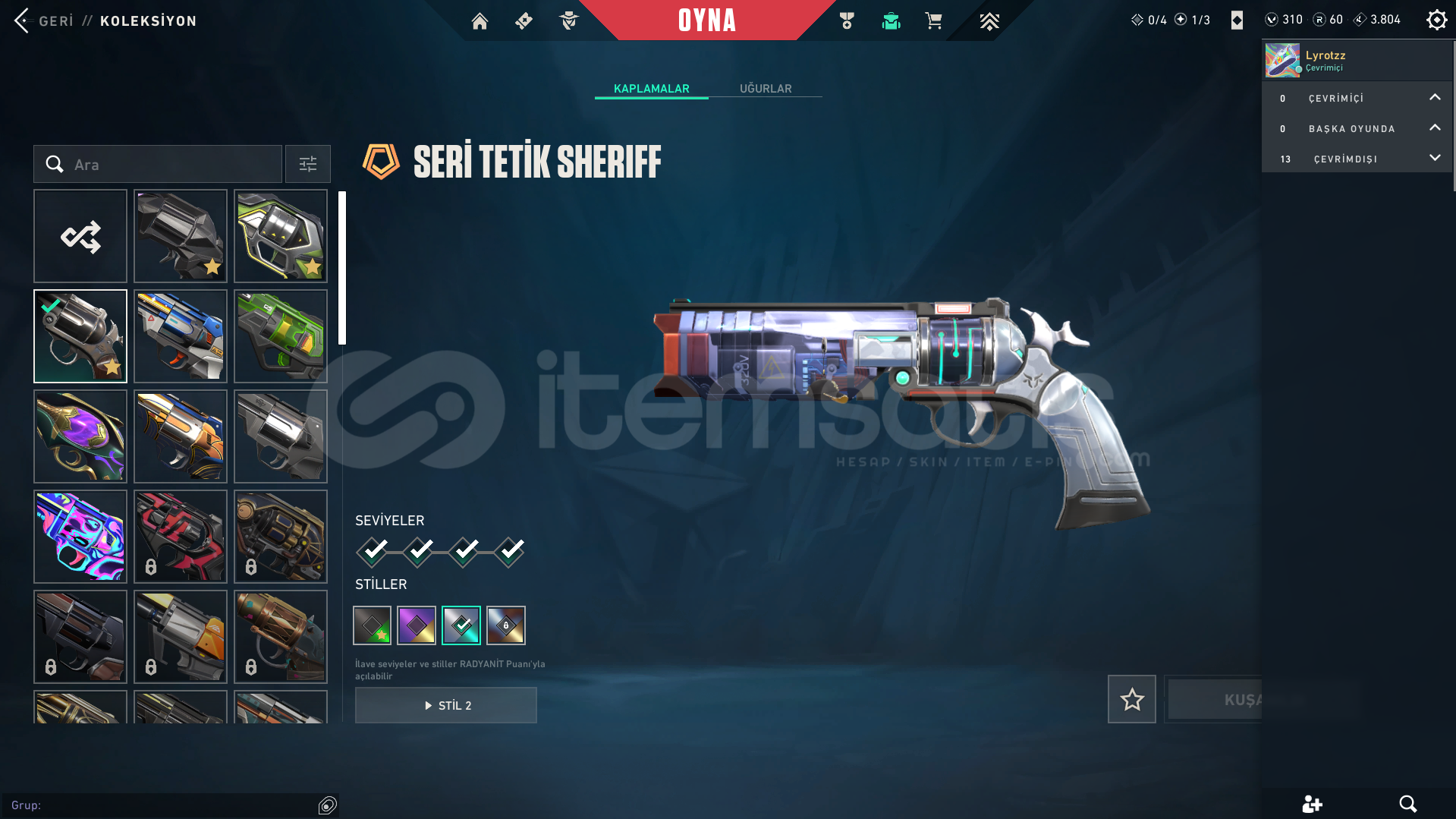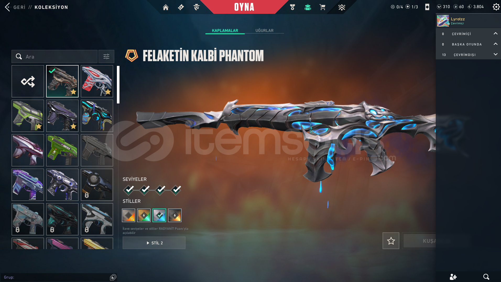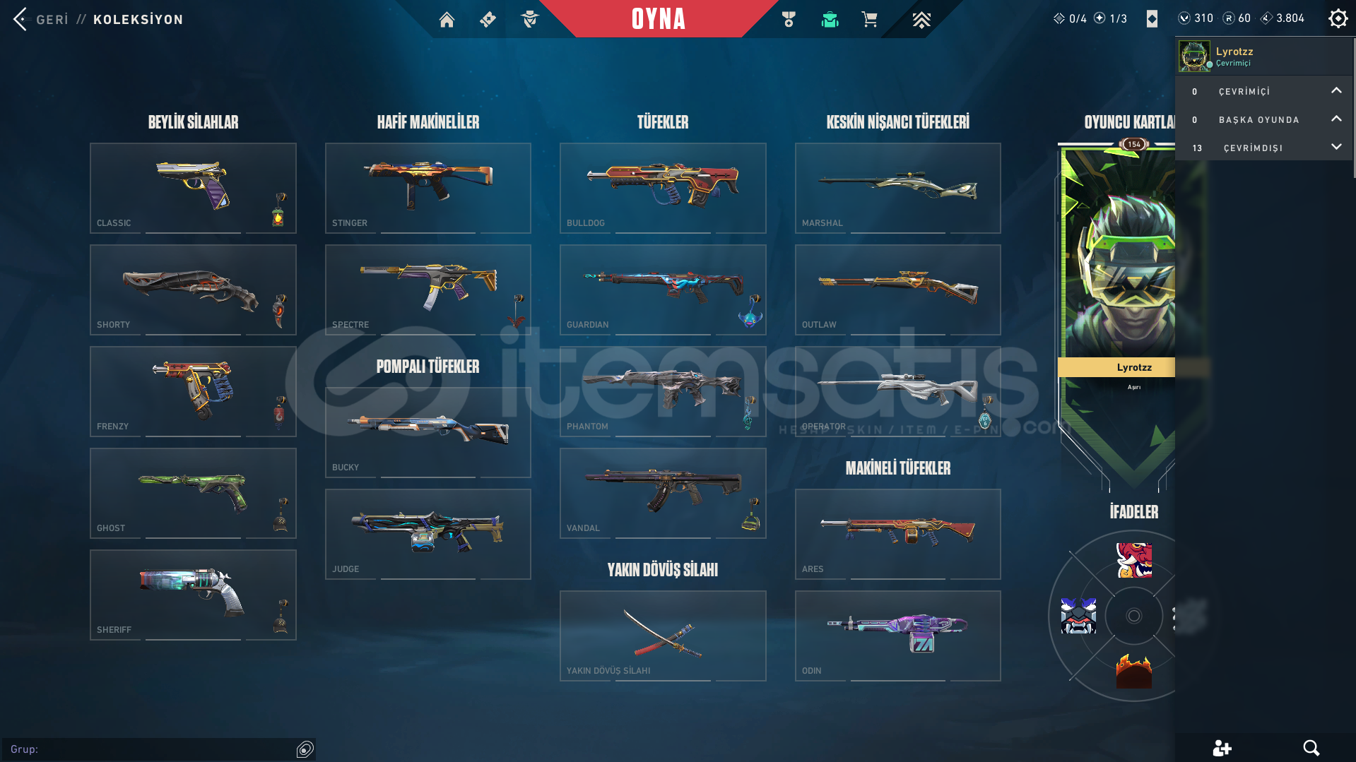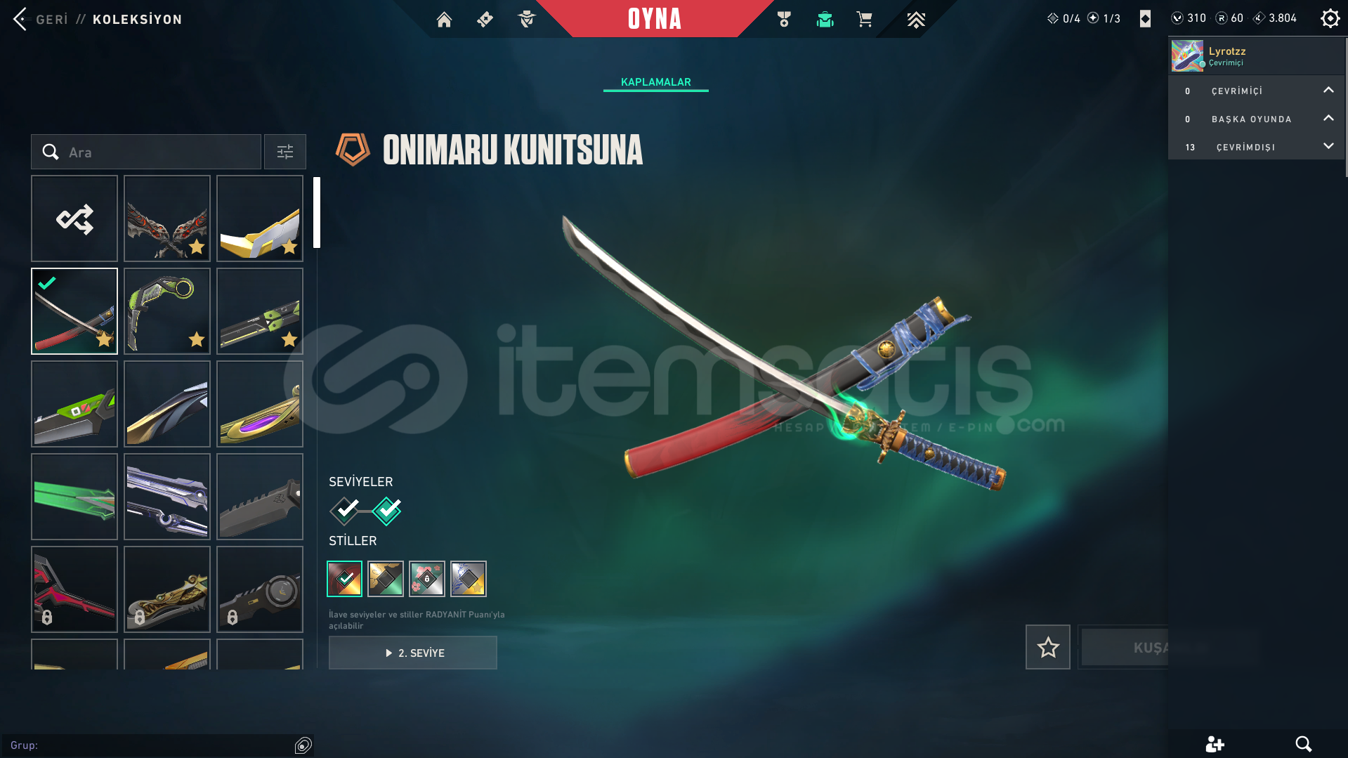 Hesap Hakkında Bilgiler:HESAP TÜRKİYE SUNUCUSUNDADIRPEAK RANKI PLAT 3 BU SEZON GÖRÜLDÜ ŞU AN PLAT 2 HESAPTA 310 VP 60 RADYANİT VARDIR OYUNU BIRAKTIĞIM İÇİN SATIYORUM MERAK ETTİĞİNİZ BAŞKA BİRŞEY VARSA SORABİLİRSİNİZ Skinler: 5 ADET BIÇAK: ONİ KATANA, FELAKETİN KALBİ BIÇAK, ASİL KARAMBİT, RGX KARAMBİT, RGX KELEBEK 6 ADET VANDAL: YAĞM...