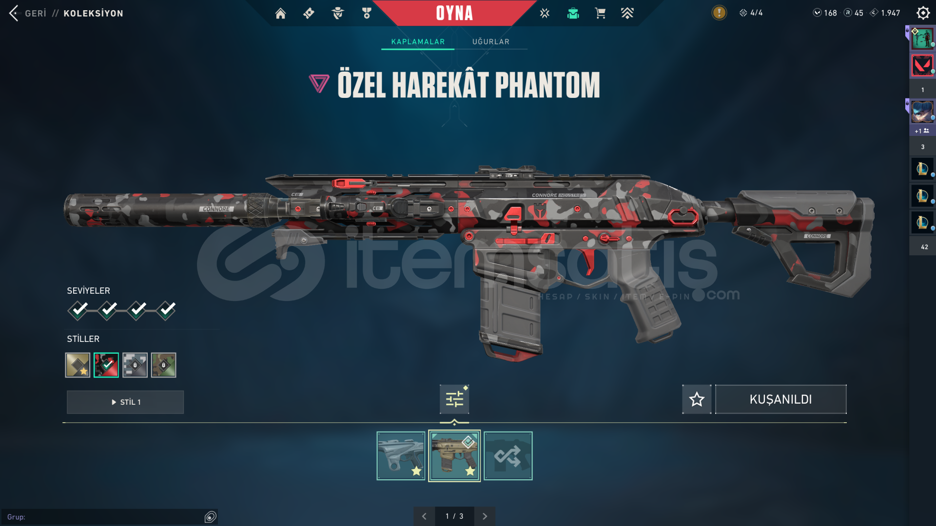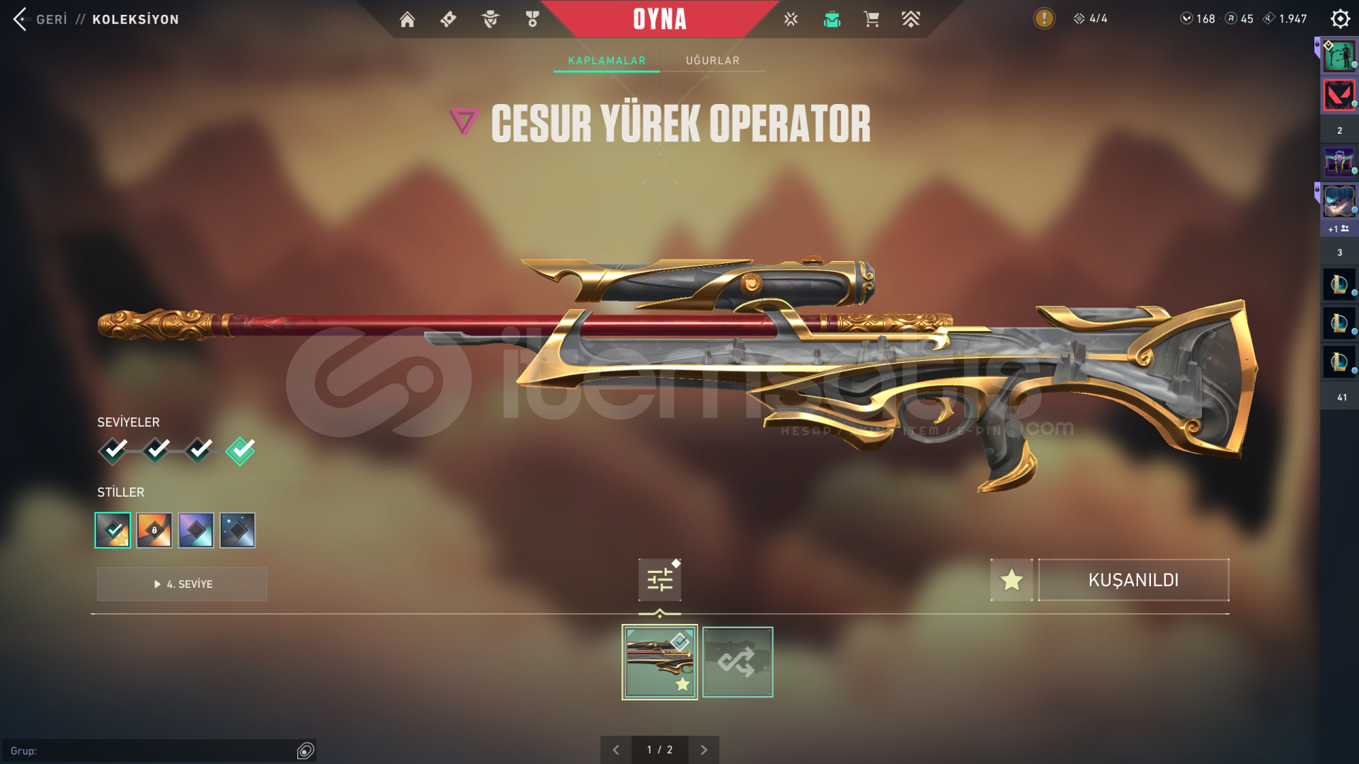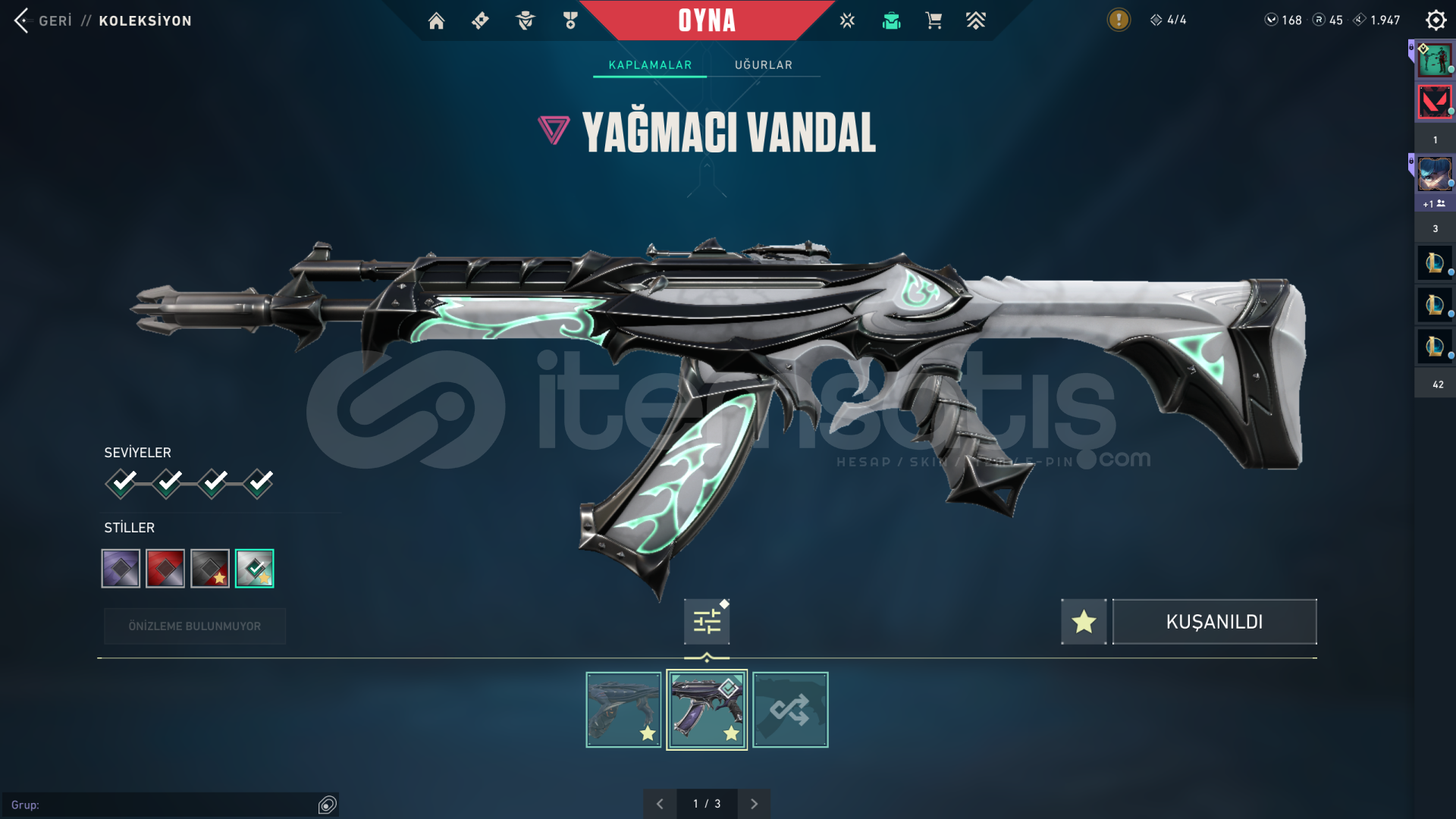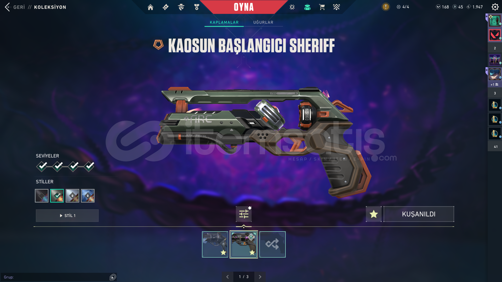 Vandallar:-Ejder Vandal-Yağmacı VandalPhantom:-İyon Phantom-Özel Hareket PhantomSheriffler:-Kaos Sheriff-Işık MuhafızıBıçaklar:-Beta 5. Yıl Bıçağı-Gaia'ın GazabıClassicler:-Asil ClassicGhost:-Gaia GhostGuardian:-Oni GuardianOperatör:-Cesur Yürek Operatör.3 Battlepassli Gold 3 Görmüş Hesap Kaçırılmazzzzz