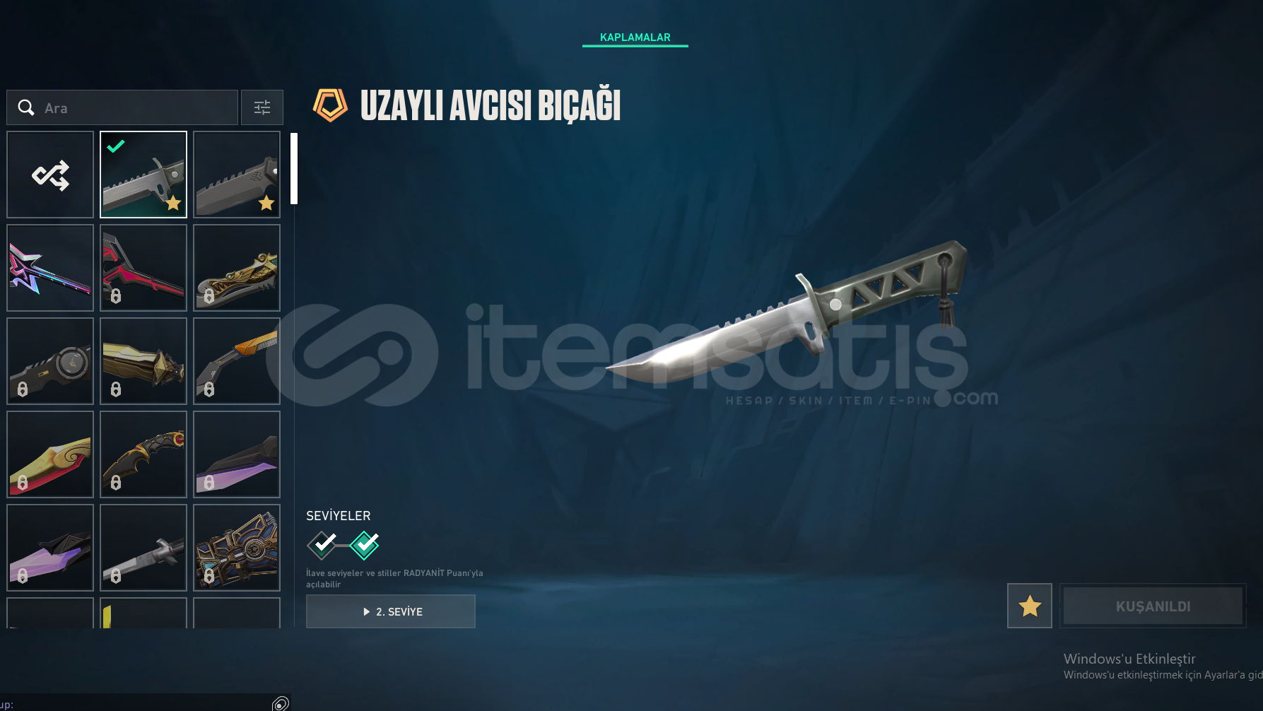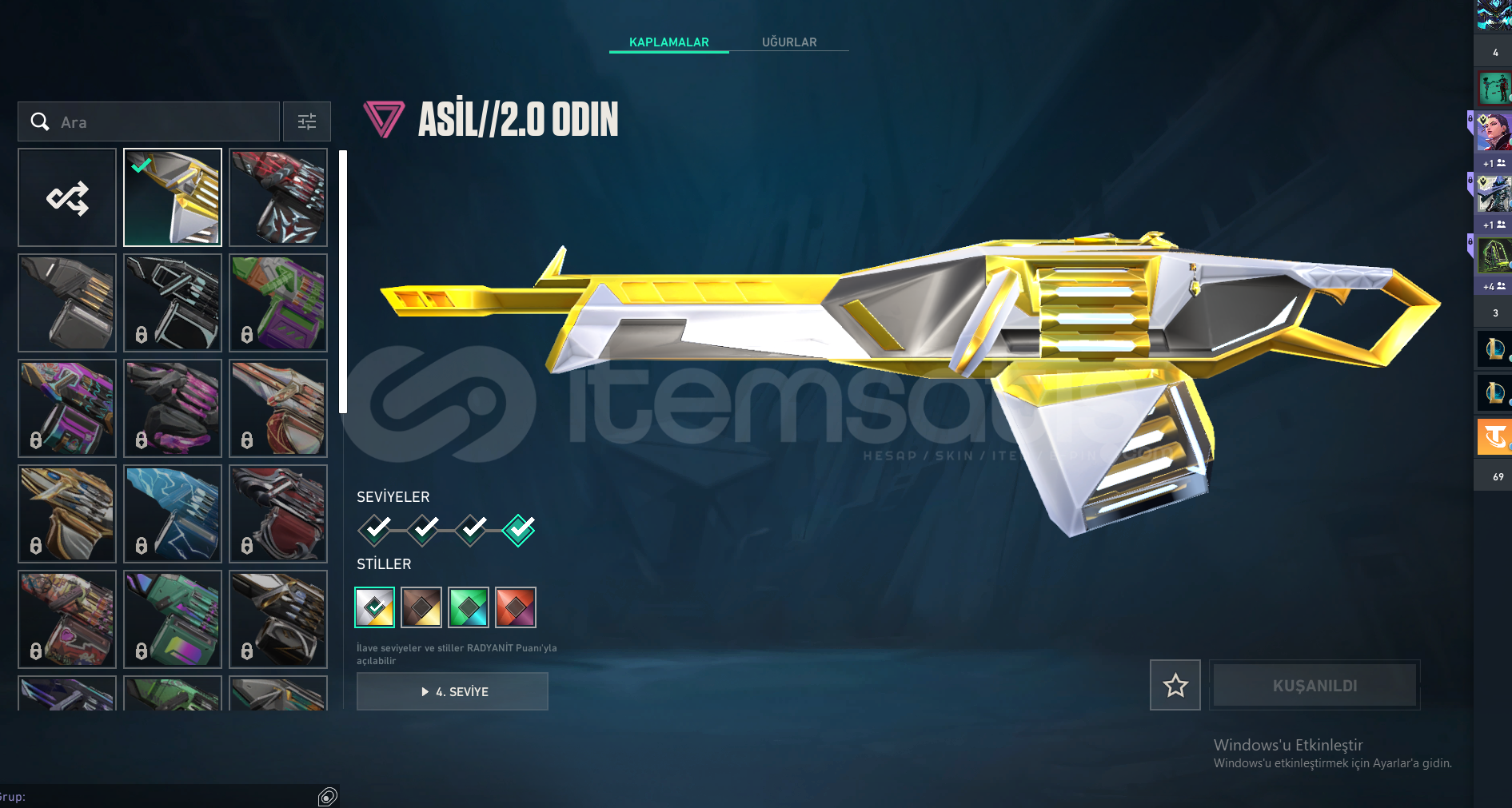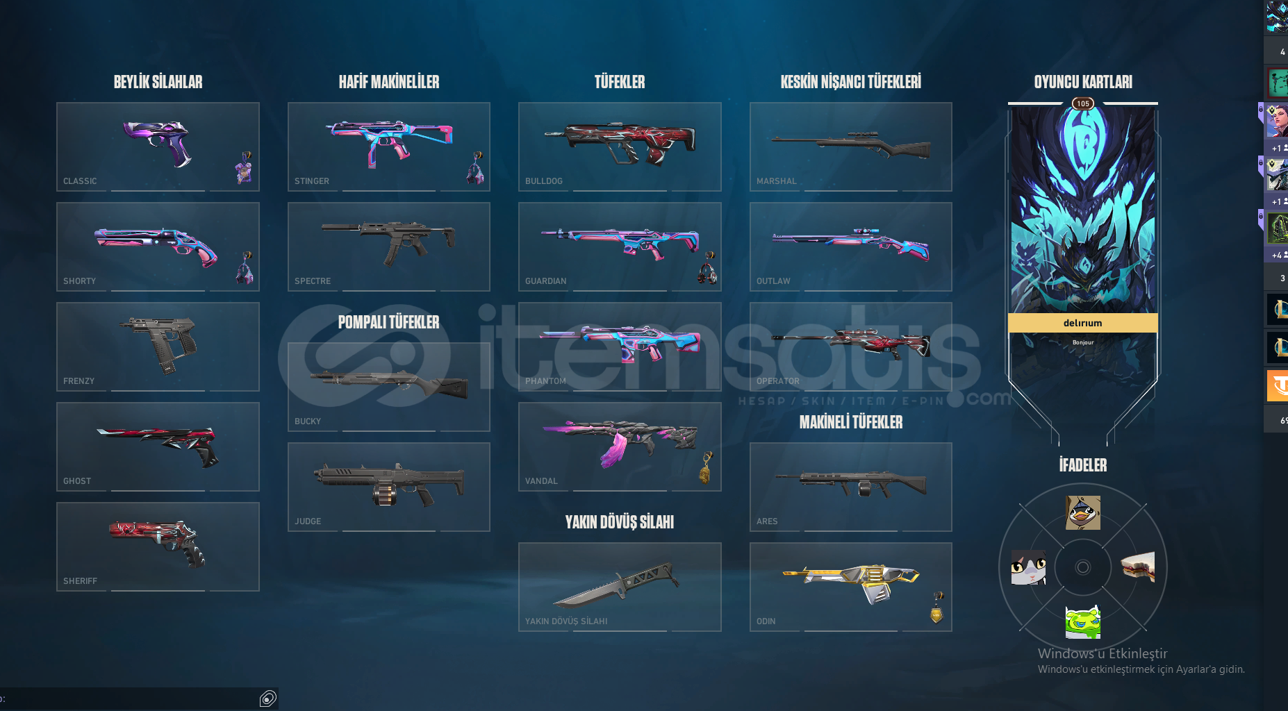 HESABIN İÇİNDE 19 ADET SKİN BULUNMAKTADIR 4 TANESİ HARİÇ DİĞER SKİNLER BATTLEPASSTİR ASİL ODİN ONİ VANDAL UZAYLI AVCISI BIÇAK DOLMİRİN İNTİKAMI VANDAL DİĞERLERİ BATTLEPASS SKİNLERİDİR LÜTFEN CİDDİ ALICILAR YAZSIN ALANA ŞİMDİDEN HAYIRLI OLSUN HESAP ELMAS RANKINDADIR.