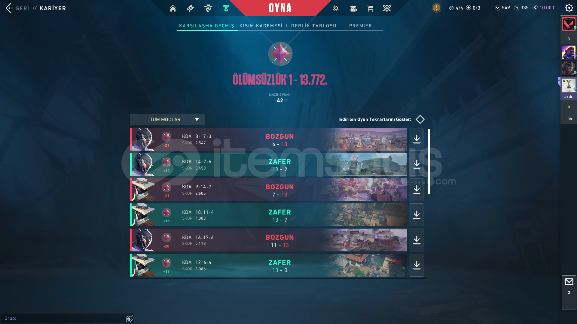 Hesabım E6 dan beri aktif E8 den sonra full immo gördüm peak immo 3 231 rr toplam 23 skinim var: Zifiri seti, RGX Vandal, Champions 2025 Vandal, Fatih Guardian, Cesur yürek ghost, ışık muhafızı sheriff 13 tane de normal savaş bileti sonu skinleri var savaş bileti almadım hiç hesapta güncel 550 vp ve 335 rp var aldıgım bütün skinleri yükselttim 240 level nerdeyse 4 yıllık hesap fiyatta pazarlık yaparım np veto hariç tüm ajanlar açık güzel katlar vs vardır. İsim değiştirmesine bi 10 gün var ondan sonra değiştirilebilir.