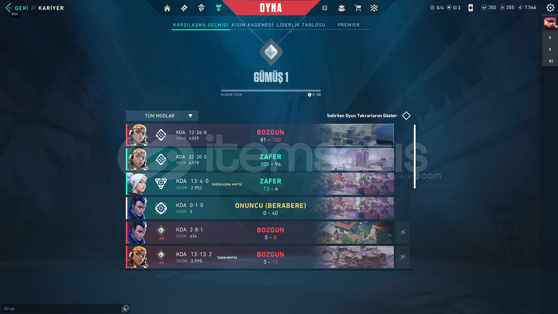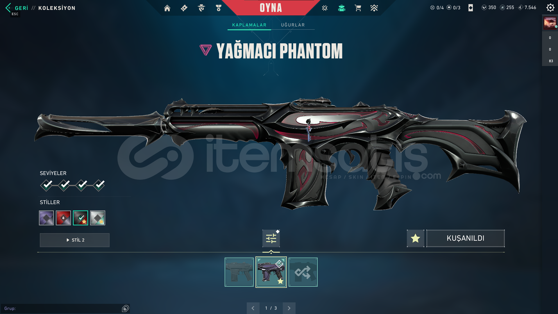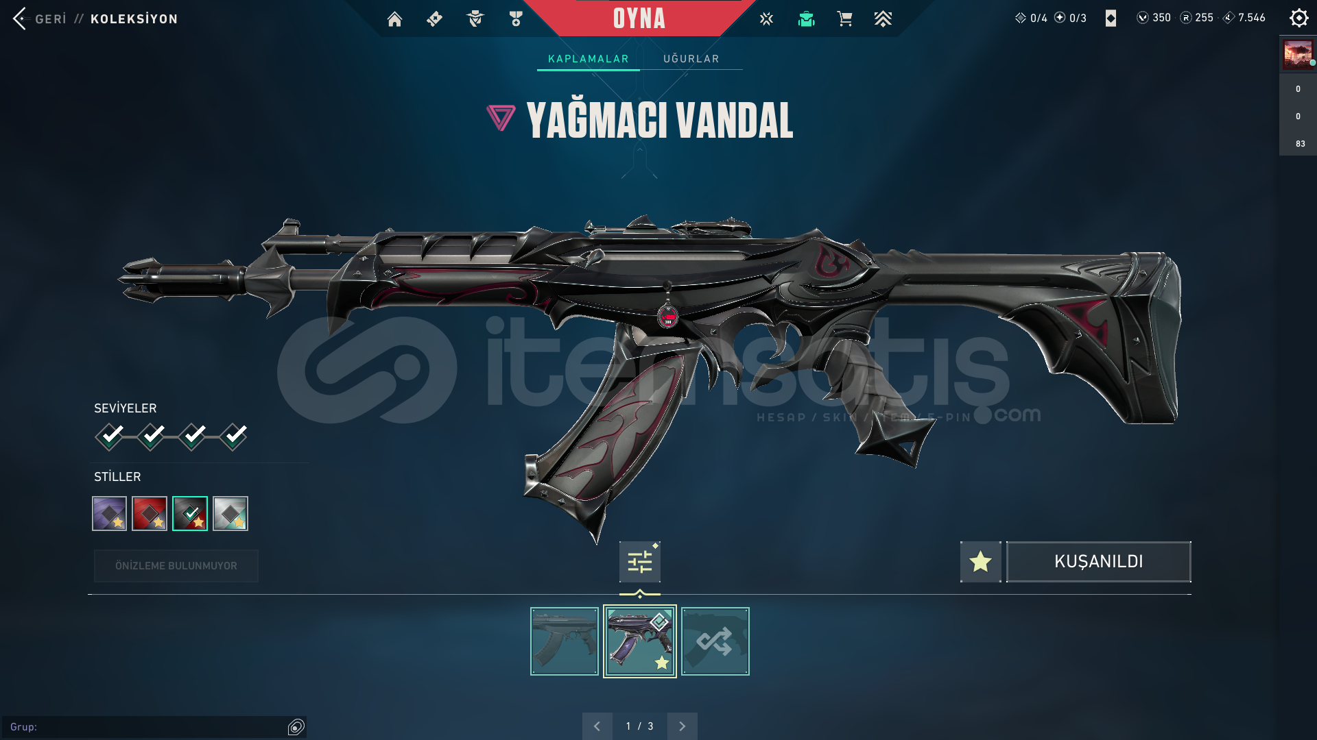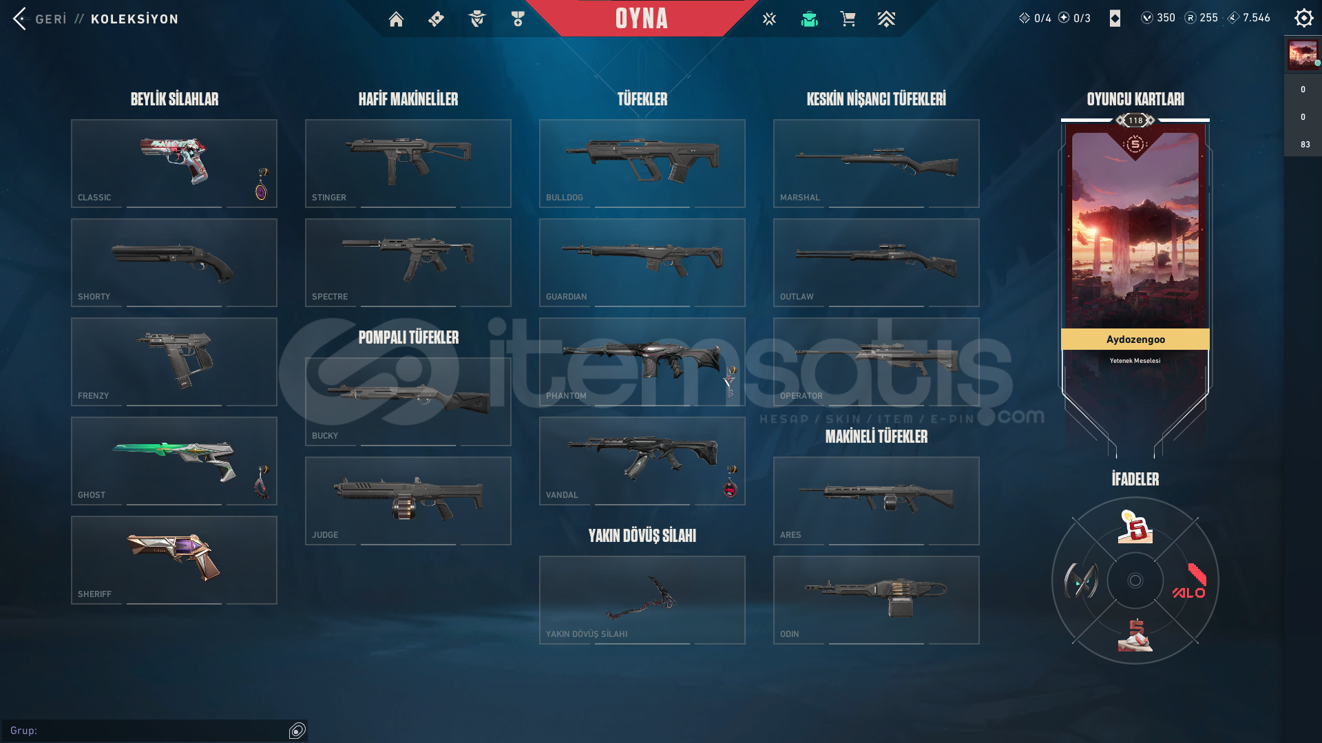 ⚙️ Hesap Bilgileri:Hesap Seviyesi: 118Radianite Points (RP): 255Sunucu: EU (Avrupa)🔫 Silah Koleksiyonu:Vandal: ✅ Yağmacı (Reaver) Vandal – full seviye + tüm renkler açıkPhantom: ✅ Yağmacı (Reaver) Phantom – full seviye + stil 2 aktifSheriff: Mor temalı skinGhost: Yeşil parlayan özel skinYakın Dövüş Silahı: Kırmızı-siyah efektli bıçakDiğer Silah...