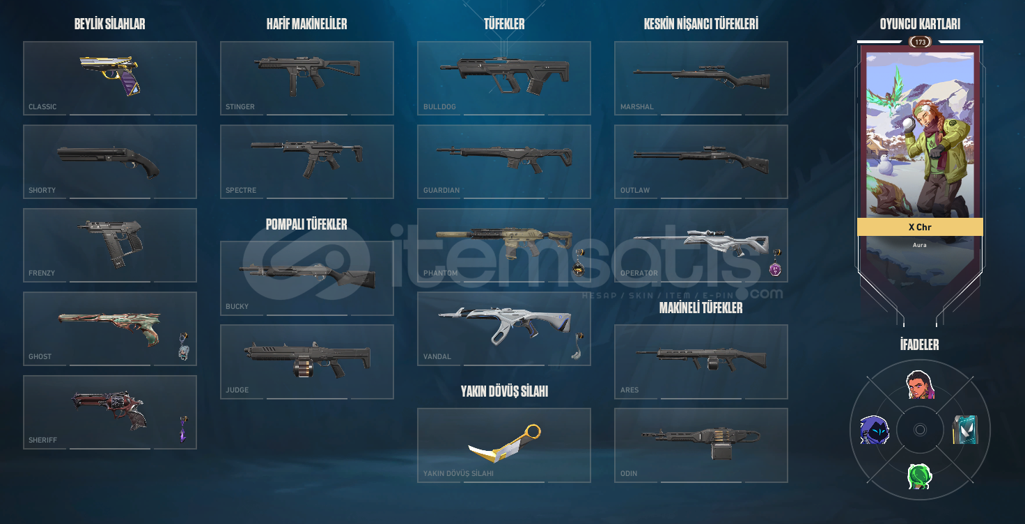 -Asil Classic-Fatih Ghost-Yağmacı Sherrif-Anomali Sherrif-Özel Harekat Phantom-İyon Vandal-Cesur Yürek Vandal-İyon Operator-Asil Karambit-Gaia'nın Gazabı Bıçak(ikili);Skinleri Mevcut!Mail Değiştirilir.İlan verilen tarihten 20 gün sonra isim değişim hakkı mevcut olucaktır.