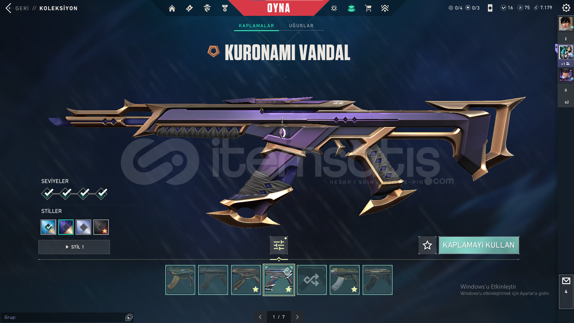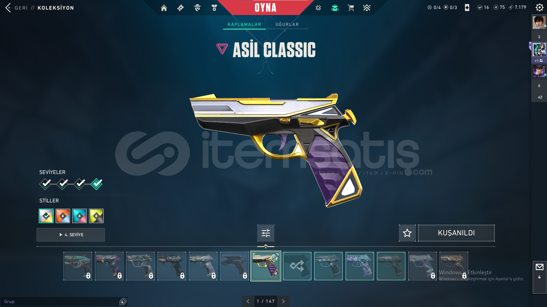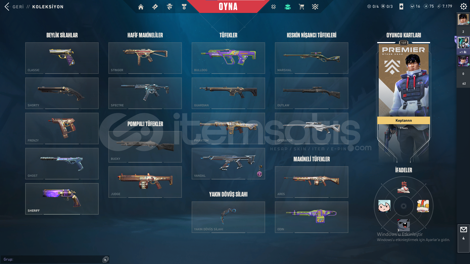 Hesapta pass harici 11 adet skin bulunmaktadır. 3 vandal 3 bıçak 1 phantom 1 operatör 1 classic 1 ghost 1 sherrif olmak üzere. Bu skinlerin toplam değeri 28.000 vp yi geçmektedir.2 adet sezon pass alınmıştır.75 radyanit 16 valorant point bulunmaktadır.Hesap seviyesi 137 dir. Aktif rank bronz 2 71 kp dir.En yüksek diamond rankını görmüştür.Diamond uğurluğu vardır.Kuronami ve premier s...