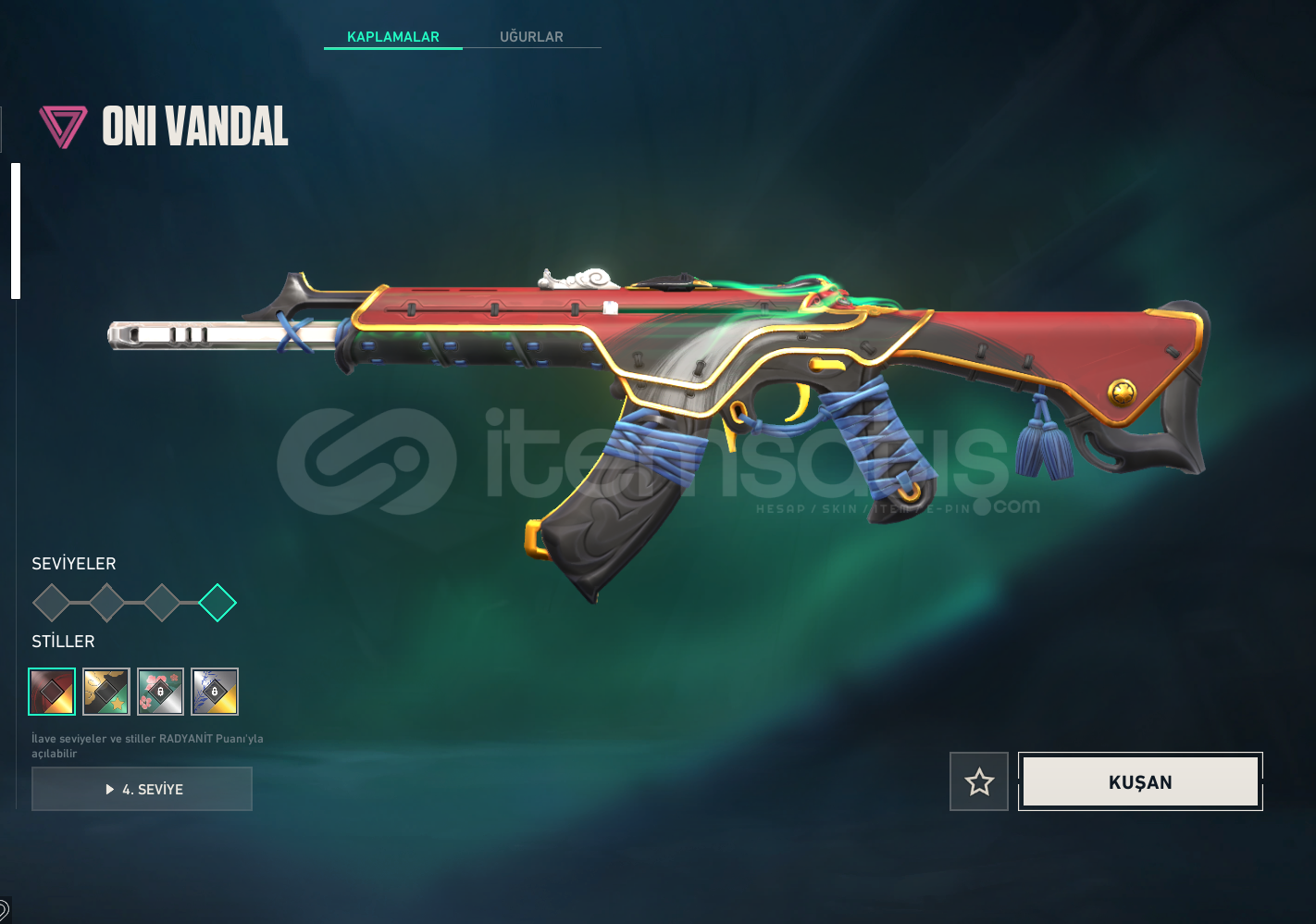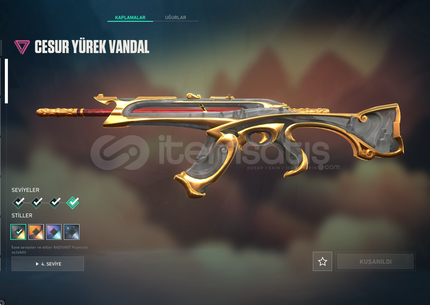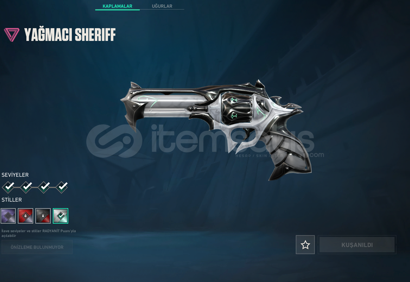 Hesapta oni vandal cesur yürek vandal ve yağmacı sheriff vardır. 1 kere battle pass alınmıştırSilahların hepsi son seviyedir.hesapta 141vp ve 65 radyanit vardır.teslimat aksam saat 6 dan sonra yapılacaktır.