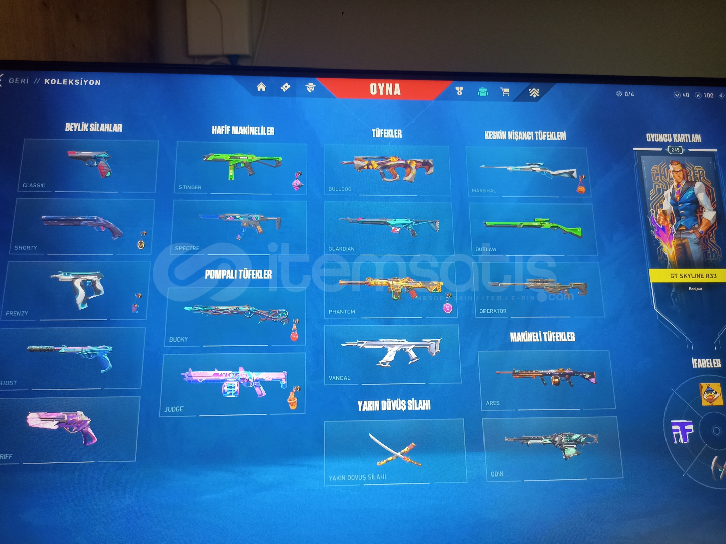 Asil classic,cesur yurek ghost,isik muhafizi ejderin buyrugu sheriff,neptun spectre,gaia bucky ve vandal zifiri bulldog ,asil guardian,oni ve asil phantom, kuronami 23 champions ulupence yitik vandal ,sogukcelik operator ,yagmaci odin,asil karambit yagmaci bicak ulu pence bicak oni katana 4 tane savas bileti acilmistir hesap guncel plat dia3 peek 100 radyanit bulunmakta