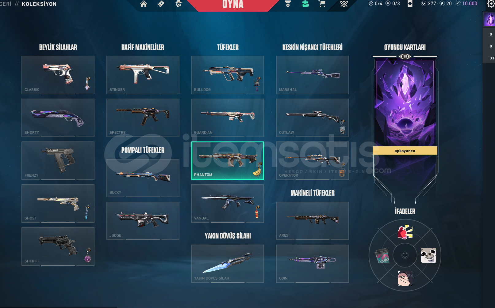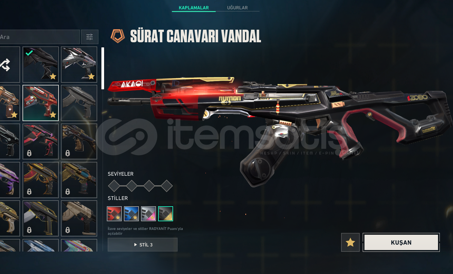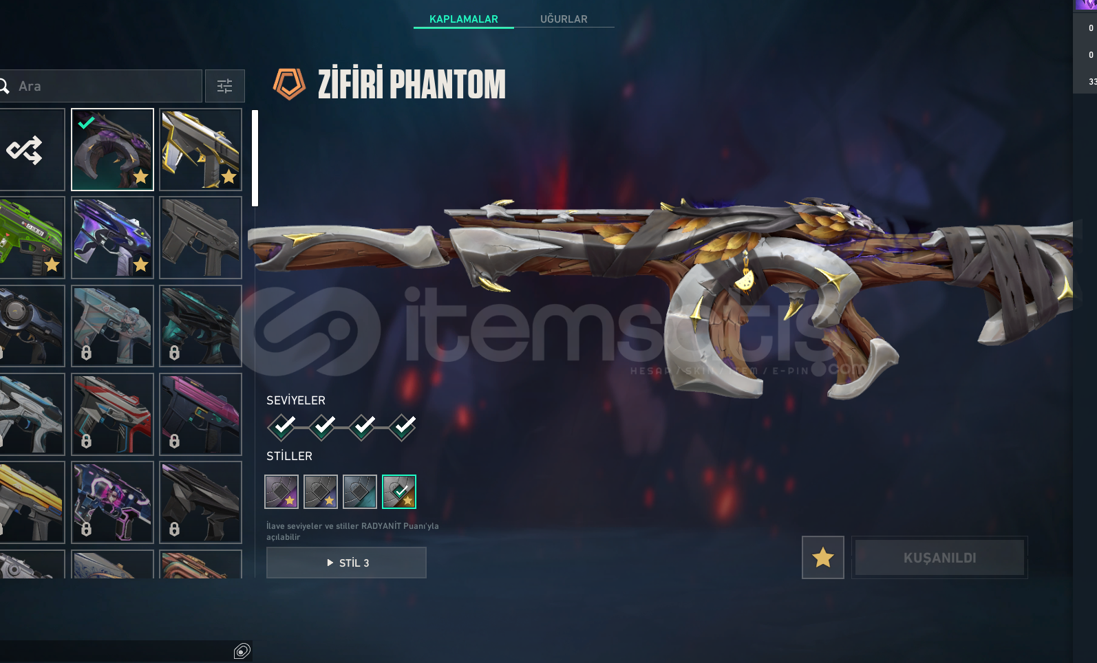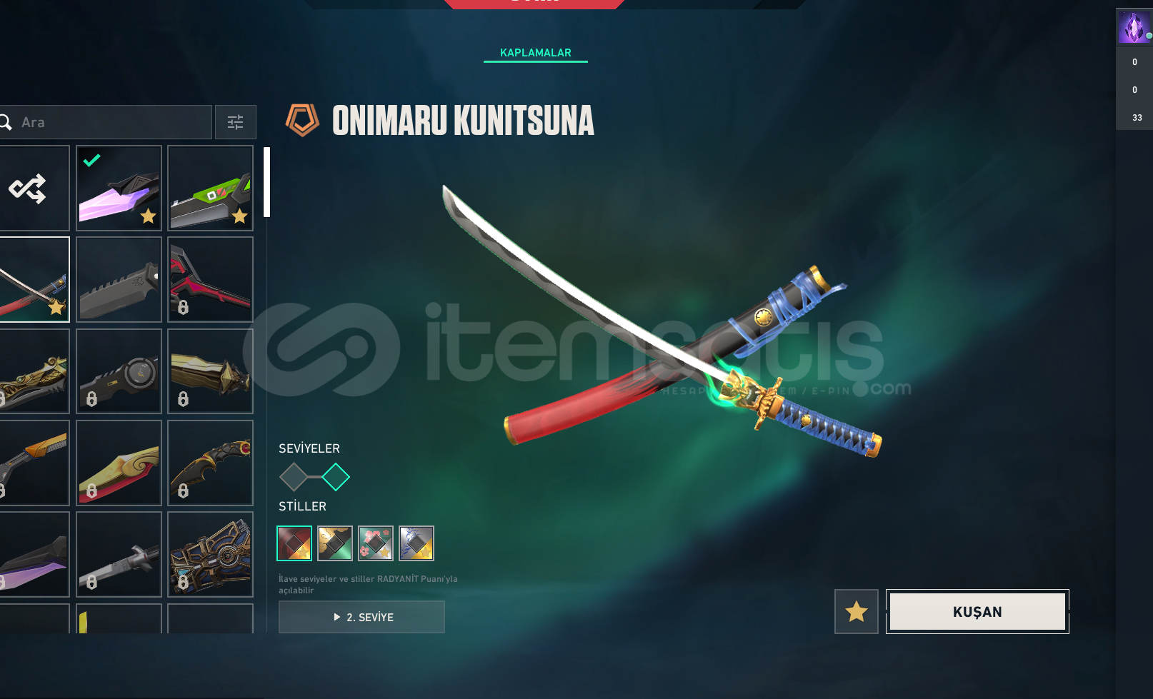 valorant hesap içinde 1 veya 2 battle pass bıcaklarda oni katana veanomali kelebek vandallarda surat canavarı vandal sihir punk vandal ve anomali vandal phantomlarda zifiri phantom ve asil phantom sherifde yagmacı ve ghostta anomali anomali 2.0 setti vardır 80 lvl dir