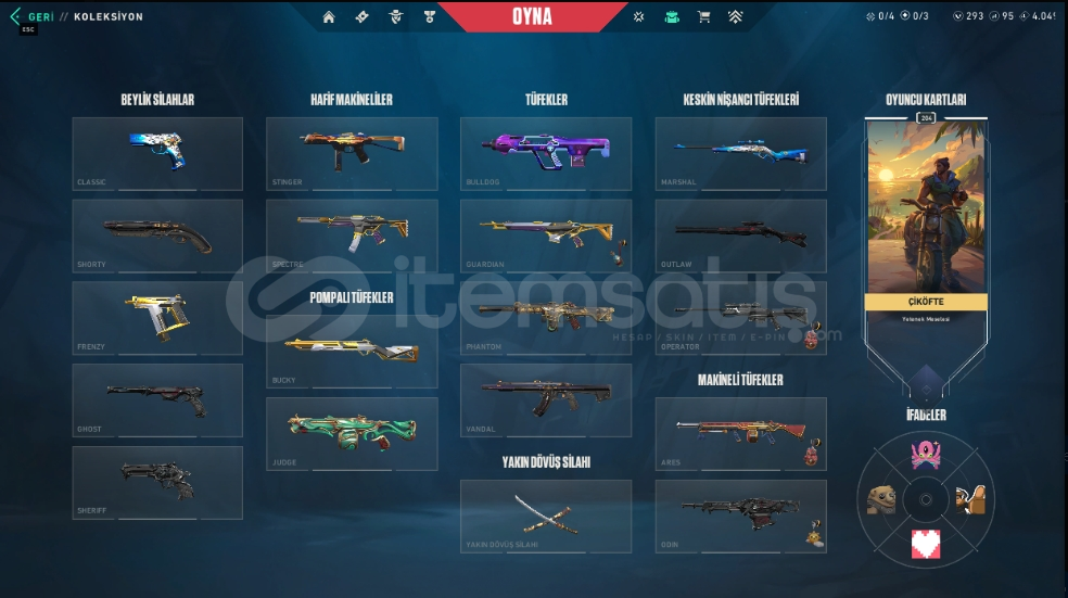 🔹 Silah Kaplamaları:🟦 Classic4 Battle PassŞorty KaosFrenzy AsilGhost YamacıSheriff Yamacı / Anomali / Seri Tetik🟩 SMGStinger – 3 Battle PassSpectre – Asil🟫 ShotgunBucky – AsilJudge – Ejderin Buyruğu⬜ RifleBulldog – Radiant Entertainment SystemGuardian – AsilPhantom – Oni / Asil / YamacıVandal – Kaosun Başlangıcı / Asil / Yamacı / Zamanın Ötesi / Gaia&...