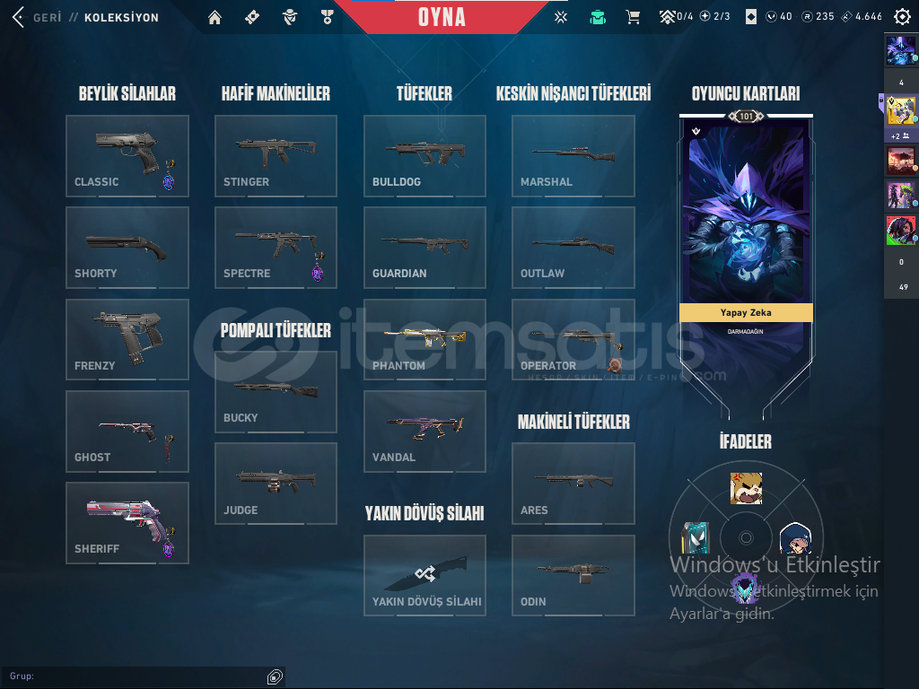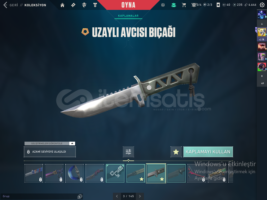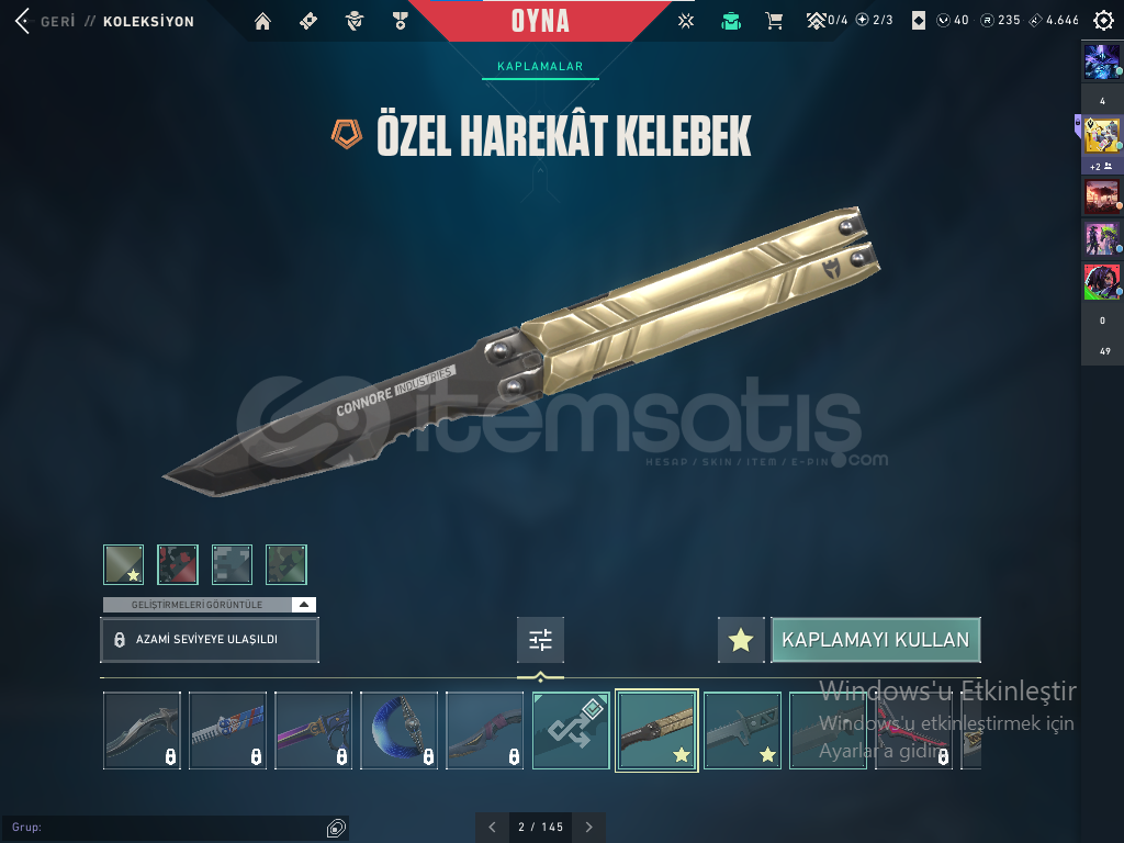 Kuronami vandal, asil phantom, uzaylı avcısı bıçak, özel harekat kelebek. Skinlerin çoğu rengi açık. Hesapta 300 e yakın rp var.