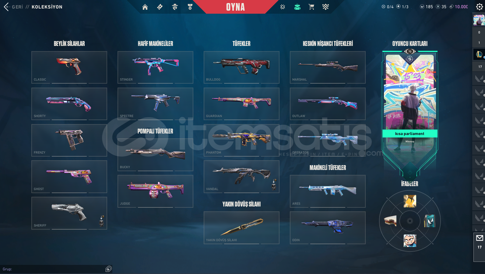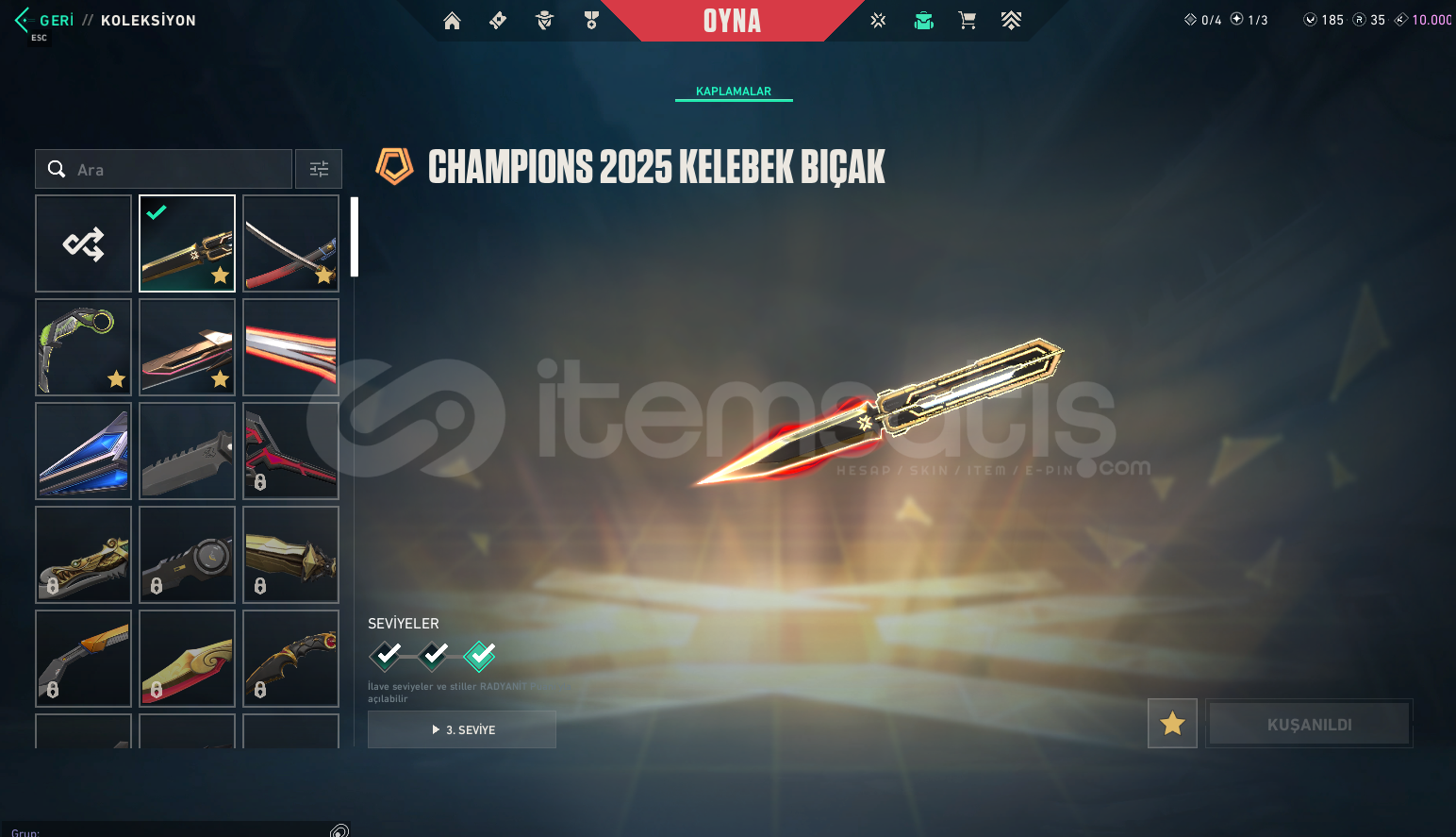Merhabalar hesabın içerisinde;Sheriff: İyon SheriffVandal: Champions 2025, Faz Koruyucu Vandal, Felaketin Kalbi Vandal, Yıldız Belası VandalPhantom: Ponçik Ecel PhantomBıçak: Oni Katana, Champions 2025 Bıçak, Rgx Karambit, Ulupençe Bıçak2 Adet battlepass ve bu sezonun battle passı bulunmaktadırRankı Elmas 2 dir.Hesabın ilk sahibiyim.Pazarlık Olur.