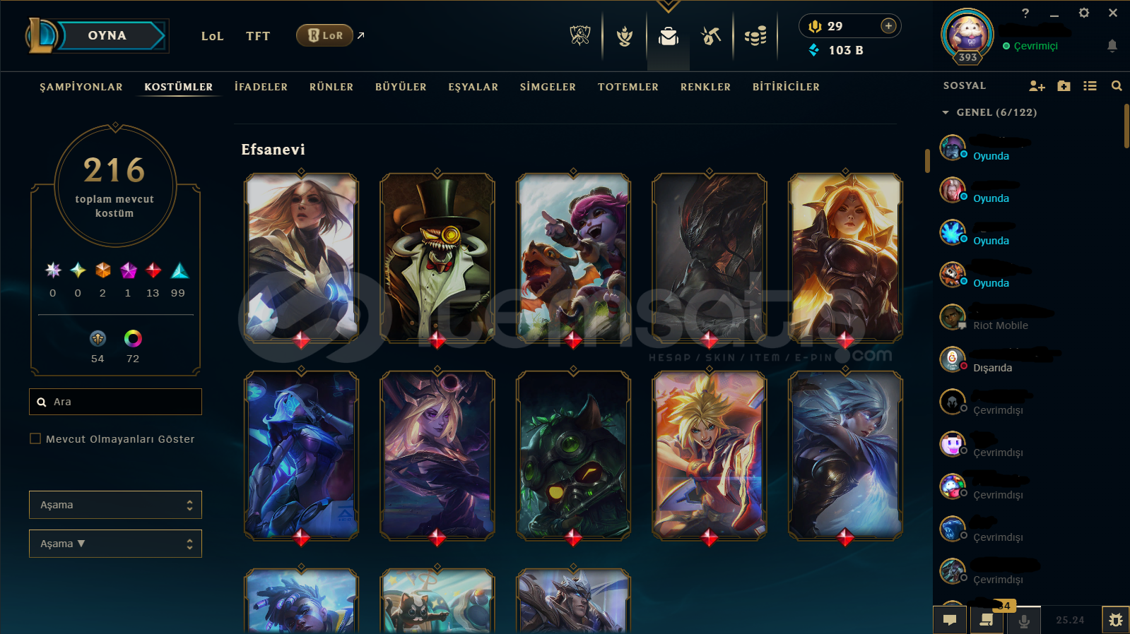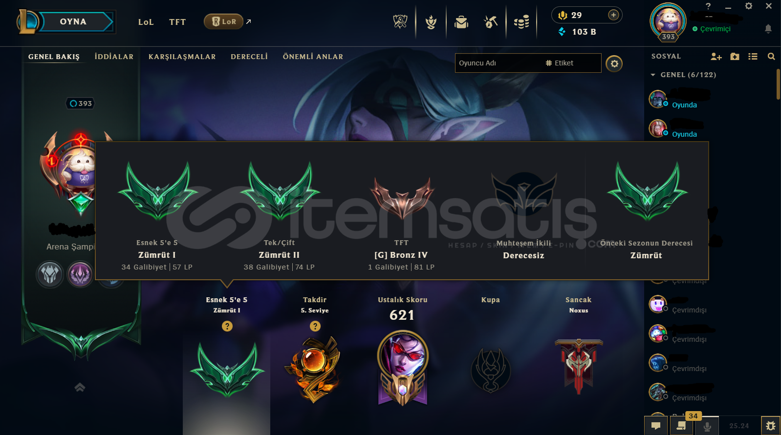 LOL' de karakterlerin hepsi açık.Ranku Zümrüt 25-30 lp veriyor100k mavi öz mevcut.200+ SkinValorant' da ise Rankı Elmas 3 (Eski zümrüt-imo)Delipop BıçakDelipop VandalAsil VandalUlupençe Vandalİon Sheriff+eski sezonlardan battlepassACİL NAKİTE İHTİYACIM OLDUĞU İÇİN SATIYORUM.NORMAL FİYATINDAN UYGUNA SATIYORUM.