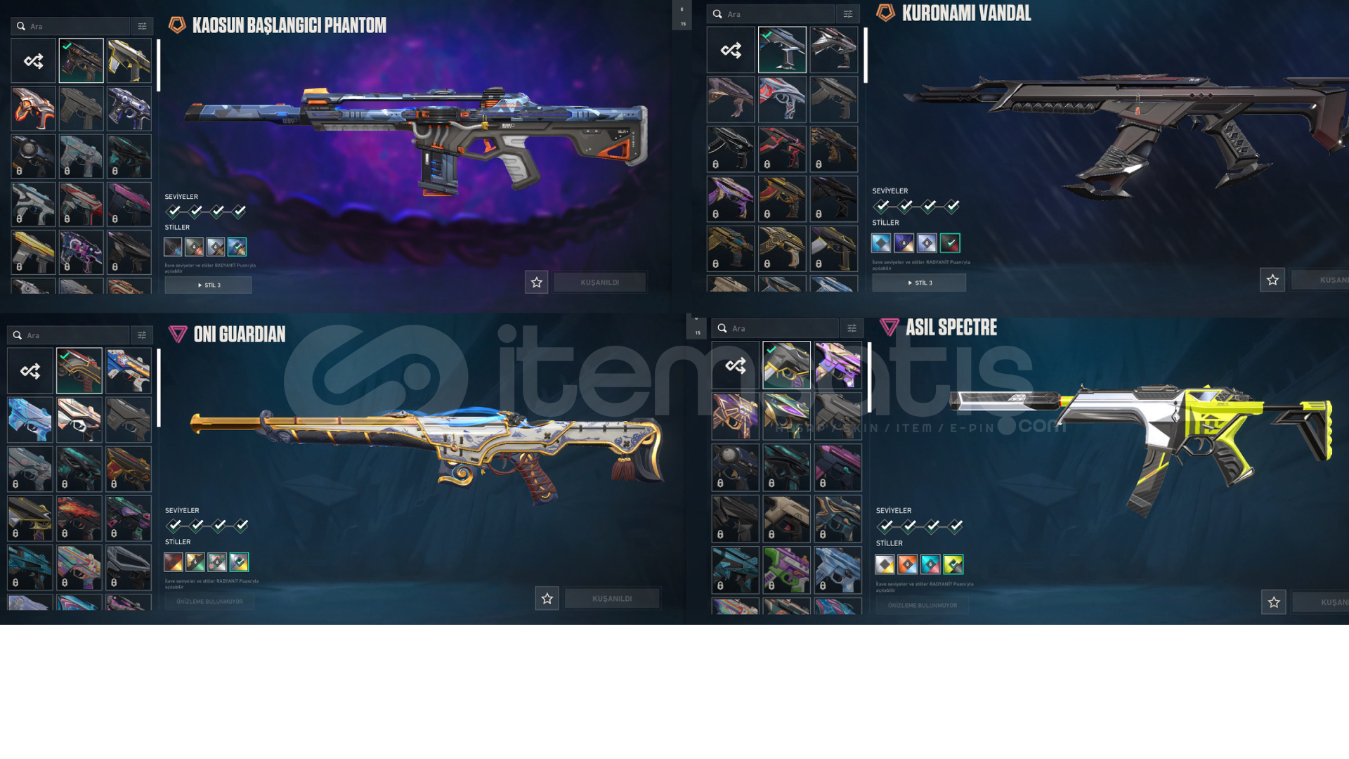 2 ya da 3 battle pass aldım ama kasmadığım için bir kaç skin ve kart aldım bıraktımVandal : Gaia - Ejder - KuronamiPhantom : Asil - KaosSpectre : AsilGuardian : OniBıçak : Vct 2025 KarambitLoL :73 Kostüm 1 İhtişamlı 7 Efsanevi 96 LvLİLK MAİLİ VERİLECEK