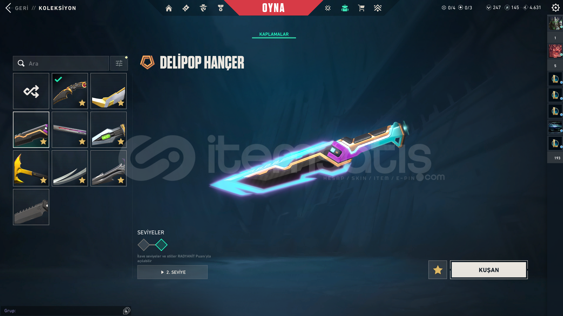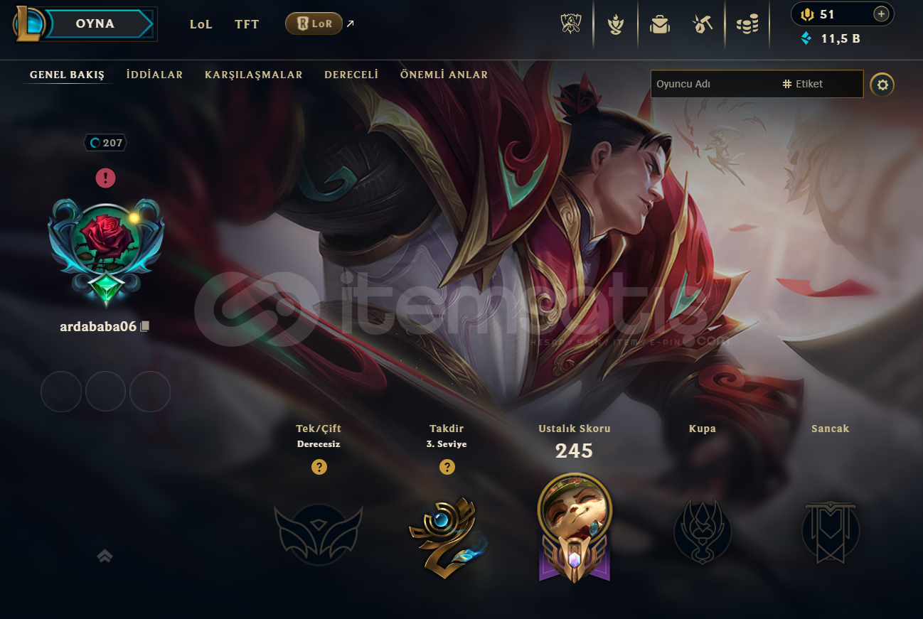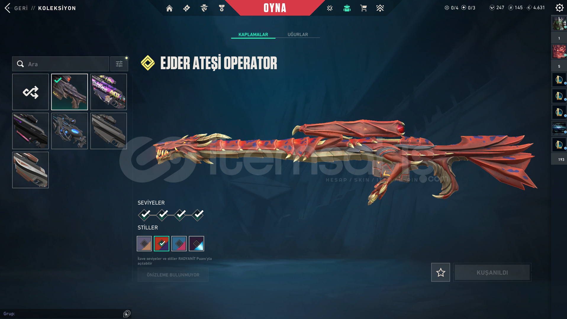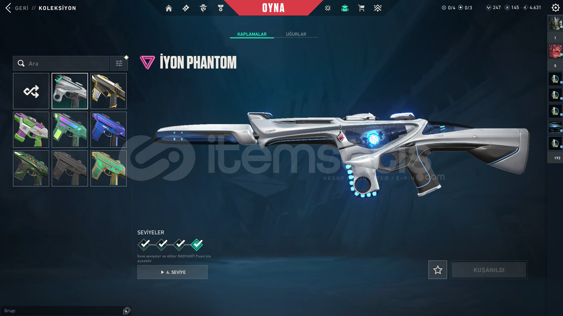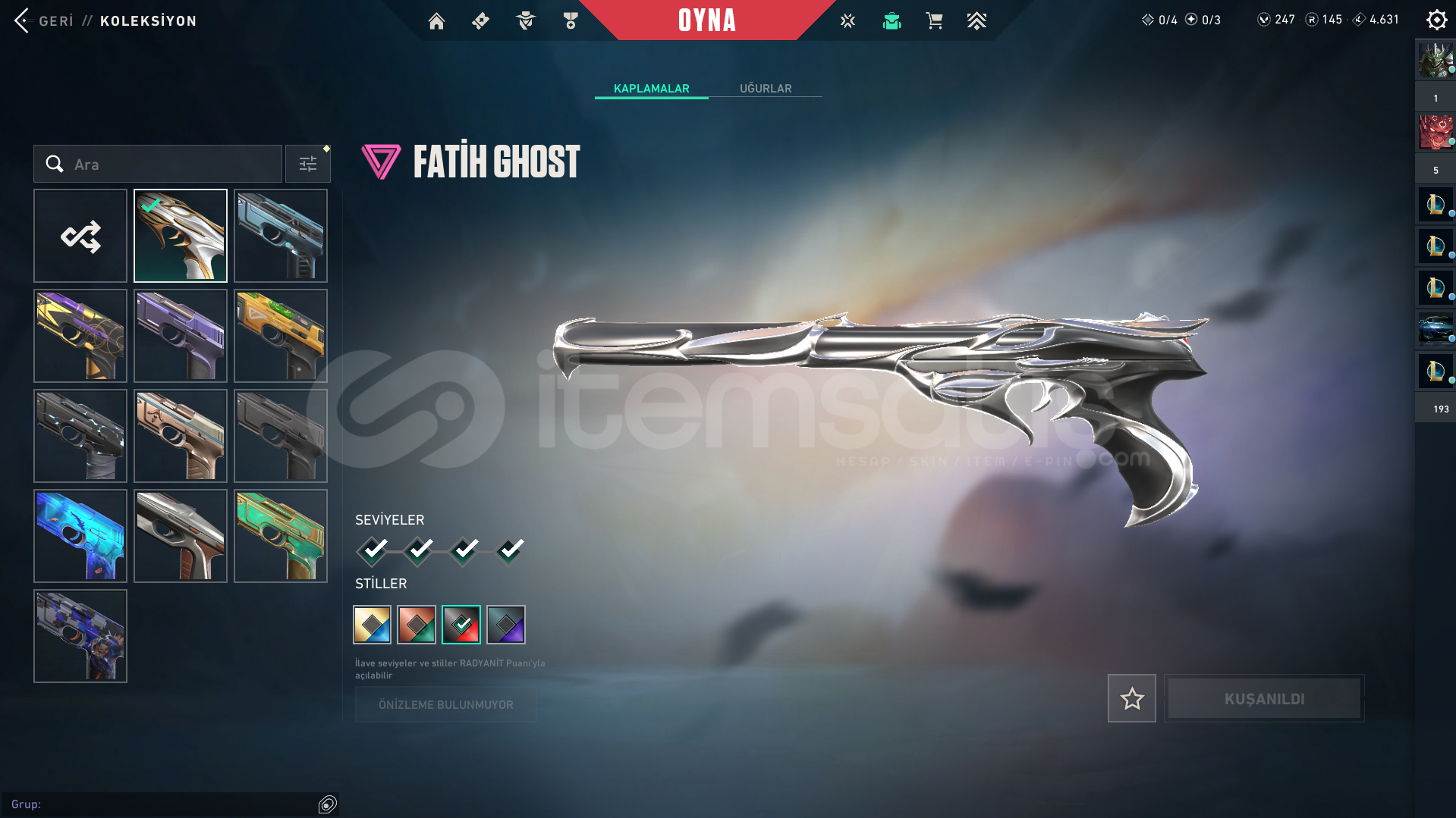 VALORANT5 BATTLEPASSclassic: Asil shorty: Bp frenzy: Bp ghost: Fatih sheriff: Anomali stinger: Bp spectre: Asil bucky: Bp judge: Bp bulldog: Bp guardian: Bp phantom: İon,Blastx,Asil,Prizma vandal: Ejder,Yağmacı,Asil marshall: Bp operator: Ejder,Sarmal ares: Bp odin: Bp BIÇAK: Delipop,Yağmacı,Asil karambitLOLLEVEL: 207SKİN: 642 ihtişamlı, 11 efsanevi, 27 destansı, 16 hatıraRANK YOK