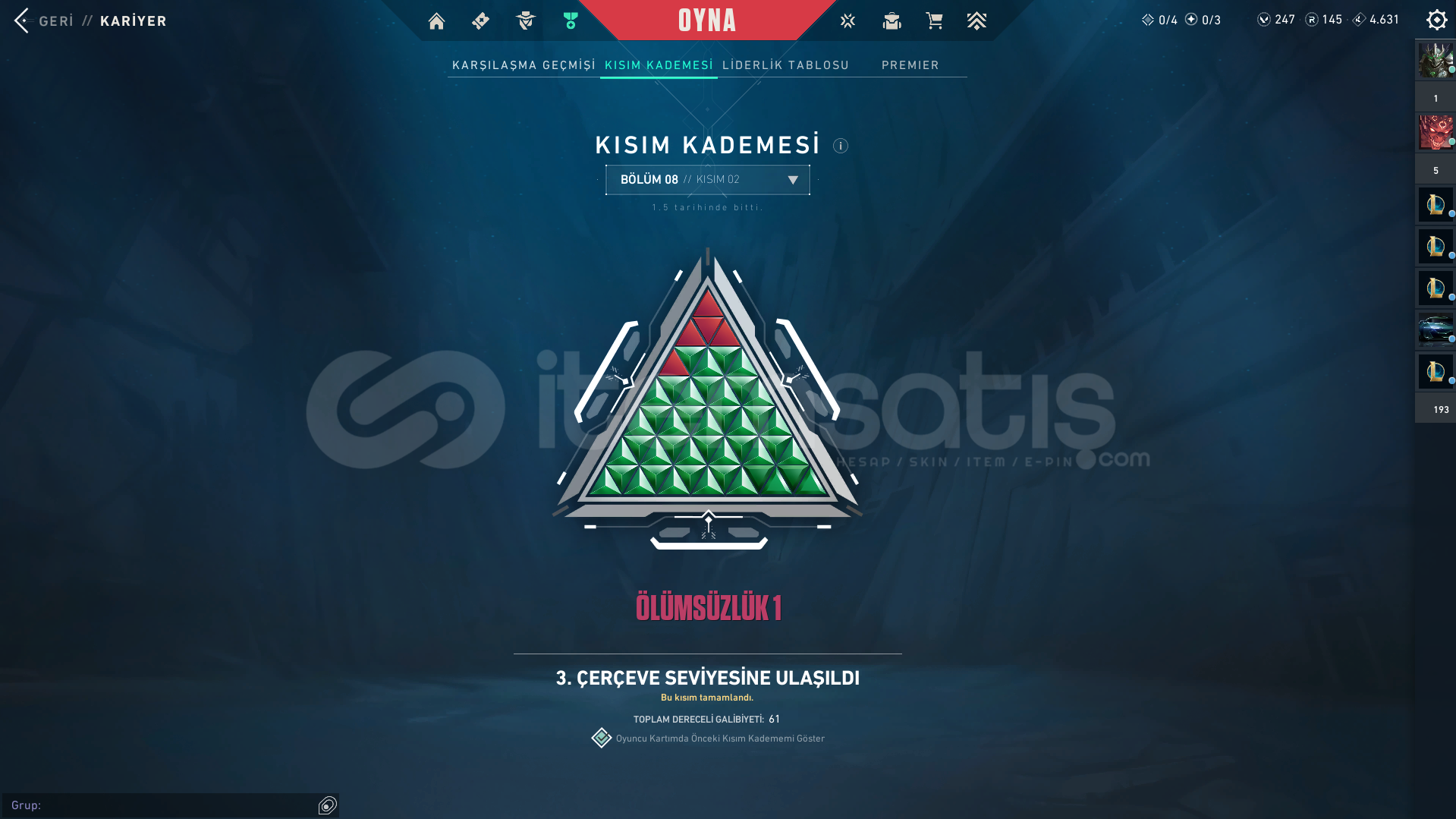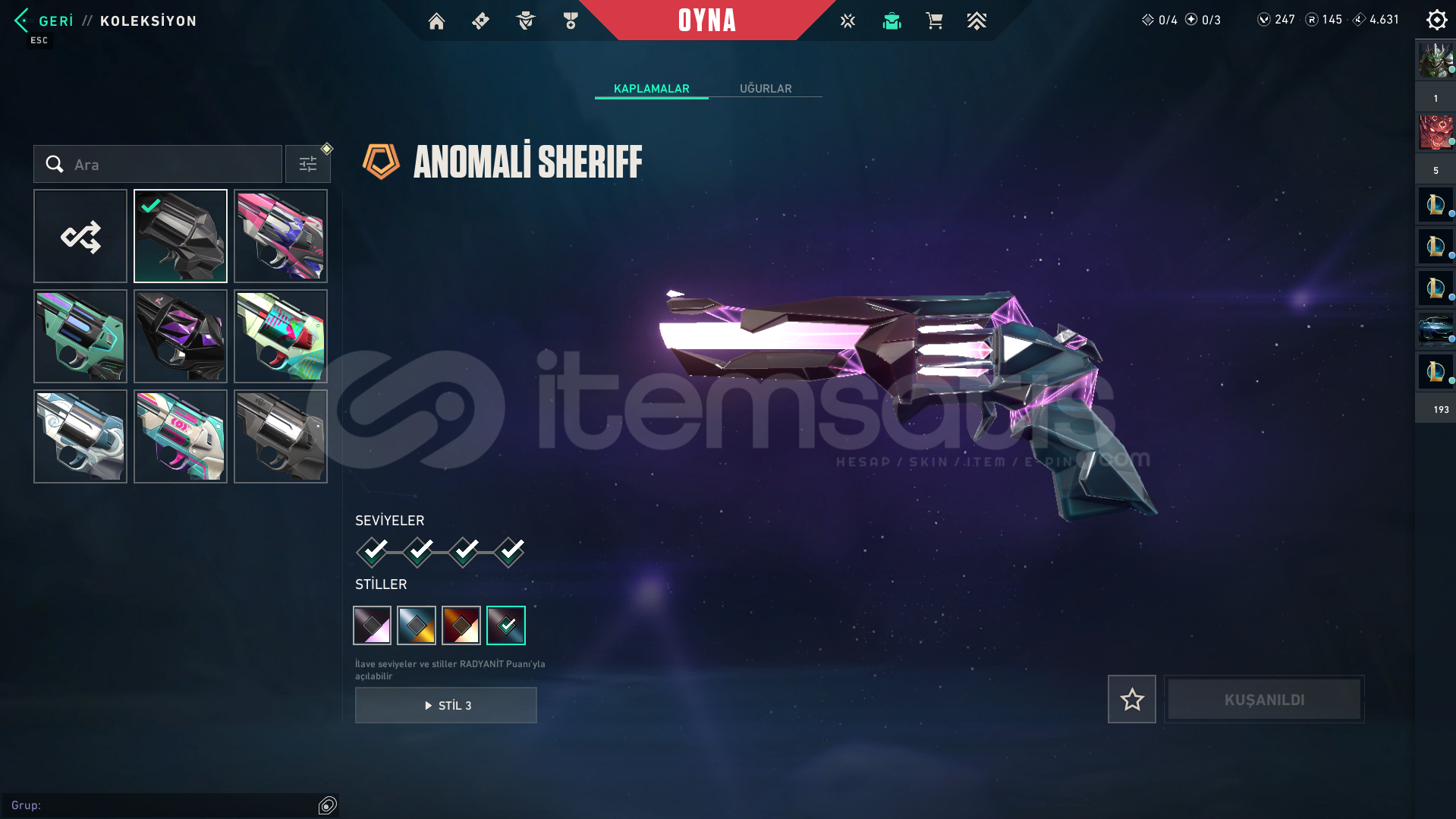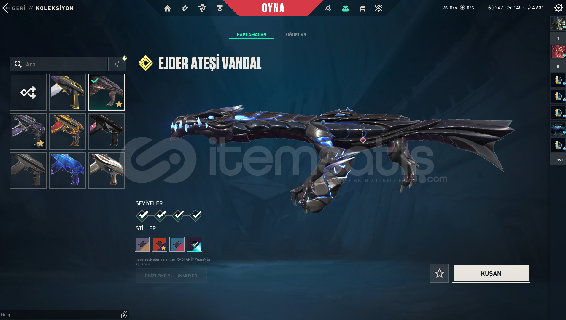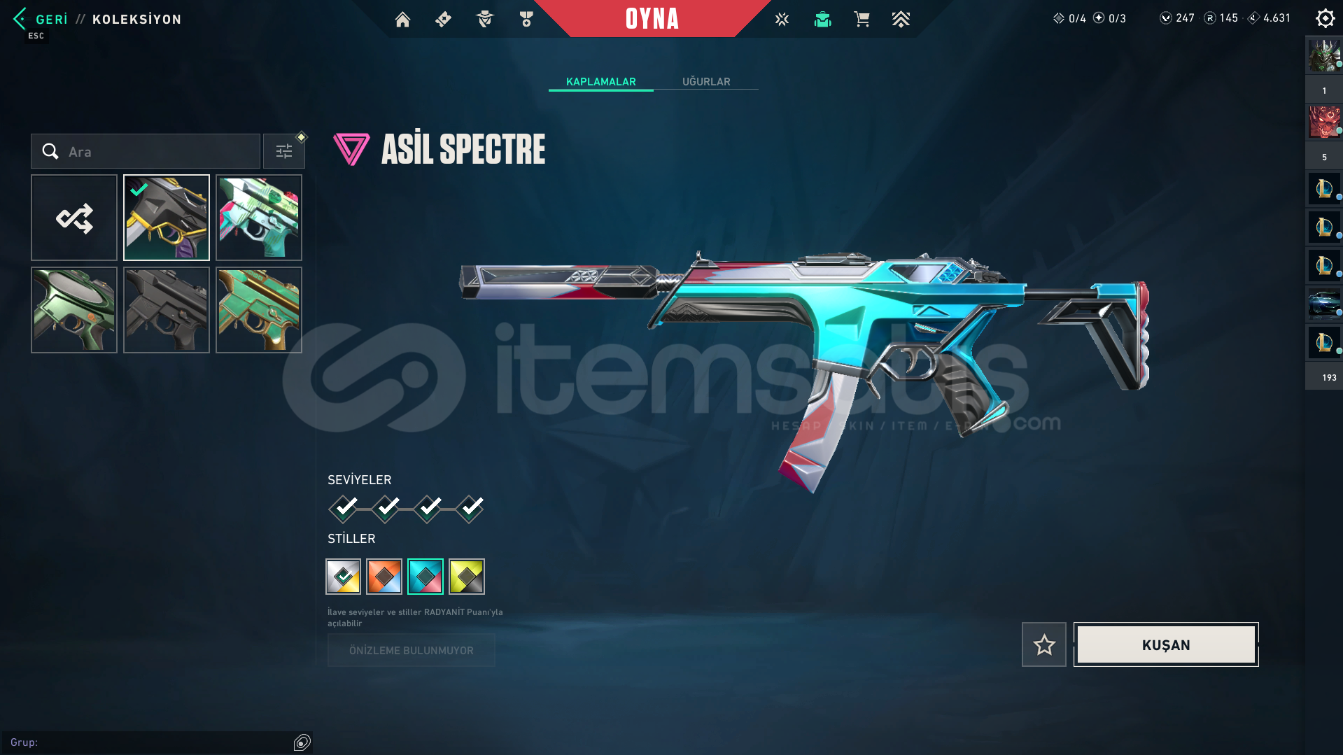 VALORANT5 BATTLEPASSclassic: Asil shorty: Bp frenzy: Bp ghost: Fatih sheriff: Anomali stinger: Bp spectre: Asil bucky: Bp judge: Bp bulldog: Bp guardian: Bp phantom: İon,Blastx,Asil,Prizma vandal: Ejder,Yağmacı,Asil marshall: Bp operator: Ejder,Sarmal ares: Bp odin: Bp BIÇAK: Delipop,Yağmacı,Asil karambitLOLLEVEL: 207SKİN: 642 ihtişamlı, 11 efsanevi, 27 destansı, 16 hatıraRANK YOK