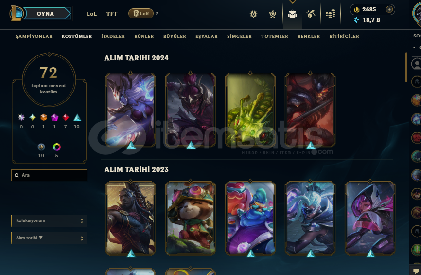 Hesabı artık eskisi kadar oyun oynamadığım için satıyorum. Valorant, lol ve tft alanlarında kostüm ve skinler mevcuttur. 1 kez mail değişimi yapılmıştır. Direkt mail devirli şekilde satım yapılacaktır. Hesabın geri alınması gibi bir durum söz konusu değildir. Valorant kısmında son gelen 5-6 ajan açık değildir oyunu bırakmadan önce diamond-...