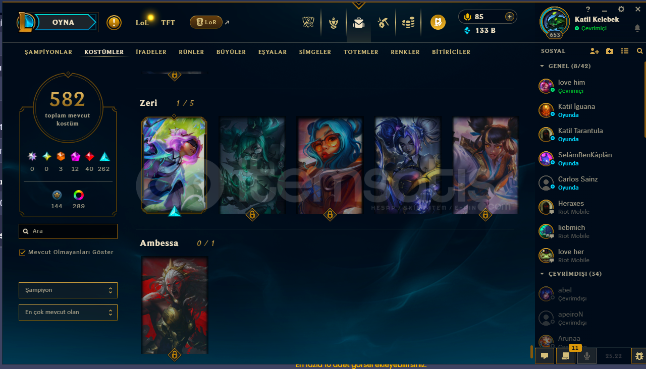 lol tarafında 582 adet köstüm bulunmakta detayalr buraya sığmadığı için göstermeyi tercih ettim