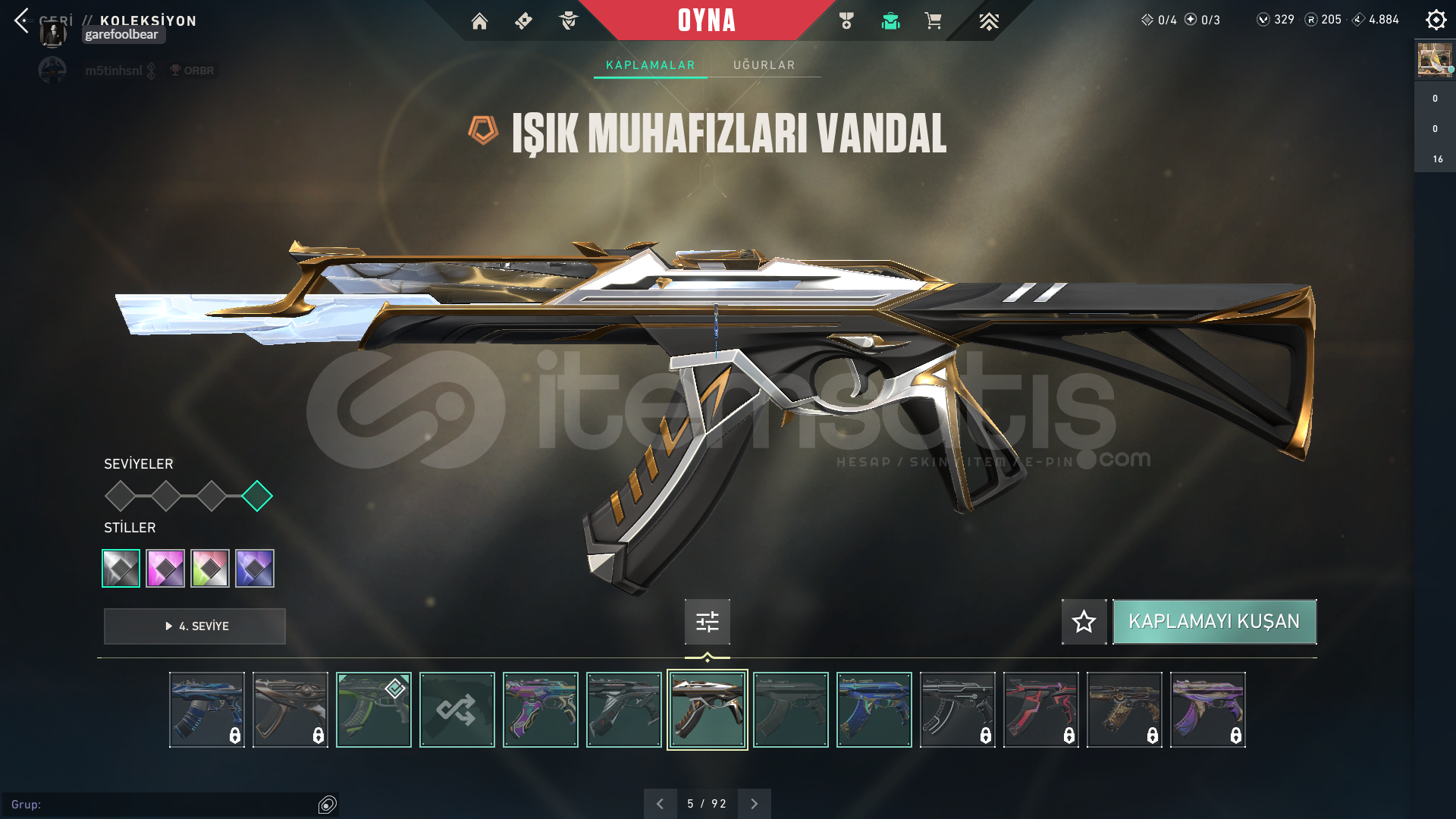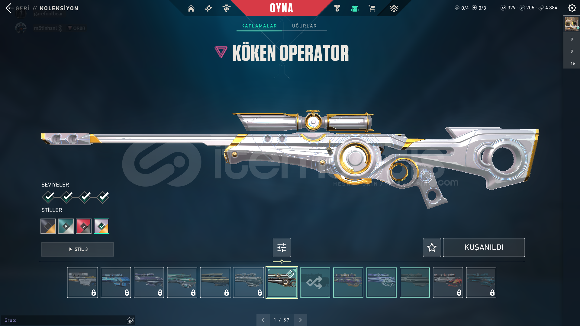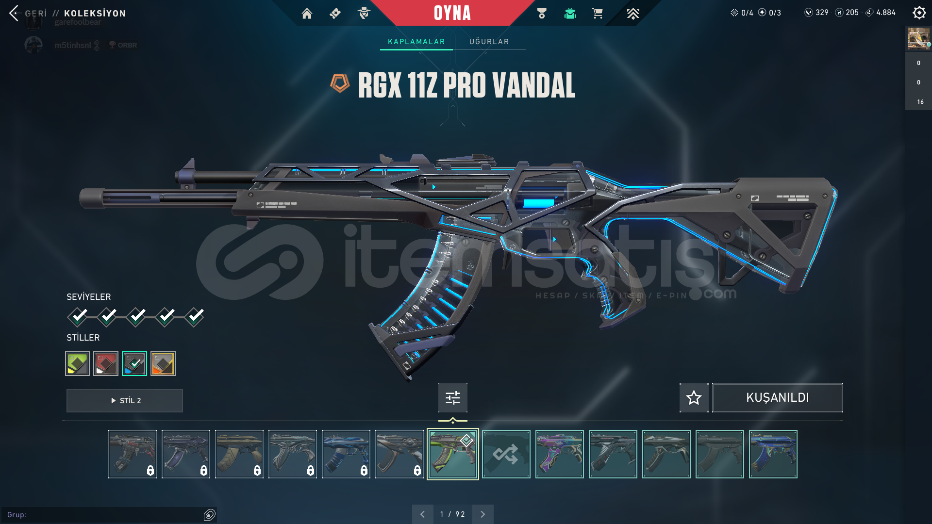 VALORANT HESAP TRRANK PLAT 100 LEVEL üstü hesapHesapta 329 vp var 2 battlepass satın alındıIşık muhafızları vandal , rgx pro vandal , delipop vandalköken operatörözel harekat phantom , oni phantomuzay geçidi bıçağı , rgx pro kelebek. En önemli skinler bunlardır her silaha skin var zaten mail ile teslim edilir . Belirtmediğim,sormak istediğiniz bişey varsa sorabilirsiniz.