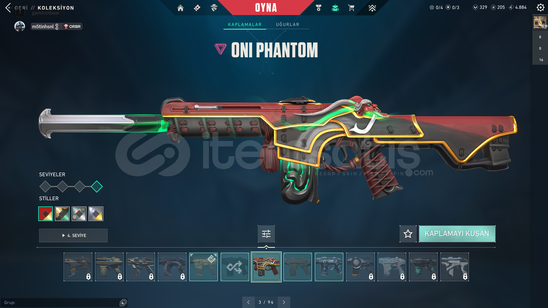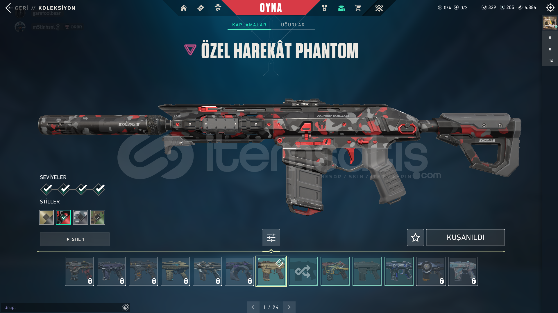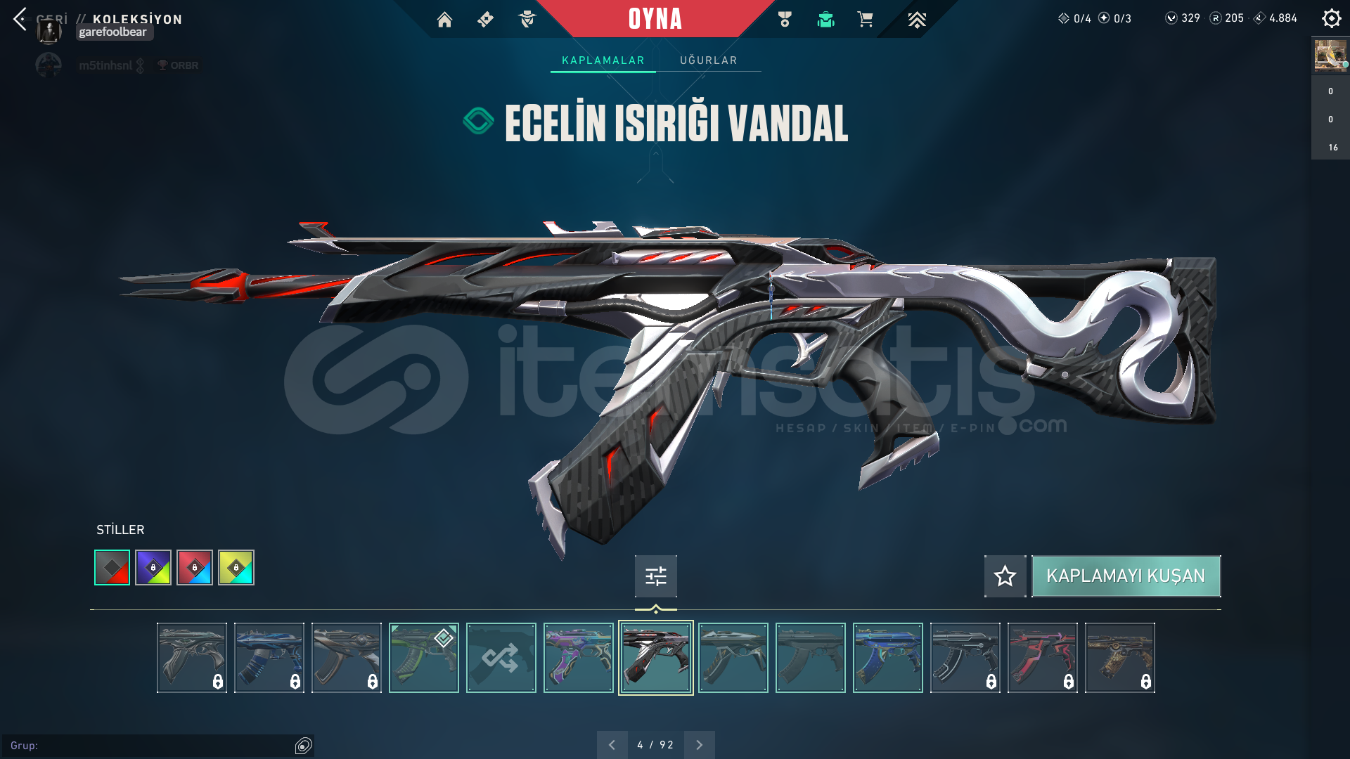 VALORANT HESAP TRRANK PLAT 100 LEVEL üstü hesapHesapta 329 vp var 2 battlepass satın alındıIşık muhafızları vandal , rgx pro vandal , delipop vandalköken operatörözel harekat phantom , oni phantomuzay geçidi bıçağı , rgx pro kelebek. En önemli skinler bunlardır her silaha skin var zaten mail ile teslim edilir . Belirtmediğim,sormak istediğiniz bişey varsa sorabilirsiniz.