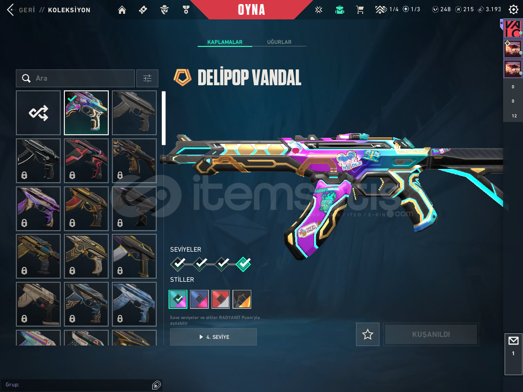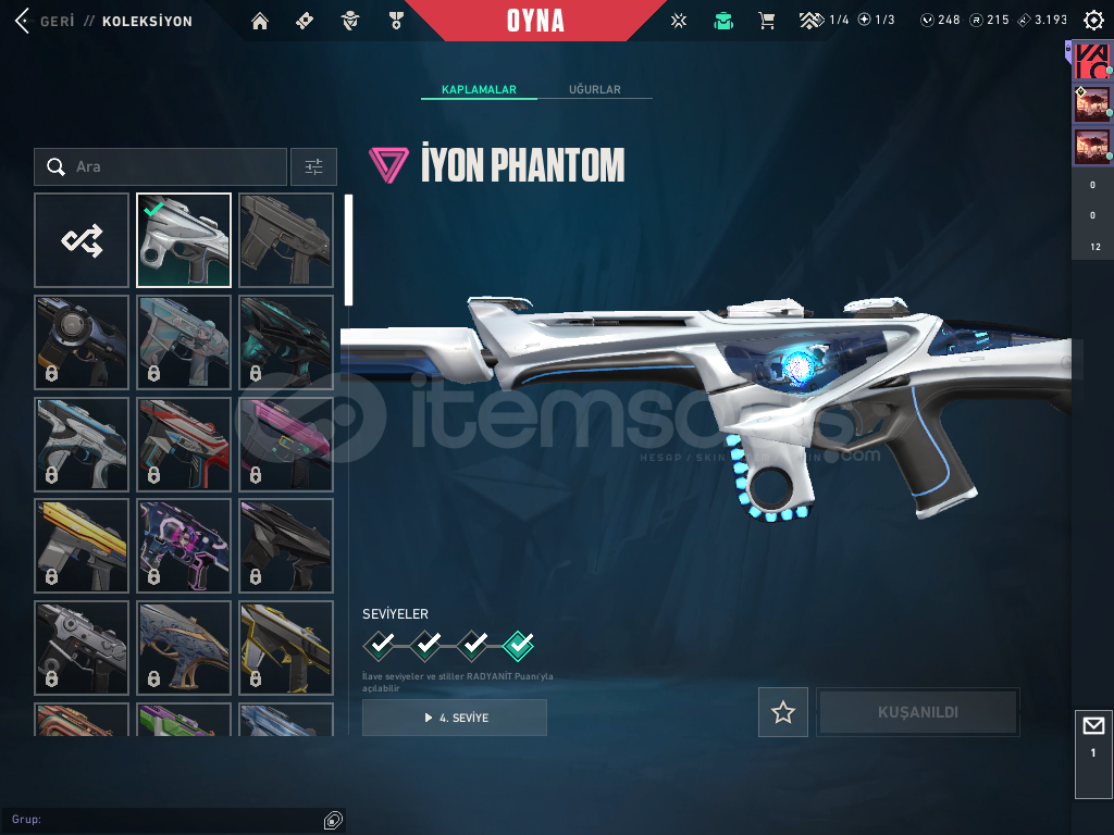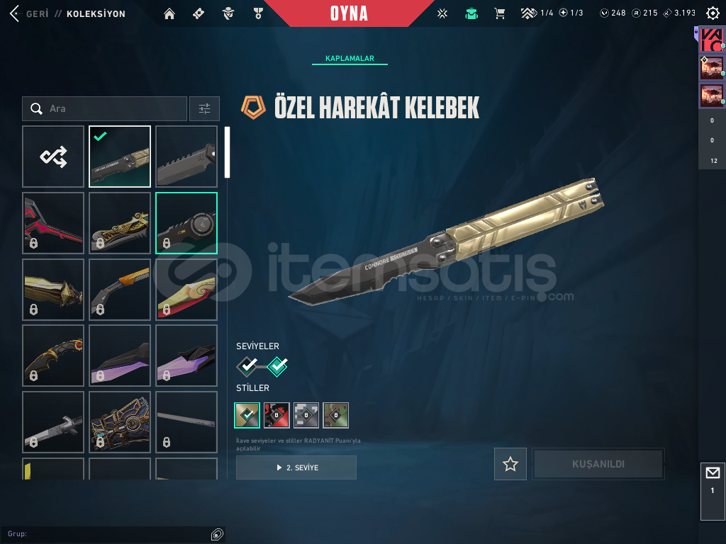 Hesabın içinde özel harekat kelebek , iyon phantom , delipop vandal , asil 2.0 Bucky mevcuttur. hesap 76 level sadece 3 karakter açık değil diğer herşeyi full !