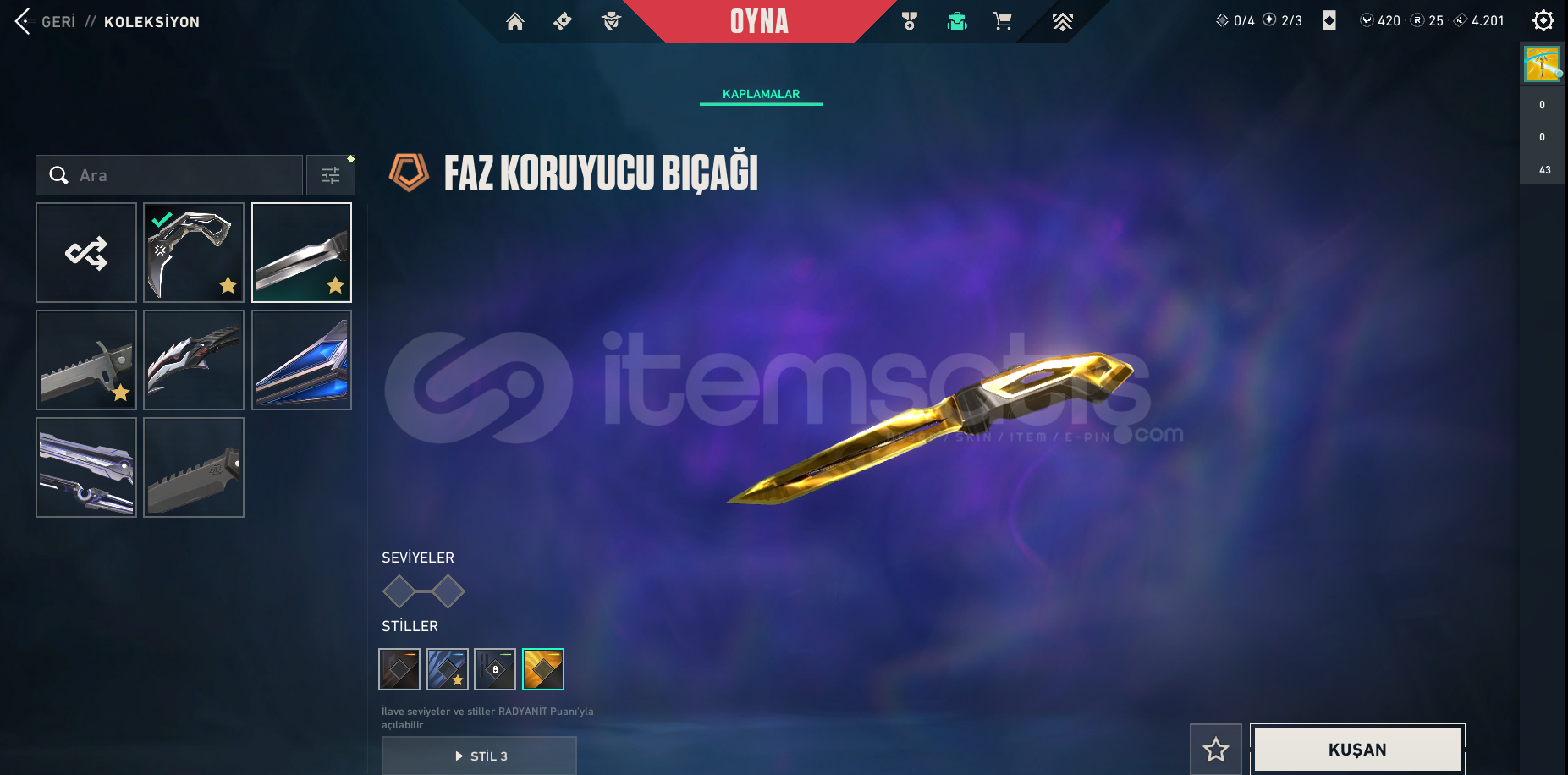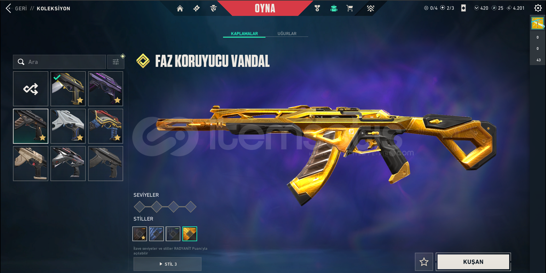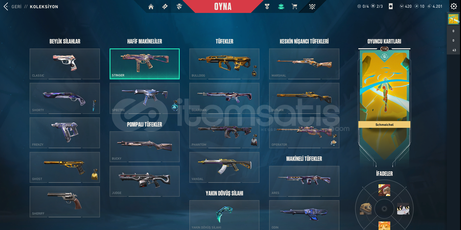 Valorant mainlemelik hesapFaz koruyucu vandalFaz koruyucu bıçakFaz koruyucu bulldogFaz koruyucu outlawFaz koruyucu ghostAnomali ghostSeri Tetik sheriffAsil vandalİyon vandalOni vandalExo vandalZifiri phantomVCT KarambitUzaylı avcısıve ek olarak 2 battle pass fullenmiştir