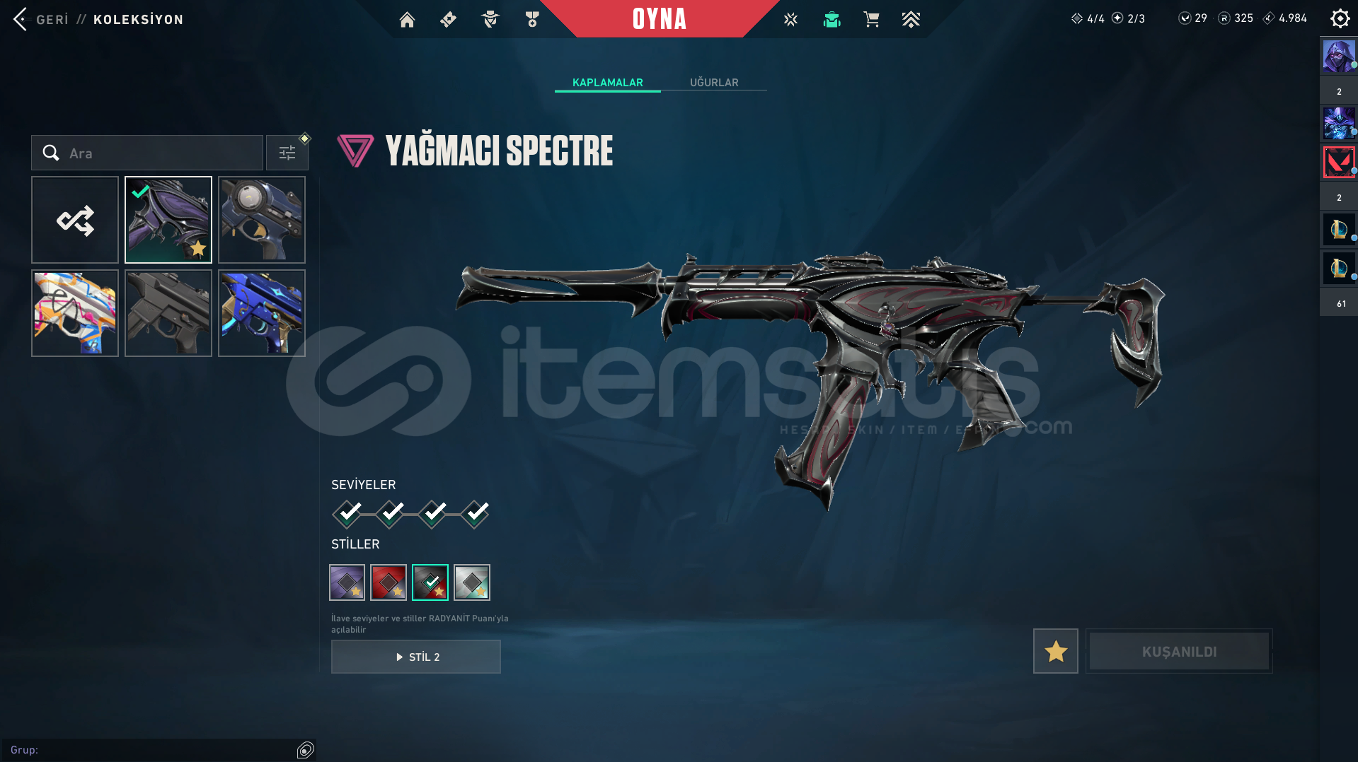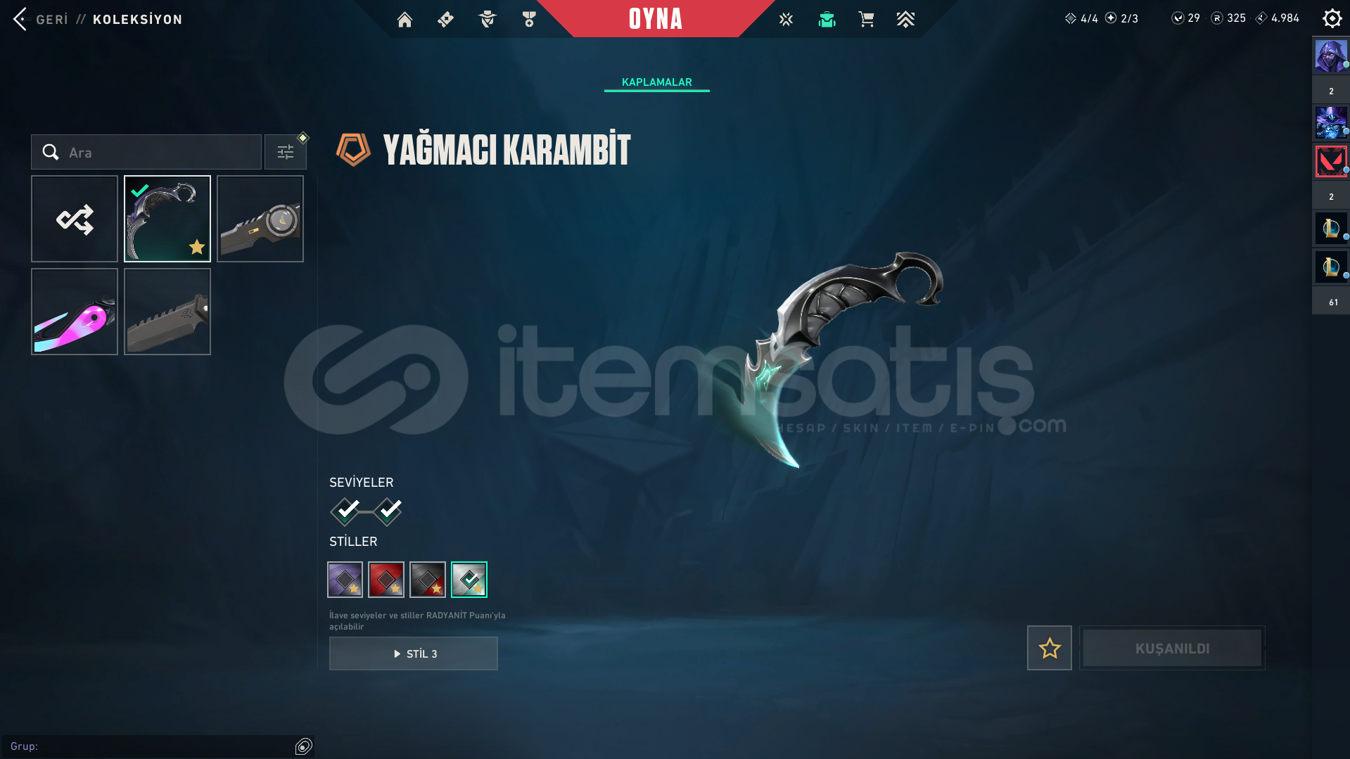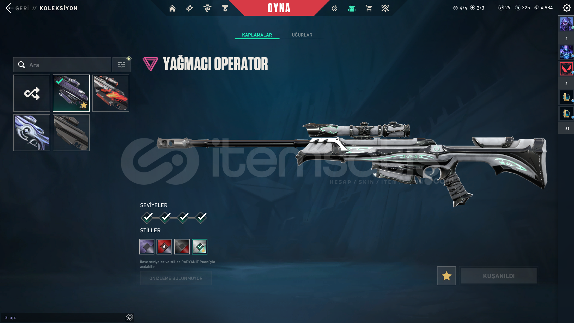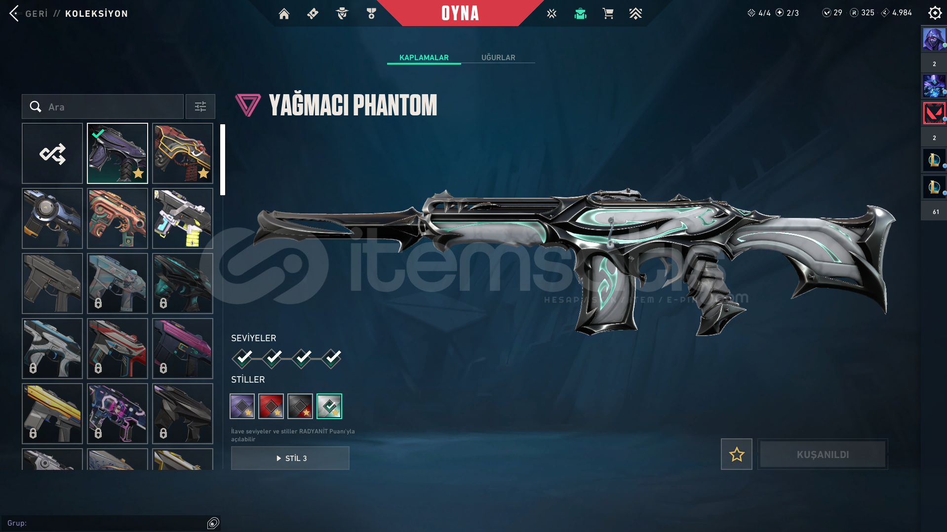 YAĞMACI OP,ODİN,SPECTRE,GHOST,PHANTOM VE YAĞMACI KARAMBİT BULUNMAKTADIR (TÜM SKİNLER FULLENMİŞTİR HER RENKLERİ AÇIK VE 4 LVL DİR.)
