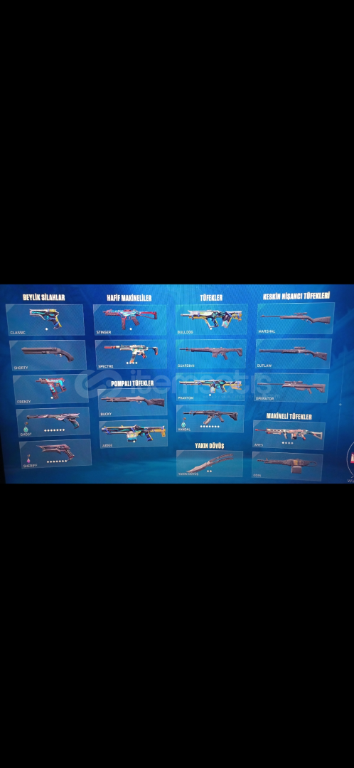 Hesap şuan gold.Butun skinler tam yükseltilmiştir ve bütün renkleri açıktır Kuronomi Sherif Yağmacı vandal Fatih ghost Kelebek