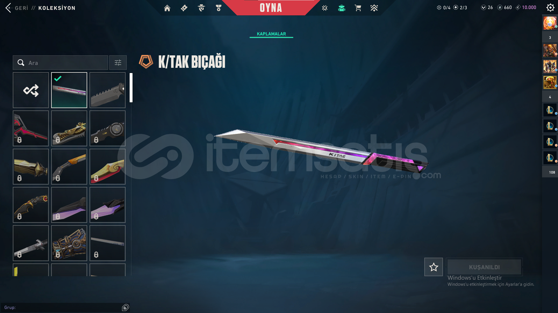k/tak bıçak vardır 1 kere battle pass açılmıştır gmail üzerinize verilecektir aciliyetten satılıktır