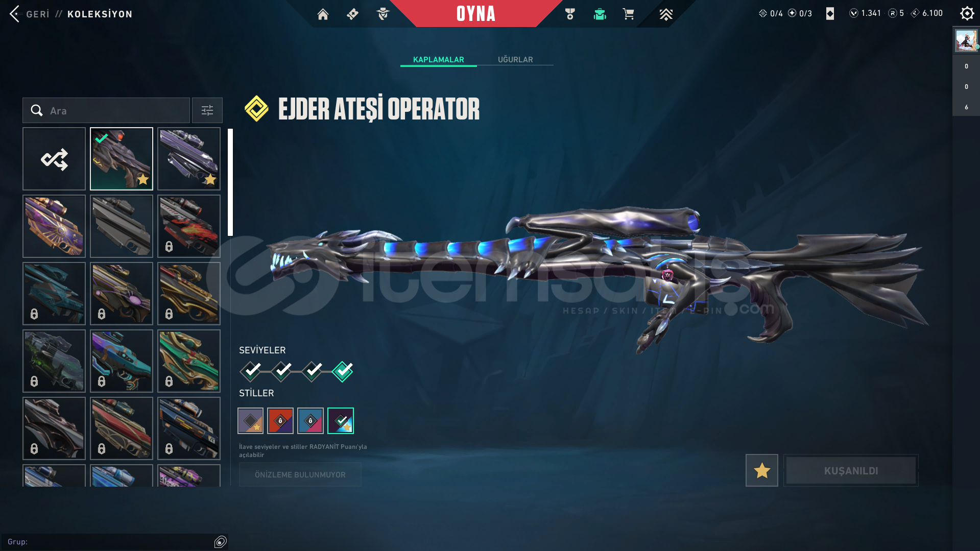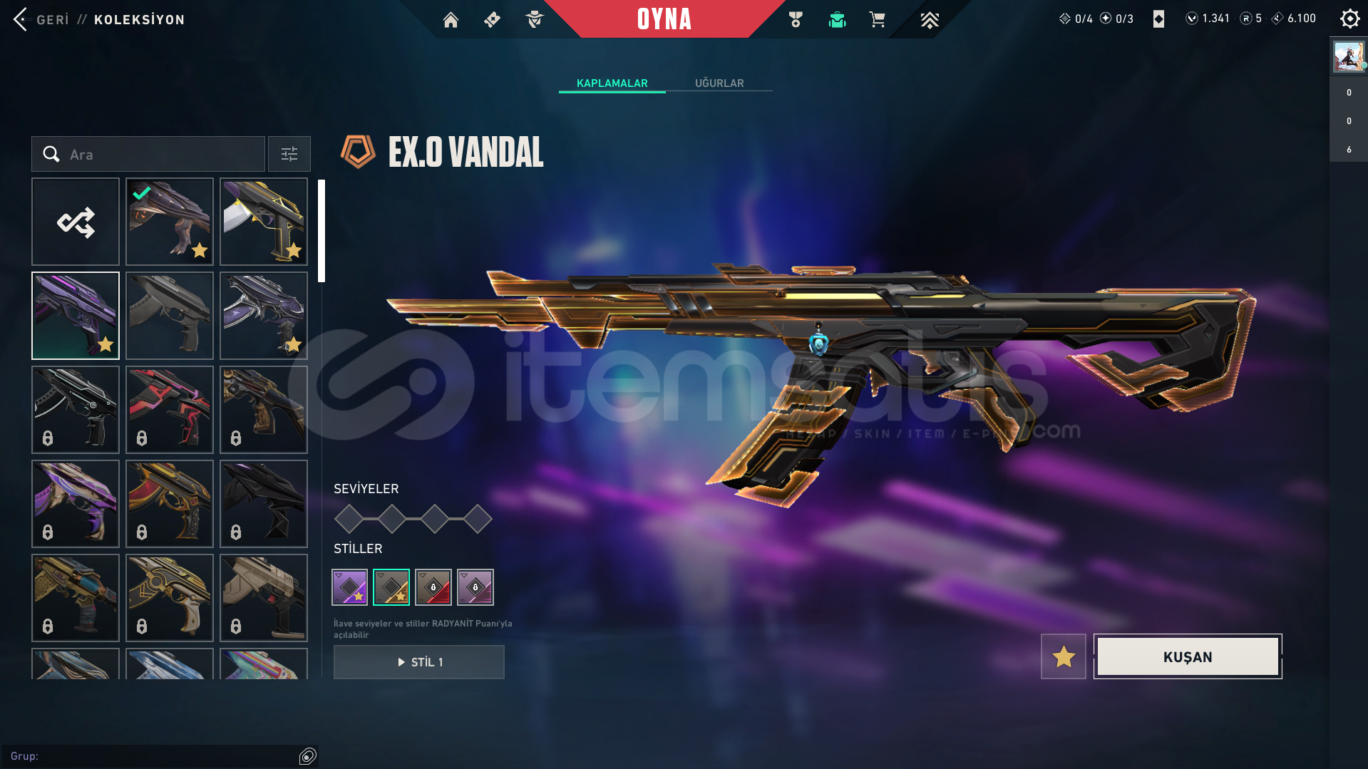CLASSIC:ASİLIŞIKKIRANFRENZY: ASİLGHOST: YAĞMACIGÜN TUTULMASISHERIFF:YAĞMACIEX.0ANOMALİSPECTRE:EX.0GÜN TUTULMASIGUARDIAN:YAĞMACIPHANTOM:YAĞMACIVANDAL:YAĞMACIASİLEJDER ATEŞİEX.0BIÇAK: SERİ BALTAEX.0VCT 2025 KARAMBİTZİFİRİ TIRPANKARABORSA KELEBEKOUTLAW:EX.0OPERATOR:YAĞMACIEJDER ATEŞİGÜN TUTULMASI-- YÜKSELTİLEBİLİR SKİNLERİN SEVİYESİ YÜ...
