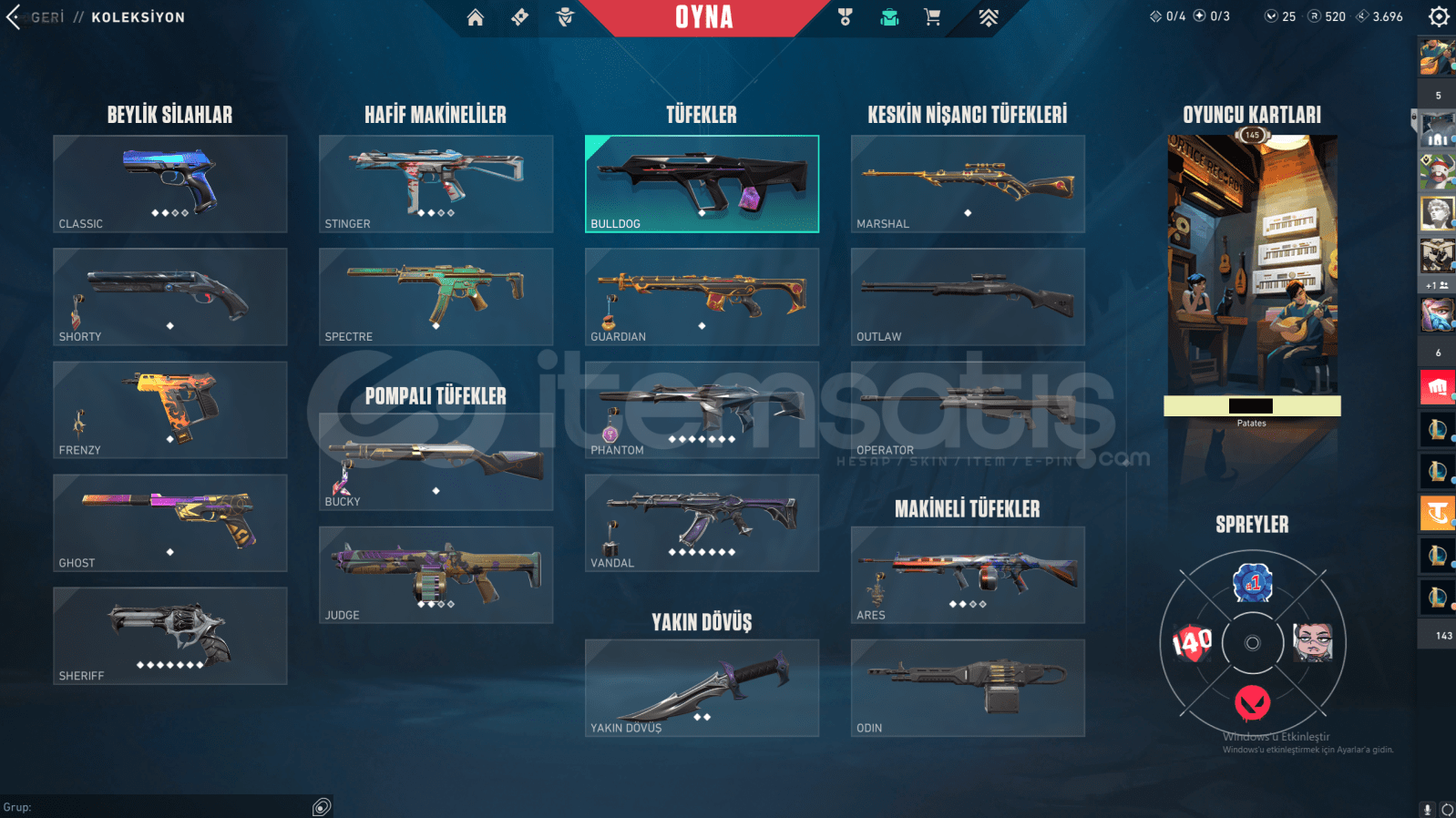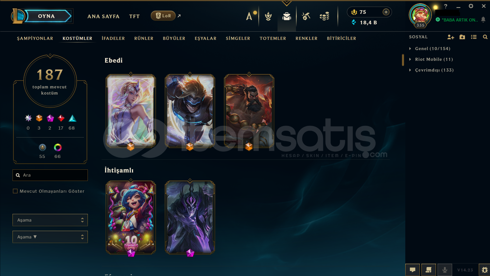 ----VALORANT-----Hesap 145 Leveldir. Maks diamond 2yi görmüştür. Son 1 yıldır hiç oynanmadı yani Unranked. Hiç bir ceza ban geçmişi yok. İlk sahibiyim.-Yağmacı Sheriff-Yağmacı vandal-Anomali Phantom-Yağmacı Bıçak-Altın Afet Hançer-Diğer skinler görselde mevcut.----League of Legends-----187 adet kostüm, 69 adet renk, 38 totem, 307 simge, 132 ifade ve bütü...