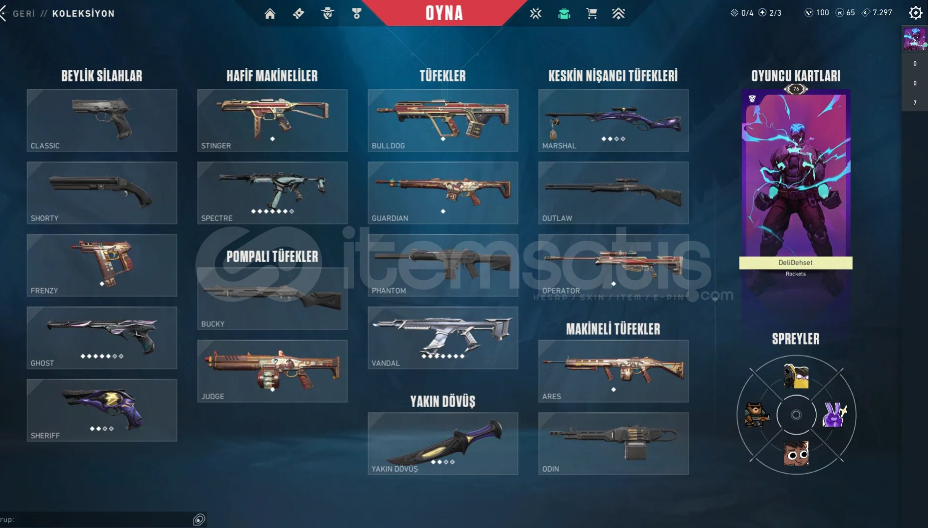 Hesapta az ama öz, genelde kullanılan silahlarda skin vardır.-RANK'I GOLD 3 AMA PLAT 2 YE KADAR ÇIKMIŞTIR-HESAP 76 SEVİYEDİR-KURONAMİ VANDAL-KAOSUN BAŞLANGICI VANDAL-YAĞMACI SPECTRE-FATİH GHOSTVE EN GÜZEL BIÇAĞA SAHİP BATTLEPASS VARDIR KUM FIRTINASI BATTLEPASS