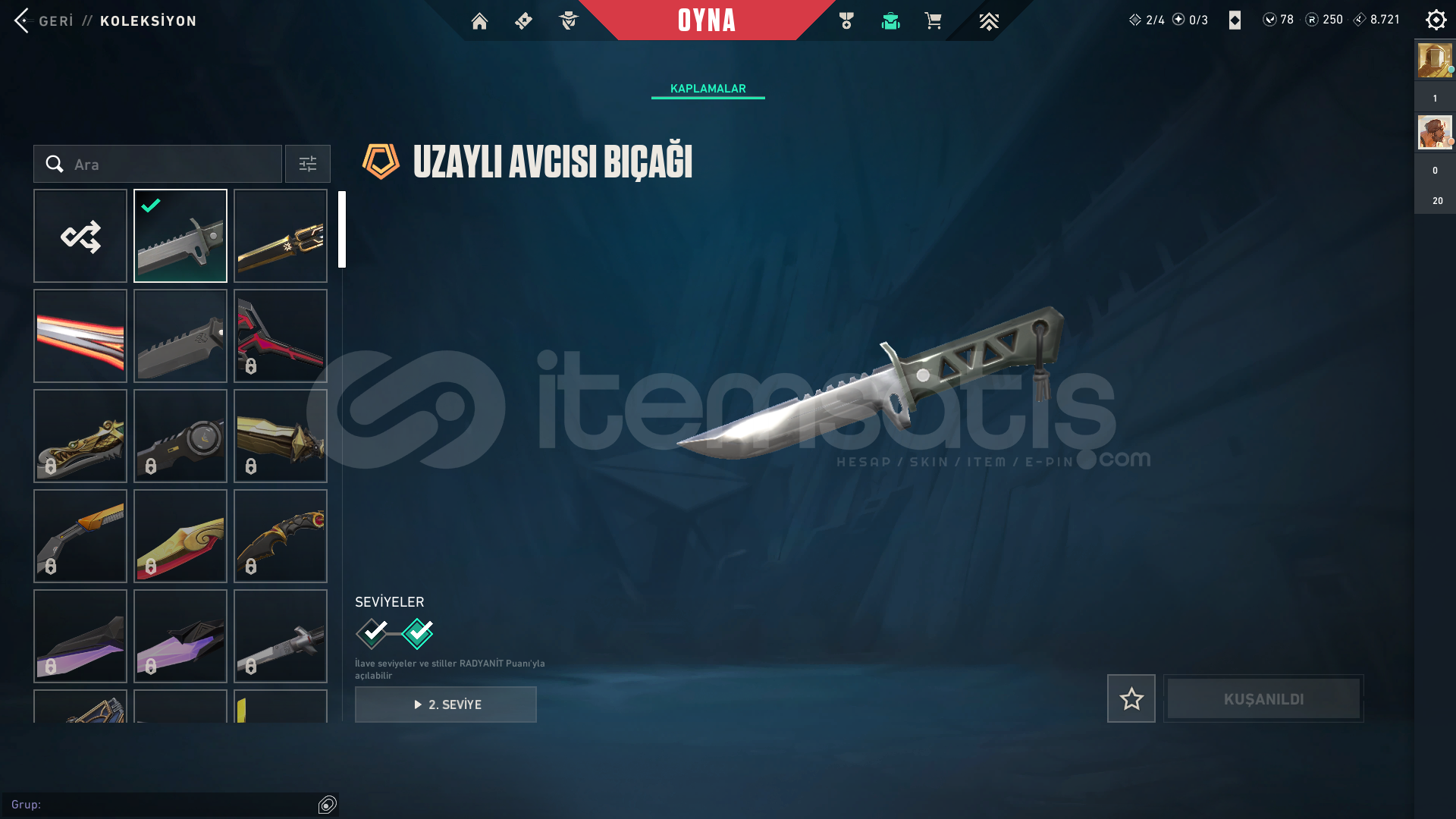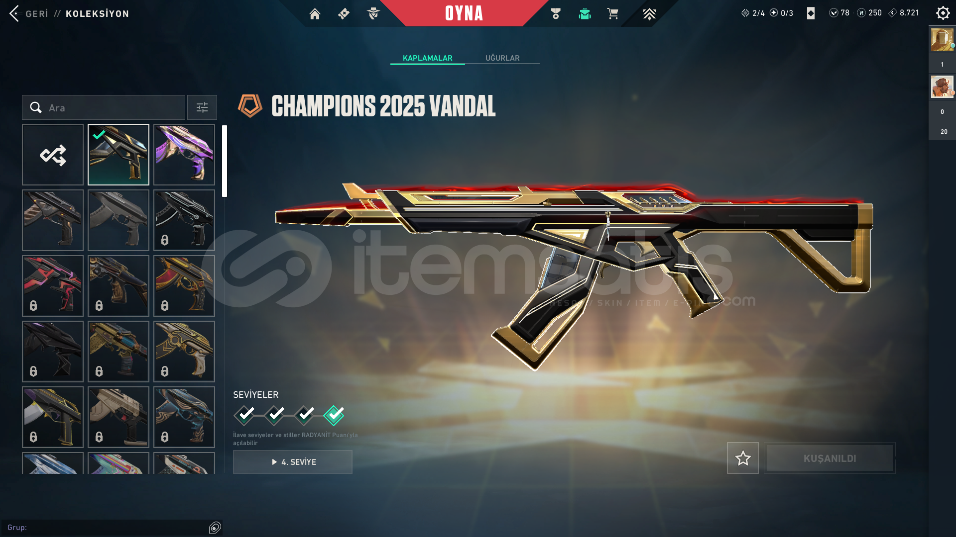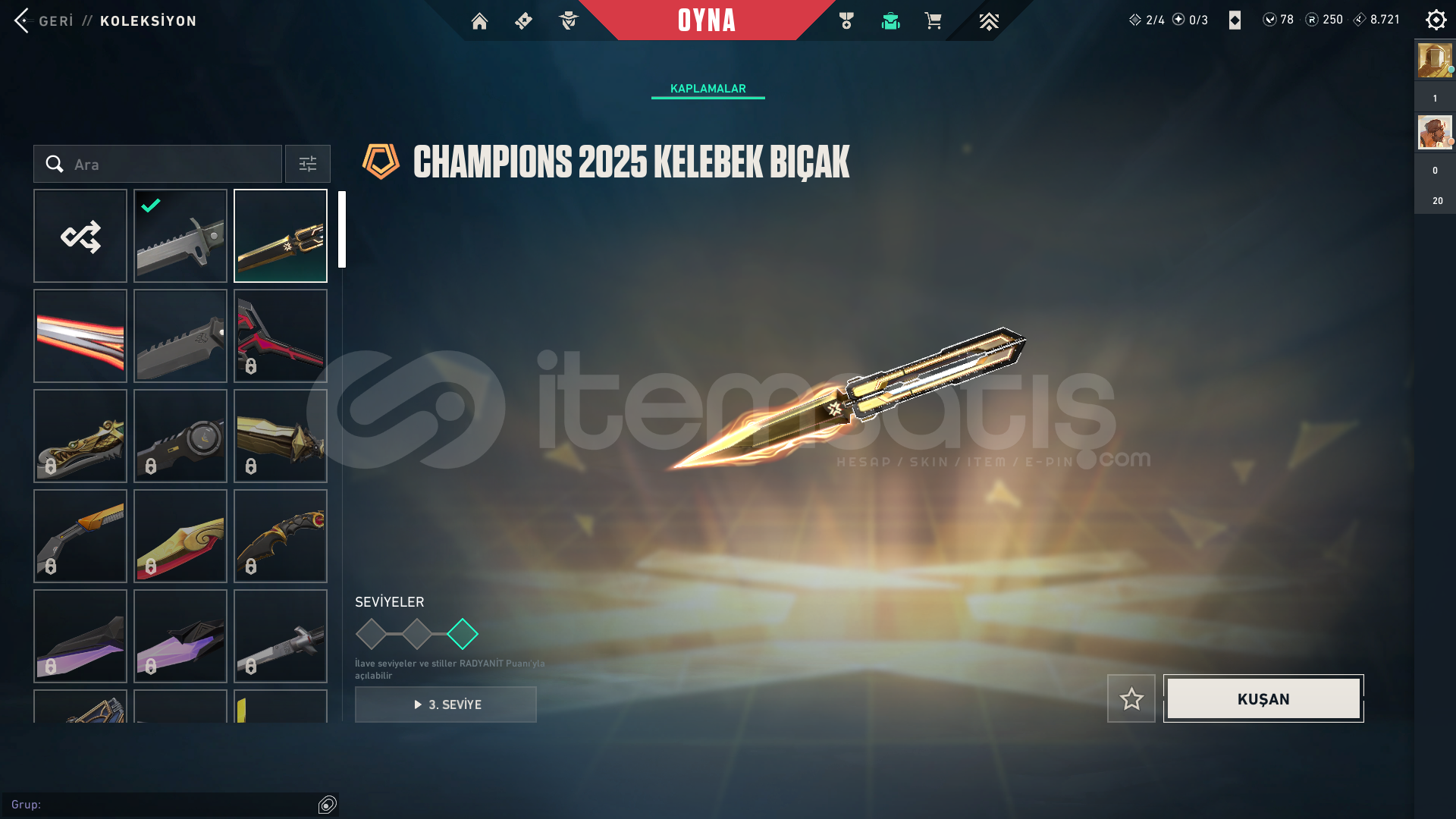 CHAMPİONS 2025 SETİ MEVCUTTURFAZ KORUYUCU VANDAL CHAMPİONS 2025 VANDAL CHAMPİONS 2025 KELEBEKUZAZYLI AVCISI BIÇAKAFET GHOST1 TANE BP BULUNAMAKTASİLAHLARIN HEPSİ FULL SEVİYEDİRPEAK PLAT 1 MAİN RANK GOLD 1