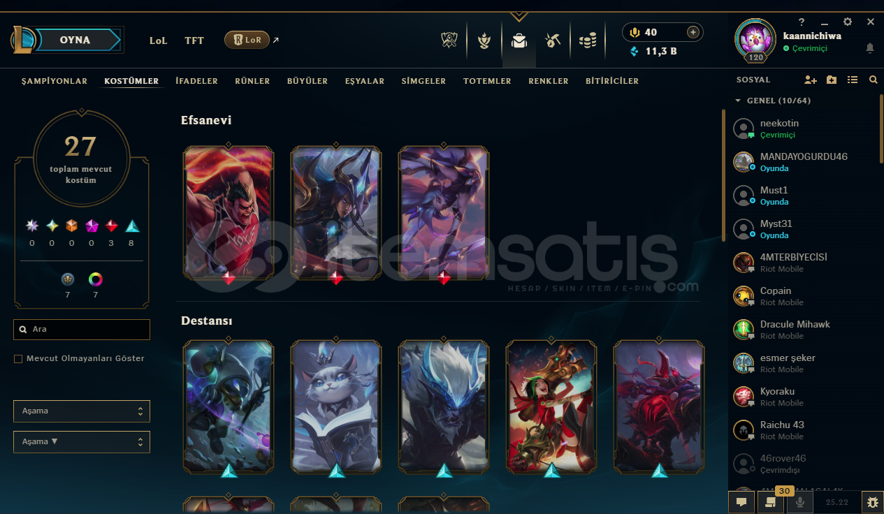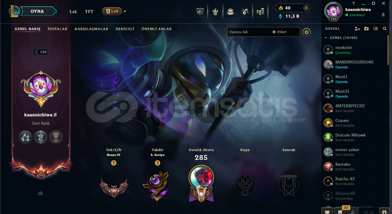 LOL HESABINDA 120 LEVEL 151 KARAKTER 3 EFSANEVİ SKİN 8 DESTENASI SKİN 7 TANE HATIRA SKİN VARDIR TOPLAM 27 TANE SKİN VARDIR HESAP BRONZ 4 RANKTADIR BU SEZON 134 WİN 138 LOSE VARDIR İSTEYENE HESABIN VİDEOSU ATILIR HESAP İSMİ KAANNİCHİWA#4646