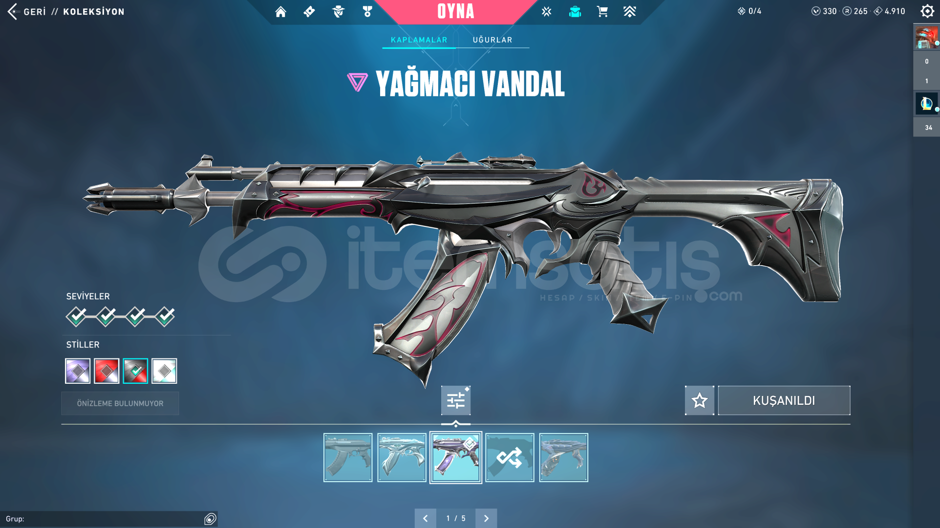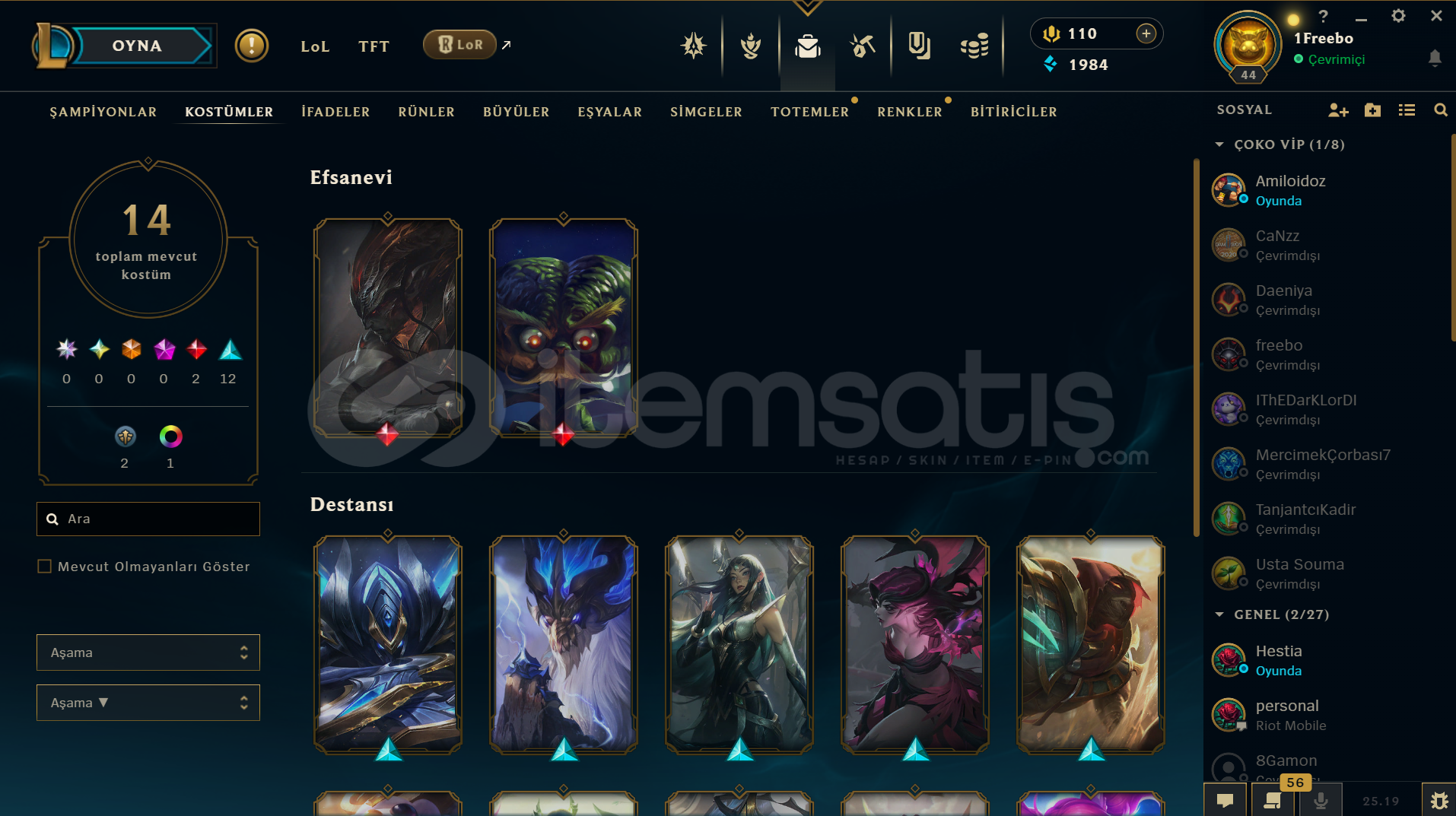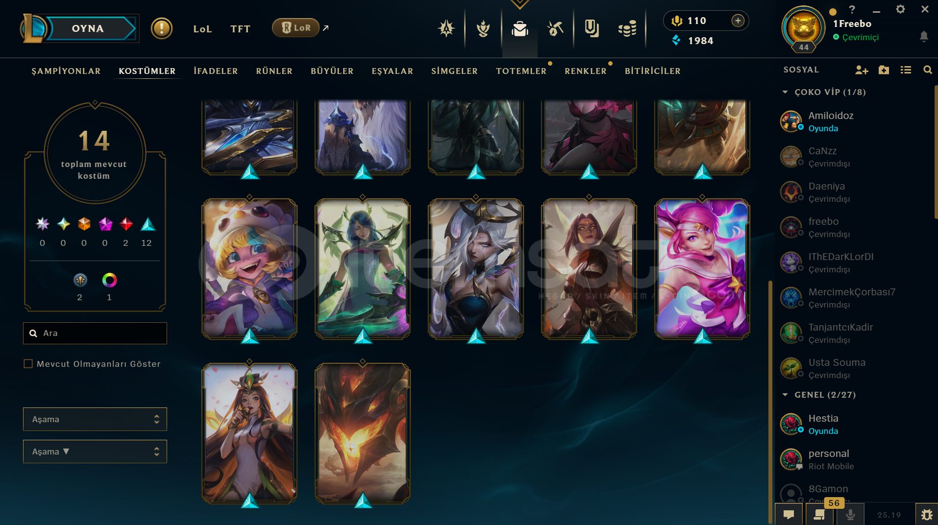 TÜM KARAKTERLER AÇIKVALORANT:330VP-264RP-4910KP VARGÜMÜŞ 1 ELOVANDAL: FULL SEVİYE; EJDER ATEŞİ - YAĞMACI - YİTİKPHANTOM: FULL SEVİYE; PROTOKOL 781-ABIÇAK: FULL SEVİYE; ÖZEL HAREKAT KELEBEKHESAP 118 SEVİYE GÜZEL ÇIKARTMALAR VE KOLEKSİYON KARTLARI VARLOL:110RP-1984MÖ3 HEXTECH SANDIĞI1 KOSTÜM KRİSTALİ14 KOSTÜM (2 EFSANEVİ- 12 DESTANSI) (HEP POPÜLER ŞAMP&#...