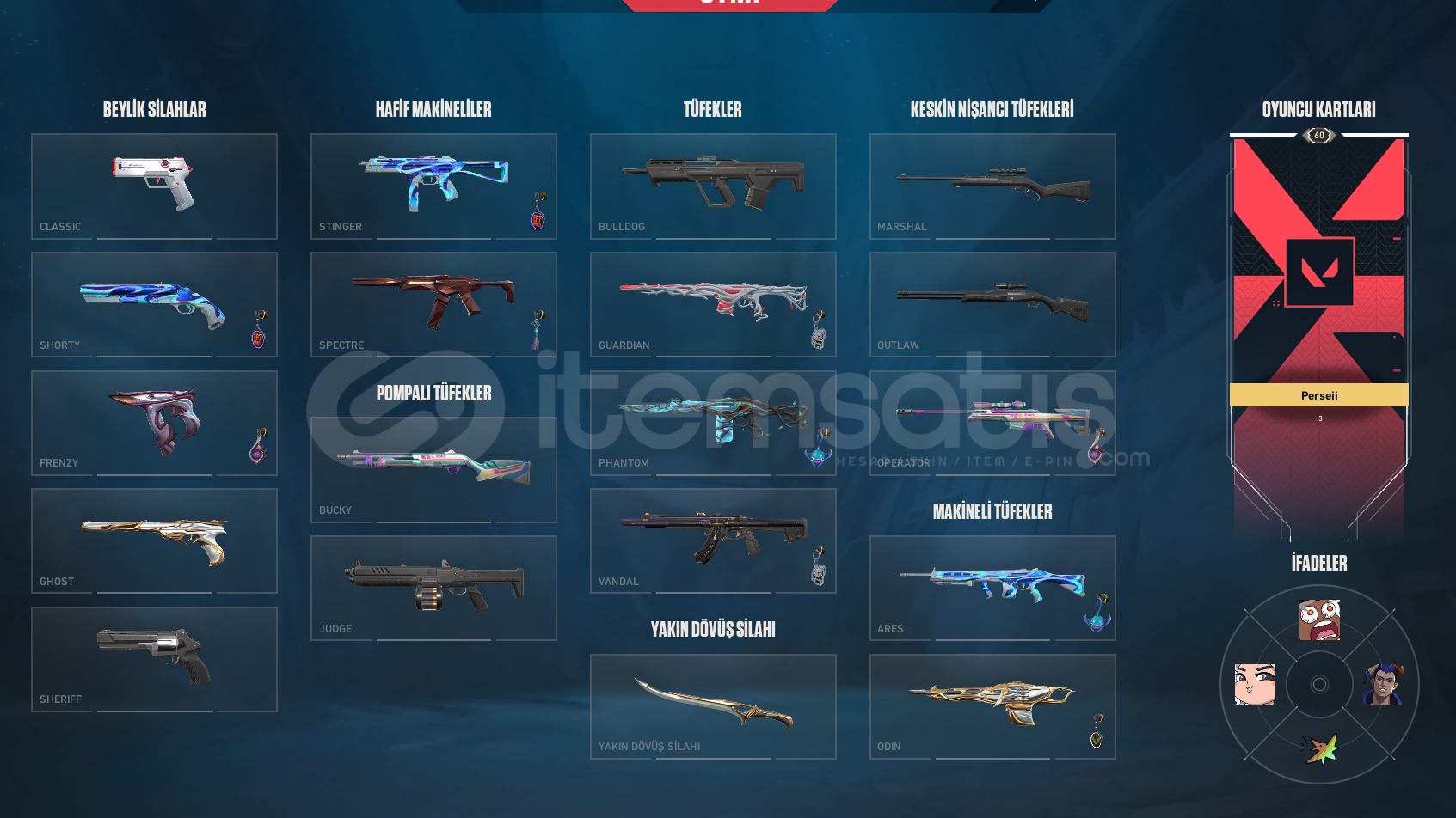 HESAPTA:2 VANDAL(IYON KAOS)1 PHANTOM(GAIA)1 GHOST(FATIH)1 CLASSİC(SPECTRUM)1 ODİN(FATIH)1 SPECTRE(ANOMALI)1 GUARDİAN(GAIA)1 ADET BICAK(FATIH 2.0)BULUNMAKTADIR PEAK GOLD OLUP GUNCEL OLARAK SILVERDIR(MMR YUKSEKTIR.)mail değişimi yapılacak.