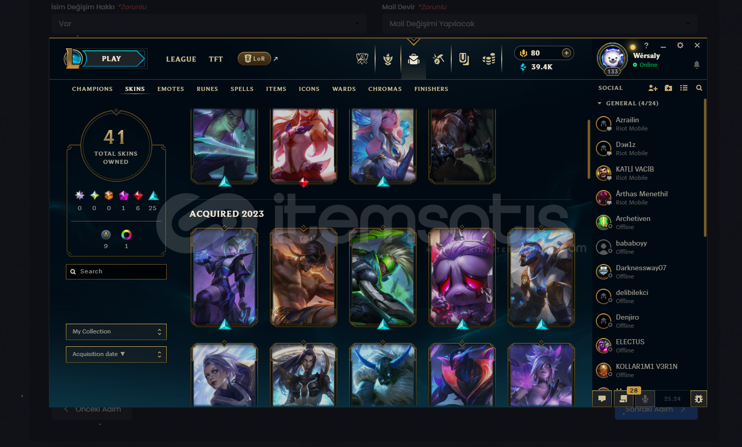 LOL - 133 SEVİYE - 6 EFSANEVİ SKİN - 1 MYTHİC SKİN - 25 DESTANSI SKİN - 9 HATIRA SKİN - 80 RP 40K MAVİ ÖZ BULUNMAKTADIR