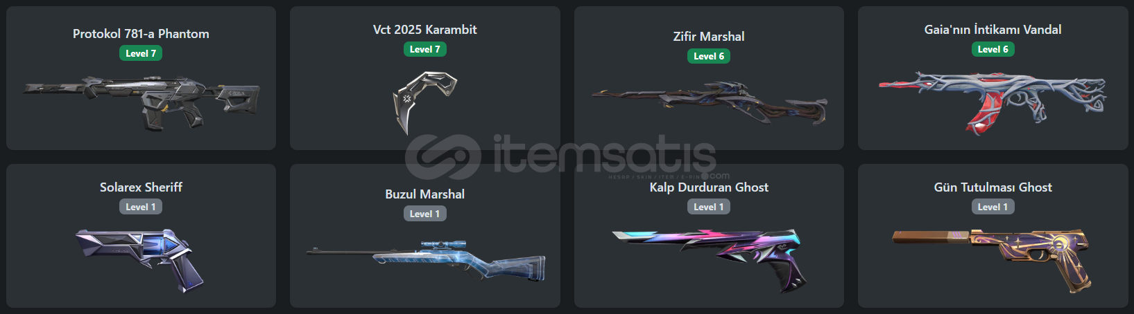 Valorant Hesap DetaylarıProtokol 781-a PhantomLevel 7Vct 2025 KarambitLevel 7Zifir MarshalLevel 6Gaia'nın İntikamı VandalLevel 6LoL Hesap Detayları