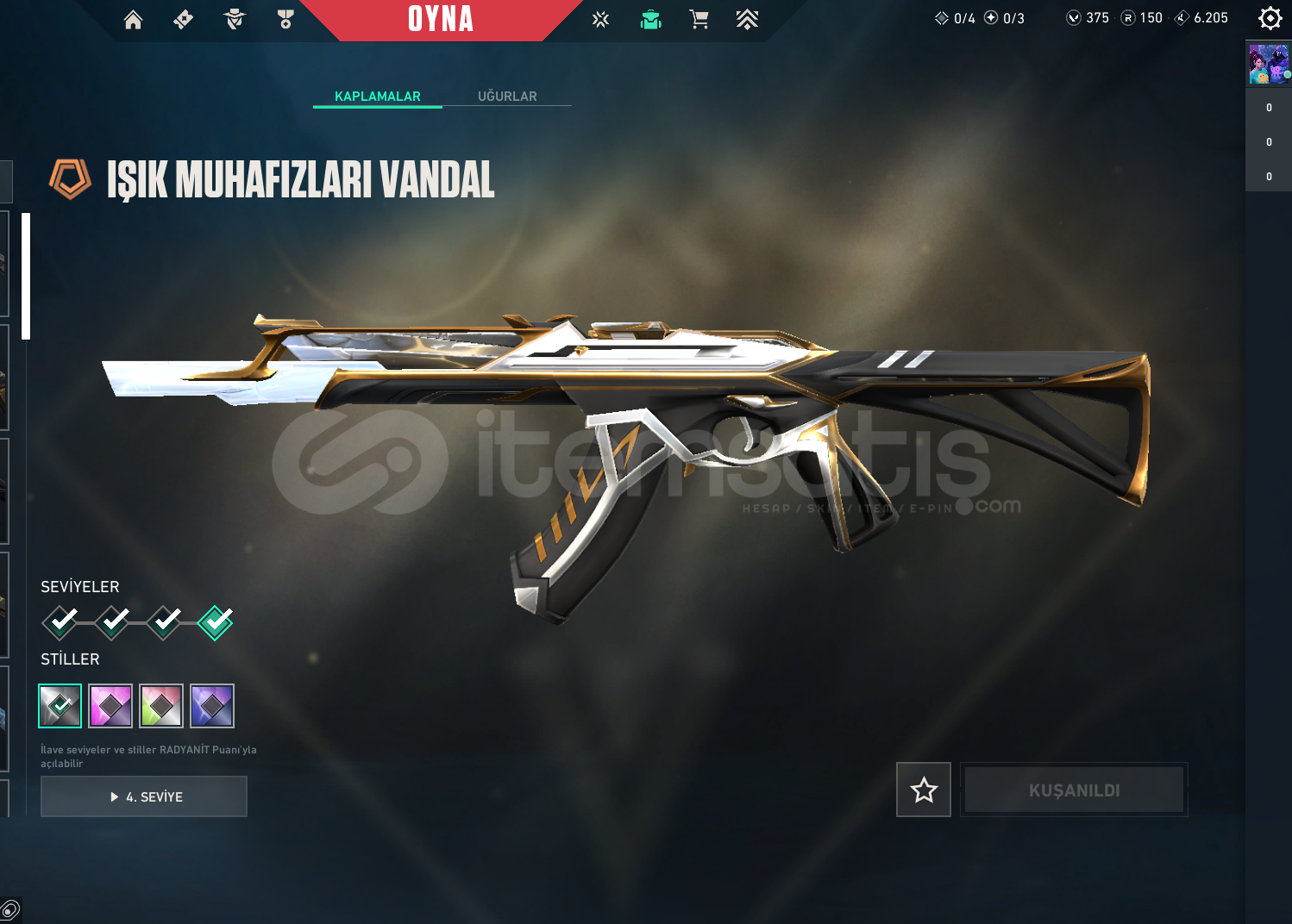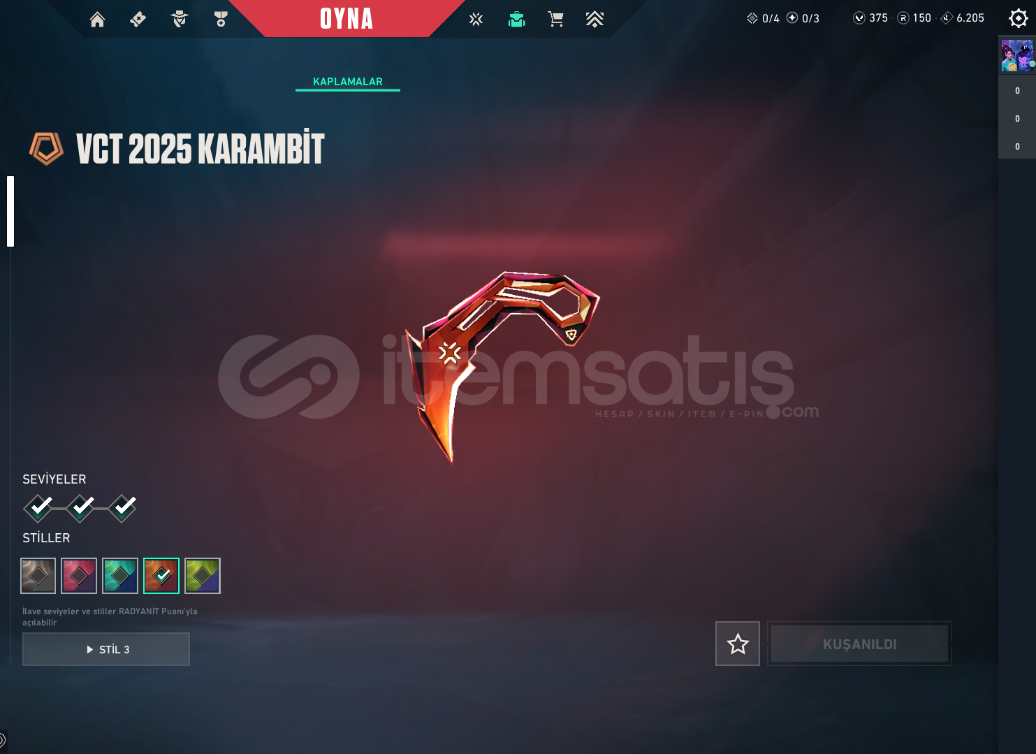 -VCT 2025 KARAMBİT VE SETİ VAR (TÜM RENKLERİ AÇIK)-IŞIK MUHAFIZI VANDAL VAR (TÜM RENKLERİ AÇIK)-375VP VE 150RP VAR-MAX PLAT 3 GÖRDÜ-ŞU AN PLAT 1 HESAP-İSİM DEĞİŞİLEBİLİR-TR SERVERINDADIR