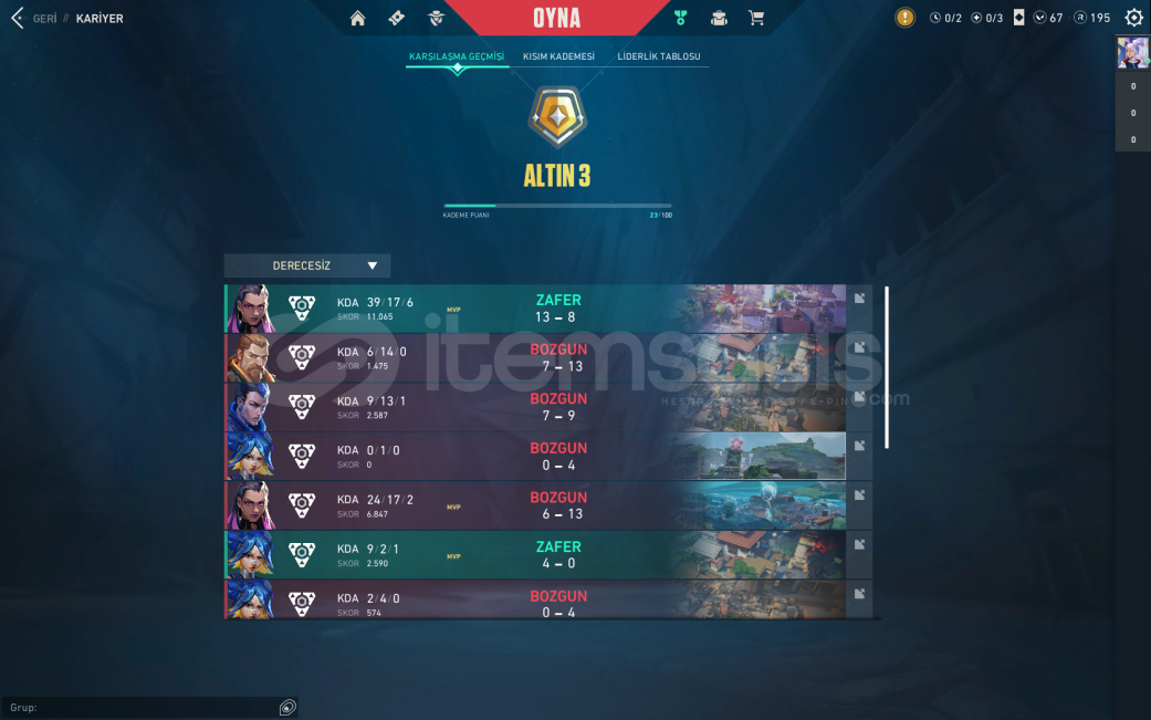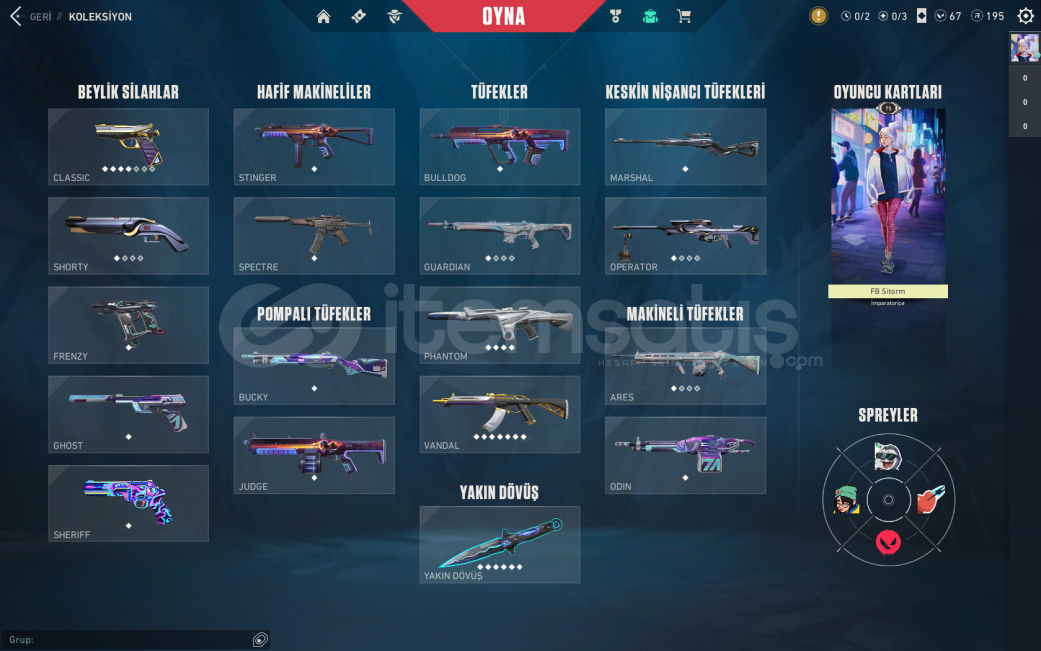 Kurucu Maili ile verilecektir.Hesap karakterleri tamdır mmr yüksektir Gold 3 rankıdır.Skinler:Asil ClassicMuharebe Spectreİon PhantomAsil VandalKaos VandalVCT LOCK IN MERHAMETRGX 11Z Pro Kelebek+ 2 Battle PassGmail sizin gmailinize aktarılacaktır hesap benimdir hiç bir sıkıntı olmayacaktır.